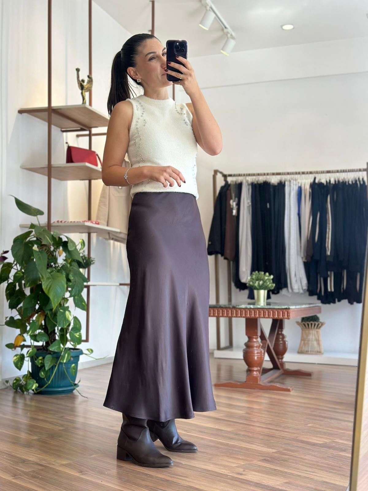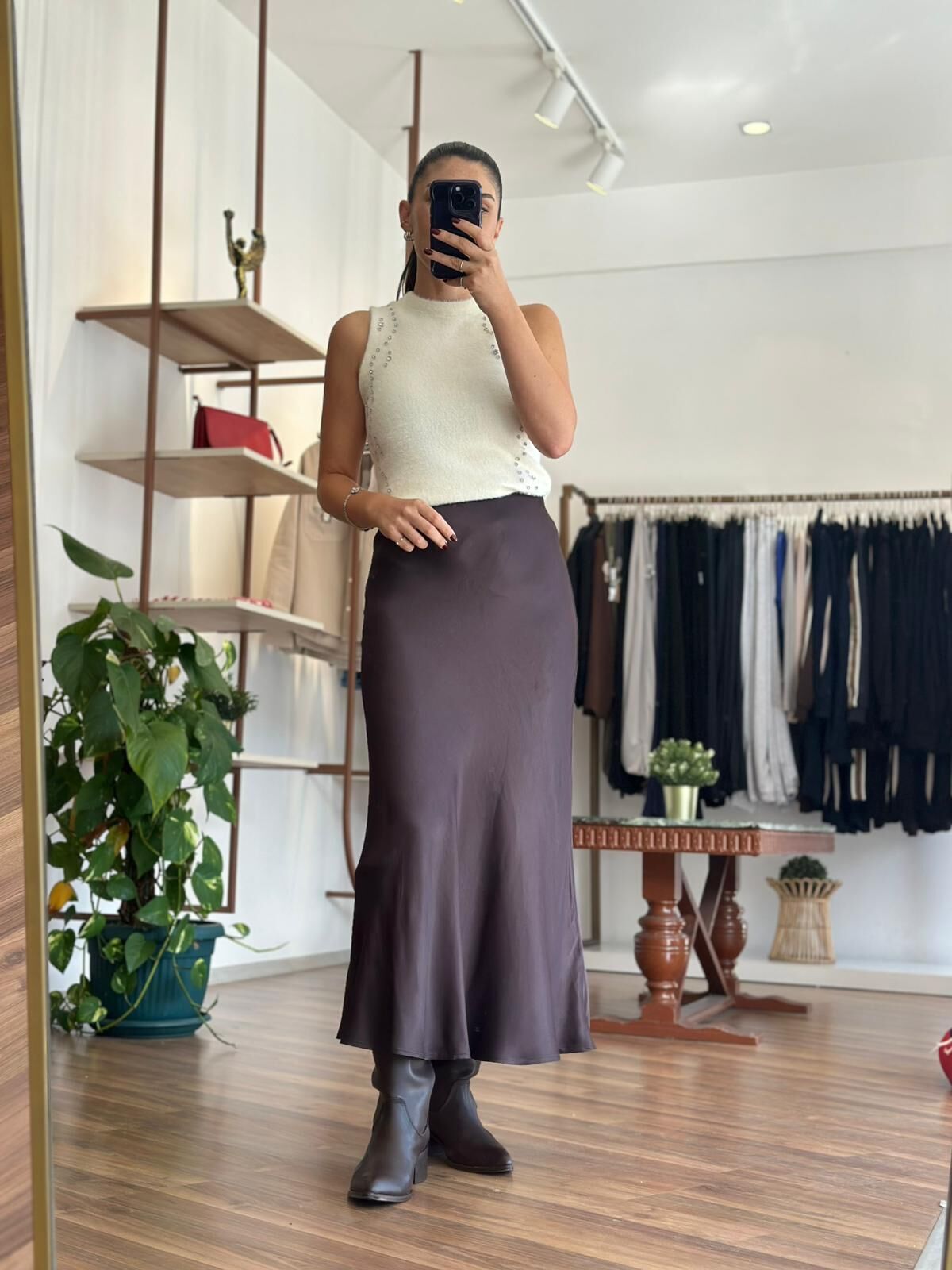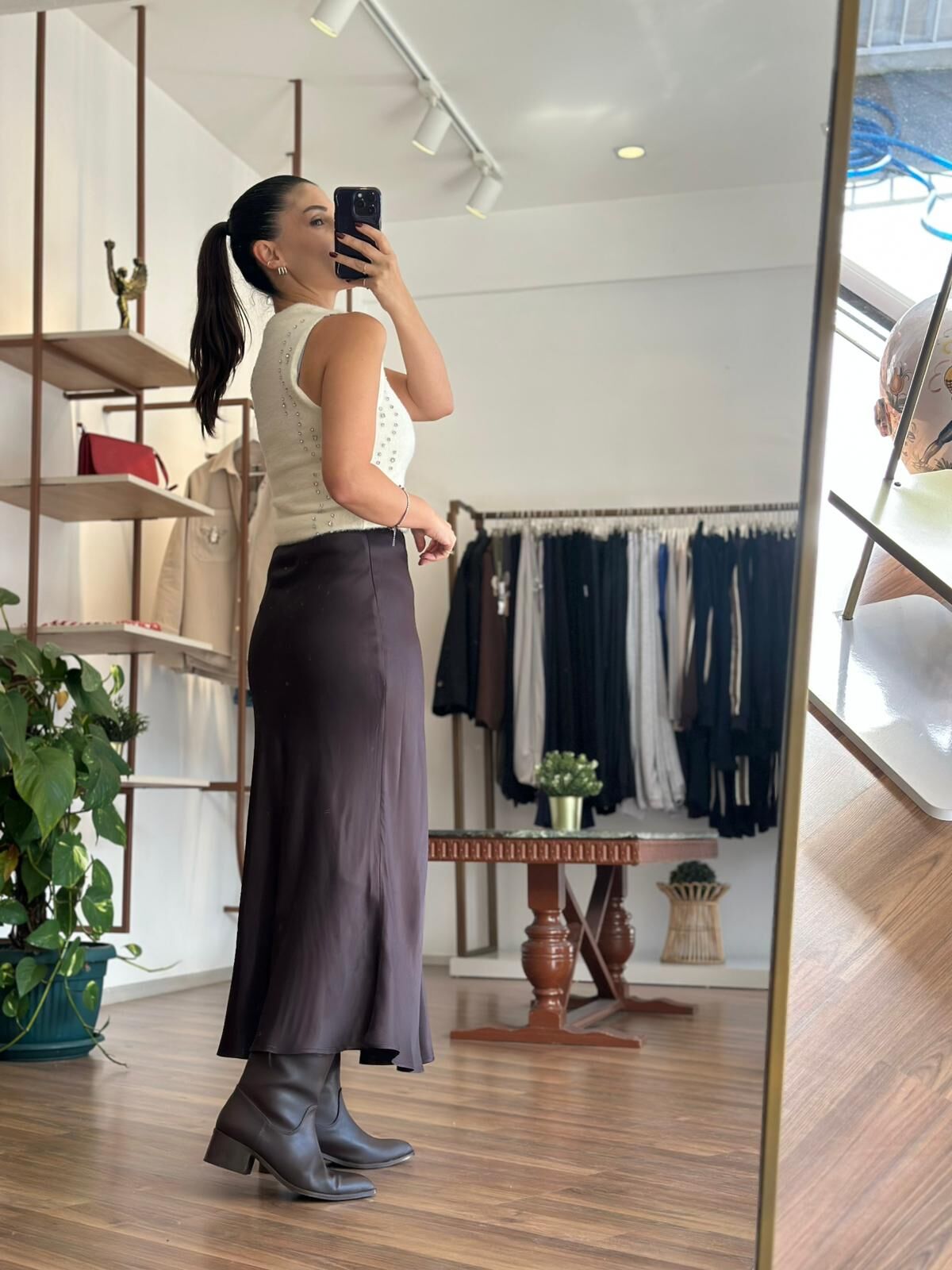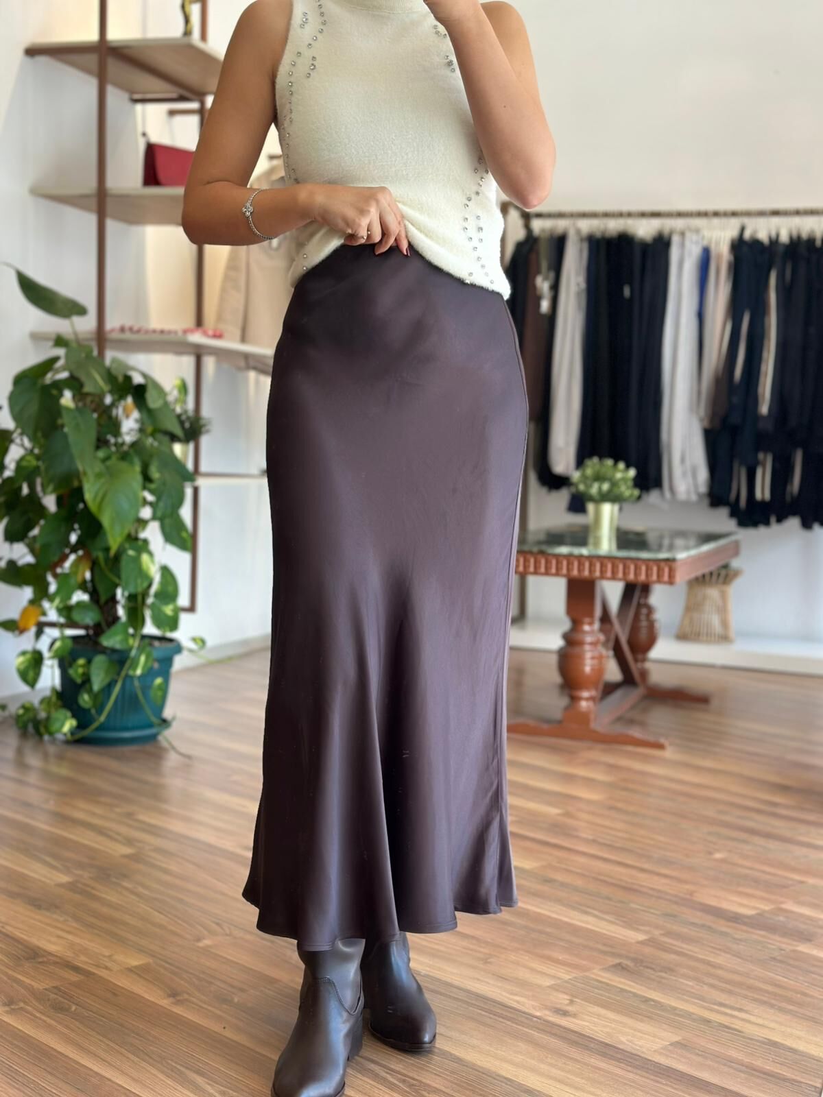 Acı Kahve rengiyle özel tasarlanmış, beli lastikli ipek saten midi boy etek, konfor ve şıklığı bir arada sunar. Hafif parlak dokusu ve akıcı kesimiyle hem günlük hem özel davetler için ideal. Zarif ve modern stil arayanlar için mükemmel bir tercih.