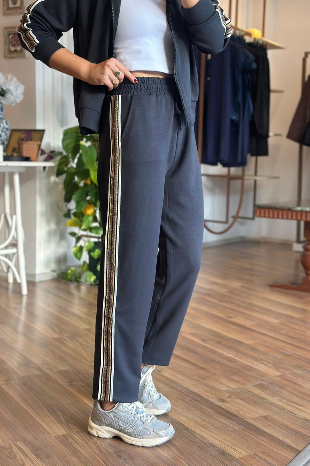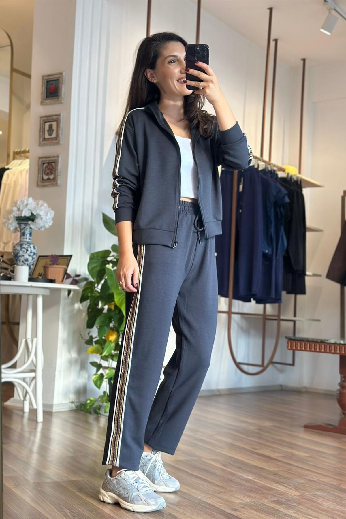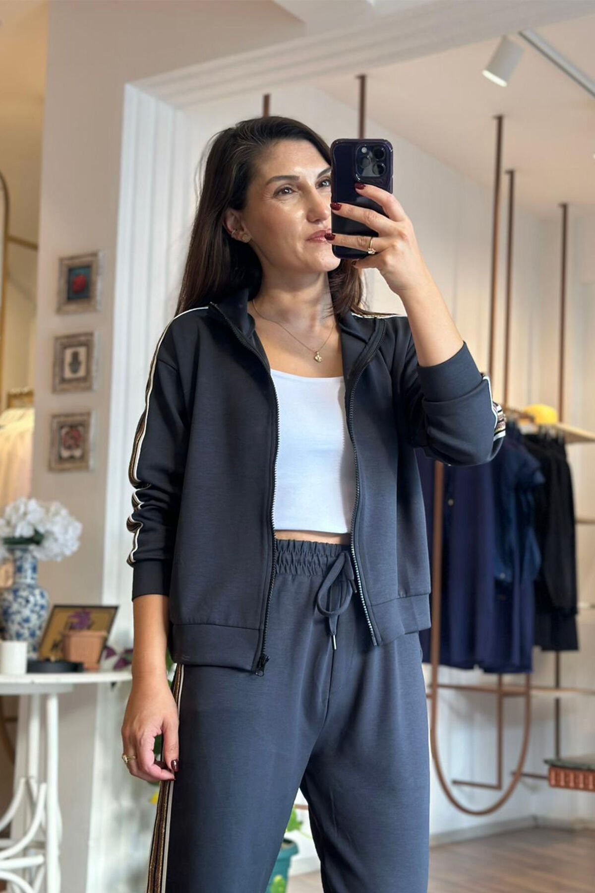 Antrasit şerit detaylı modal kumaş alt-üst takım, şık ve rahat bir günlük stil sunar. Yumuşak modal kumaşı, nefes alabilirlik sağlar ve cilt dostudur. Üstü ve altı uyumlu tasarımıyla hem evde hem dış mekanda konforlu kullanım için idealdir. Modern, zarif bir tercih.