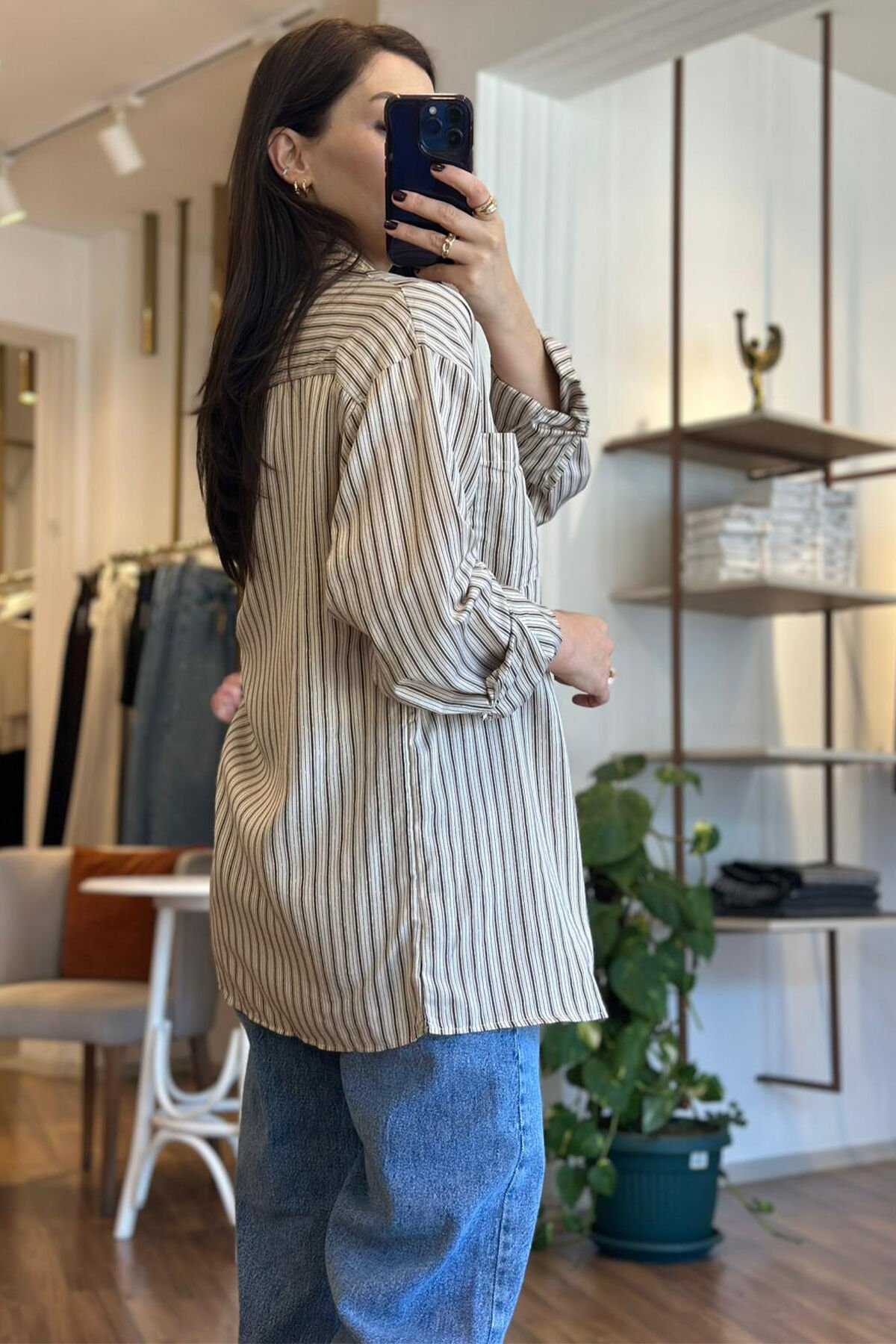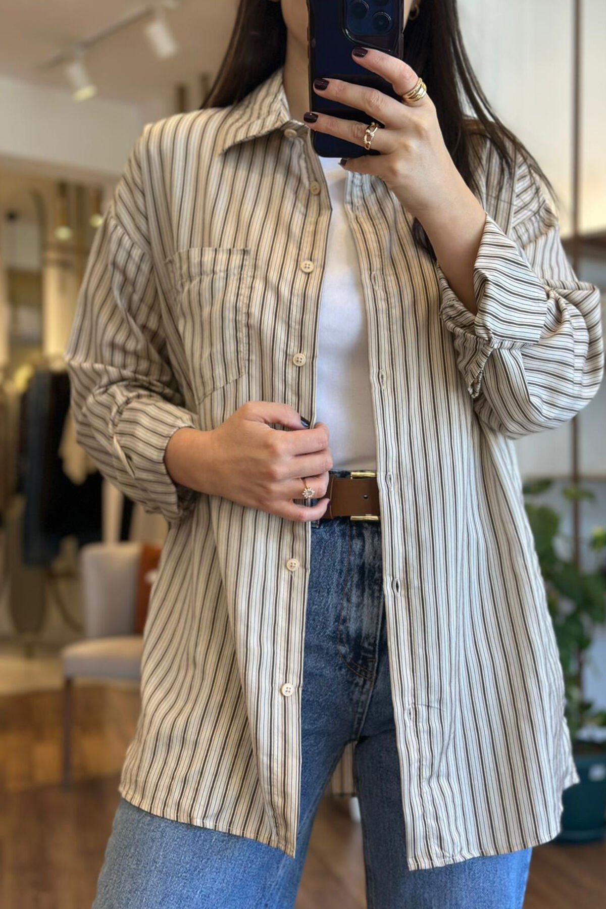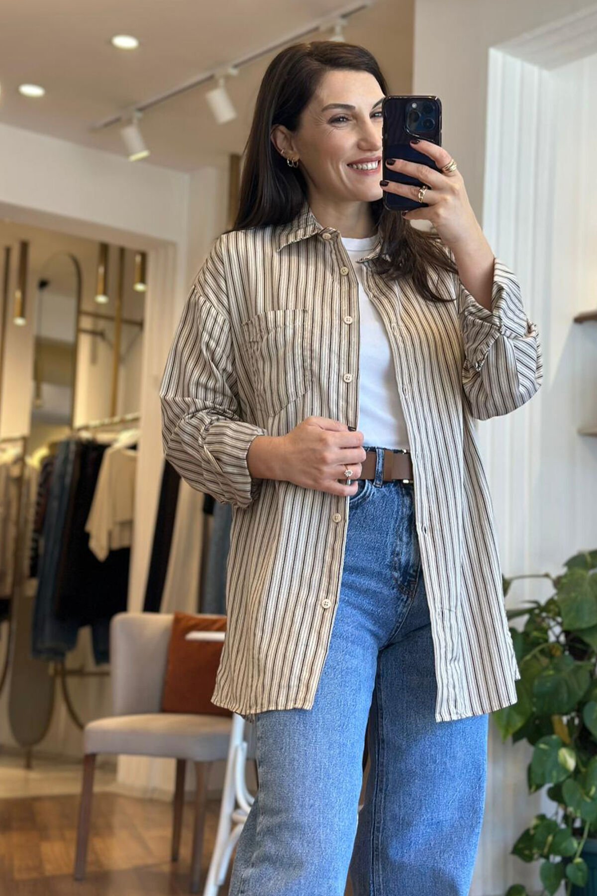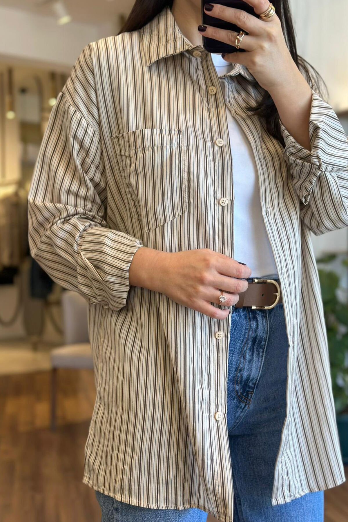 Zamansız şıklığı modern dokunuşlarla buluşturan bej kahverengi çizgili gömlek ,gardırobunuzun en kurtarıcı parçalarından biri olmaya aday. Yumuşak ve hafif dokulu kumaşı sayesinde gün boyu konfor sunarken ,dikey çizgili tasarımı ile daha uzun ve zarif görünüm sağlar.Hem günlük hem de özel günlerde rahatlıkla tercih edebileceğiniz gömlektir.