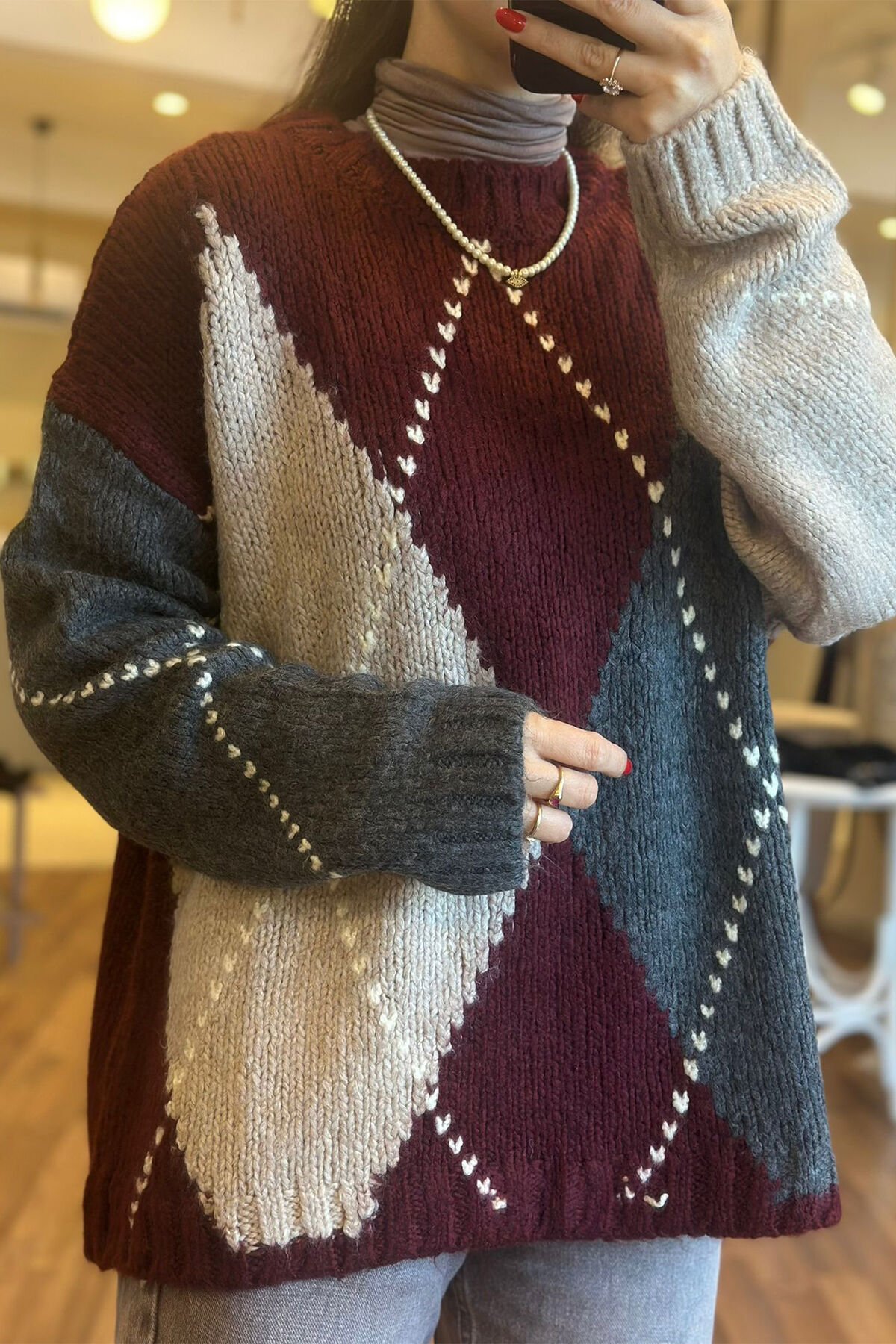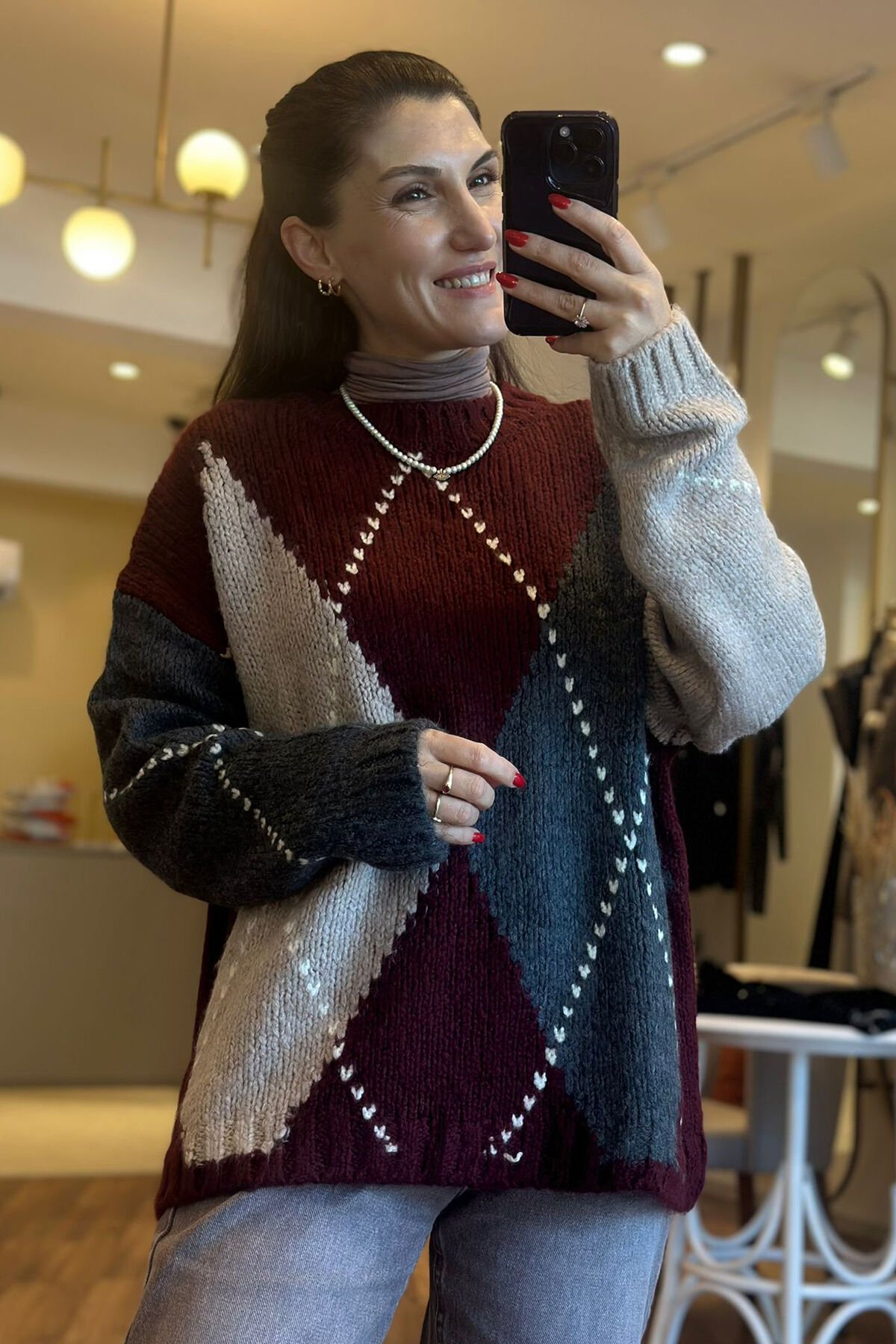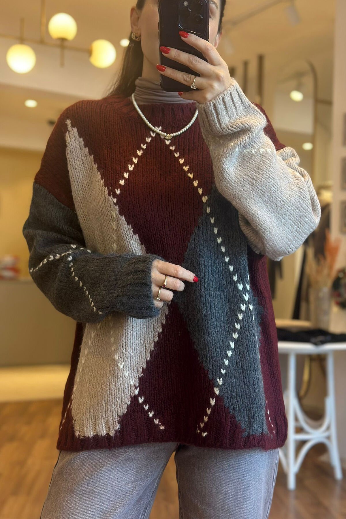 Standart beden baklava desen kazak sezonun trend rengi bordo ile harmanlandı.