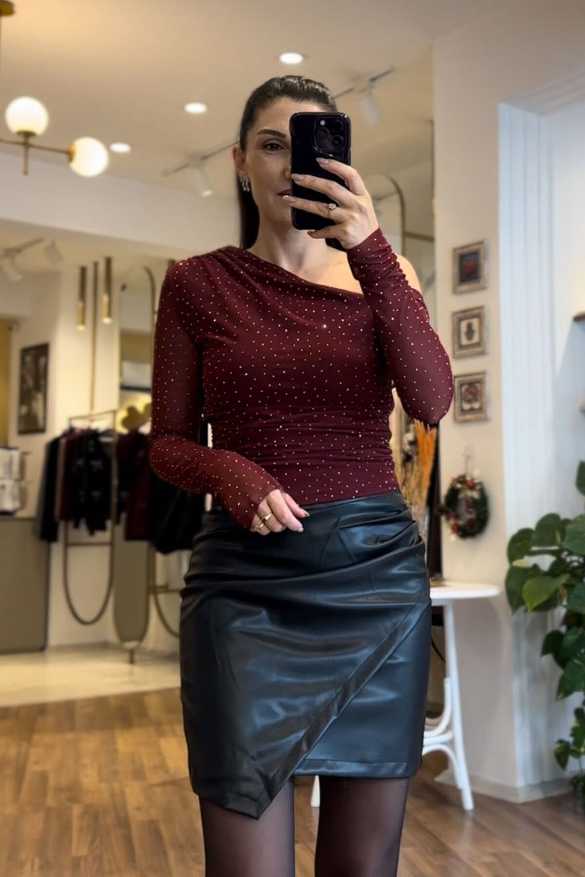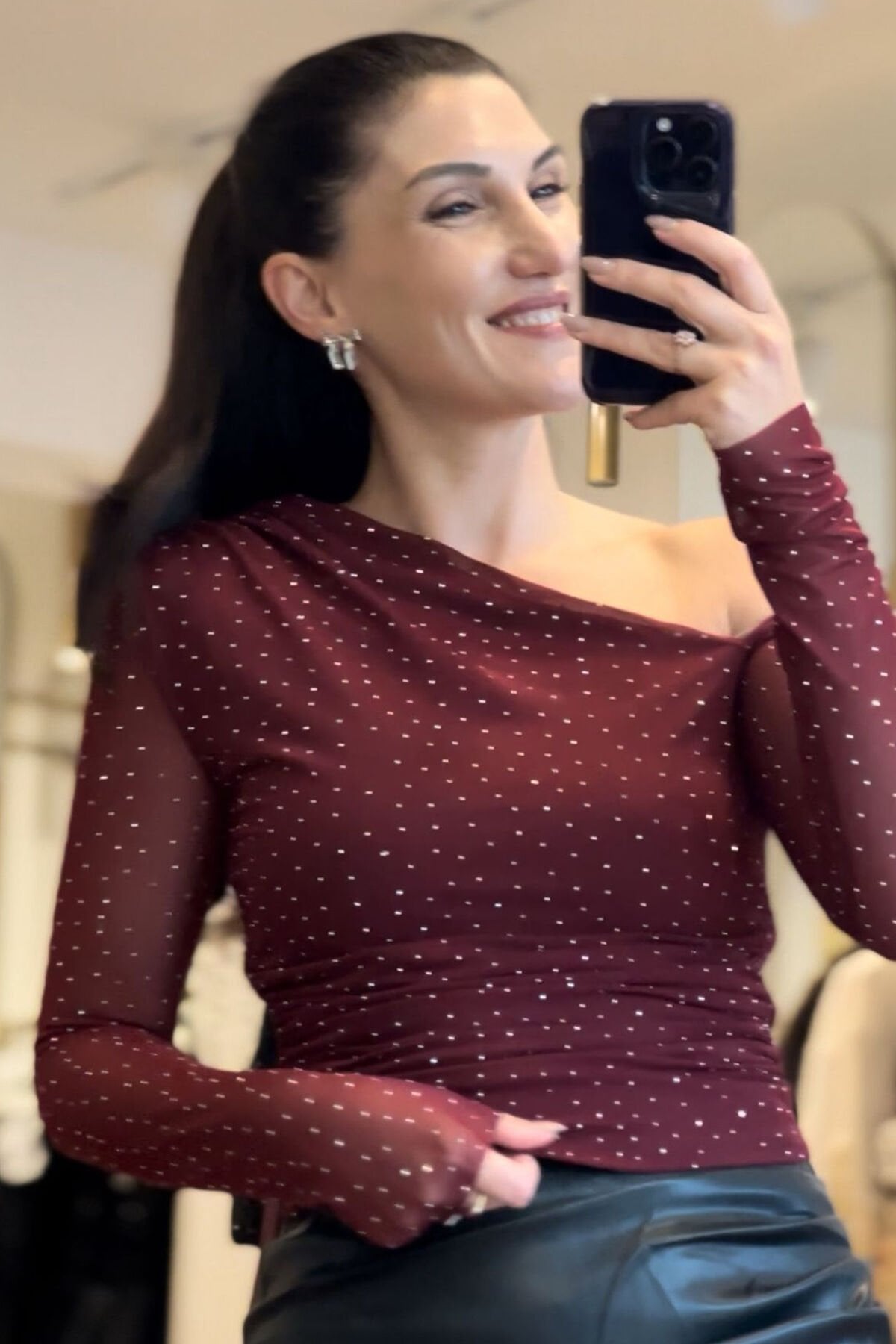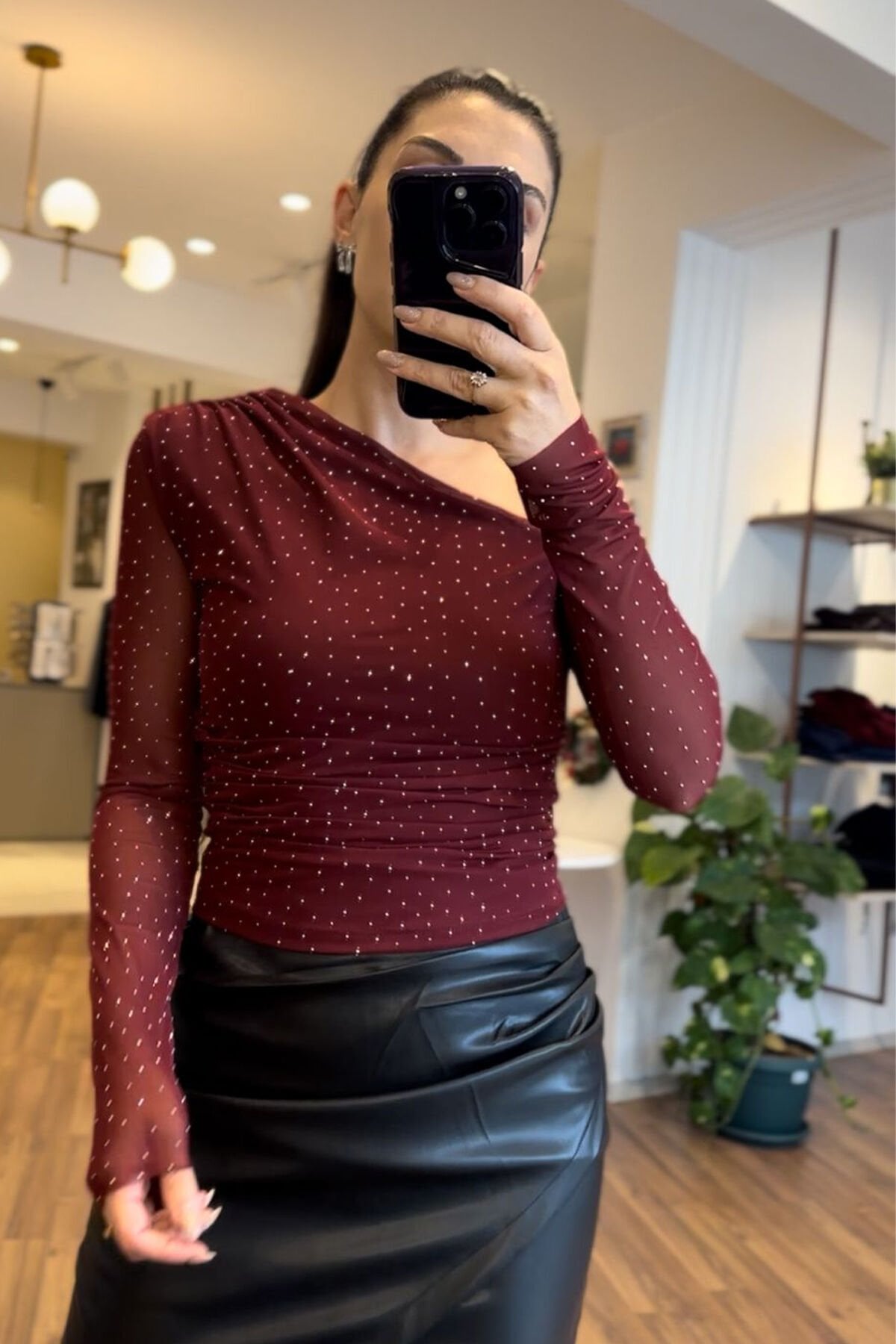 Zarafeti ve ışıltıyı bir aray getiren kahverengi taşlı bluz ,özel gün kombinlerinin göz alıcı parçası olmaya aday.Hafif yapısı sayesinde gün boyu rahat kullanım sağlar.