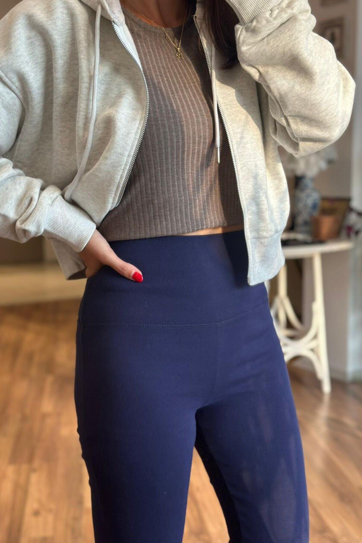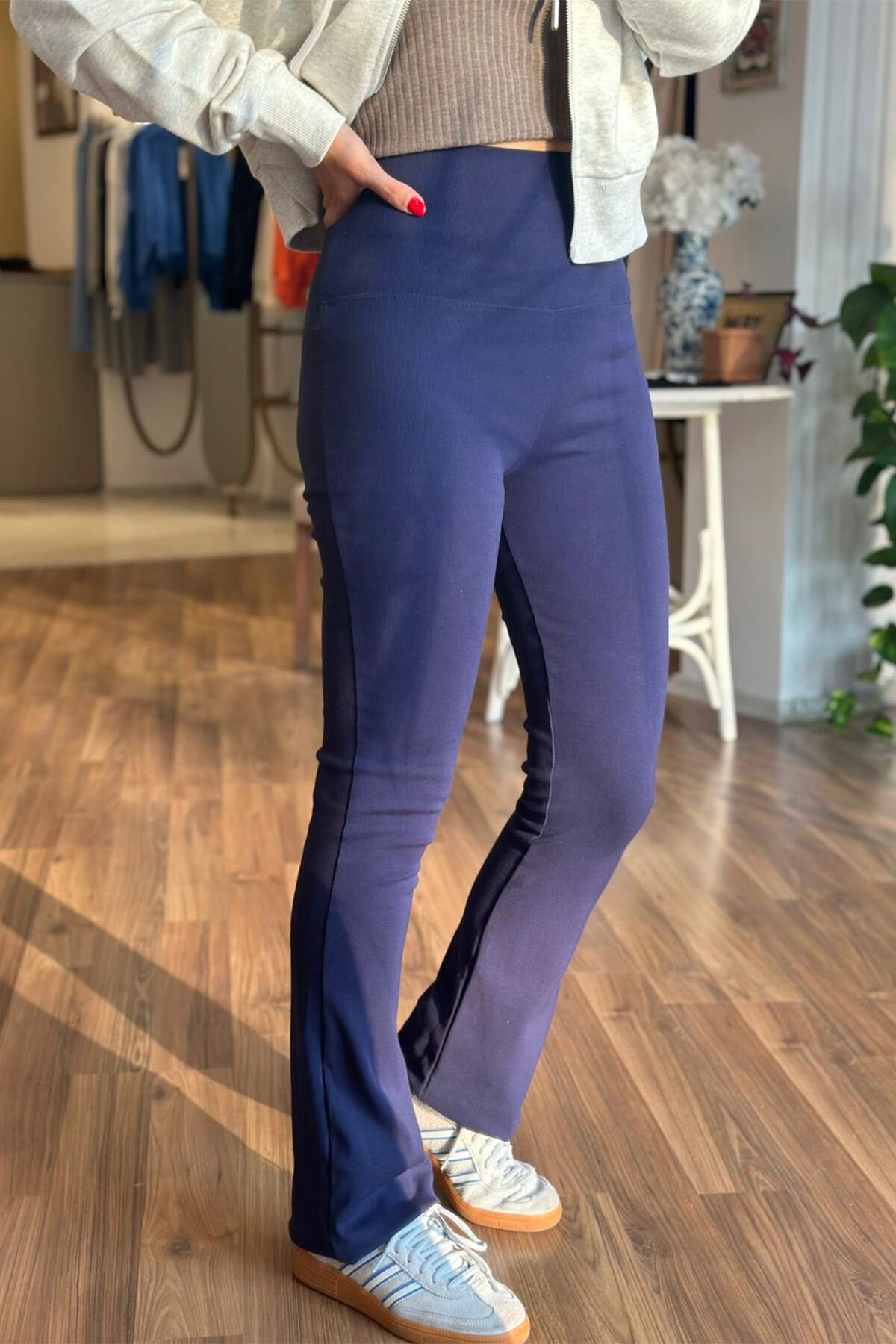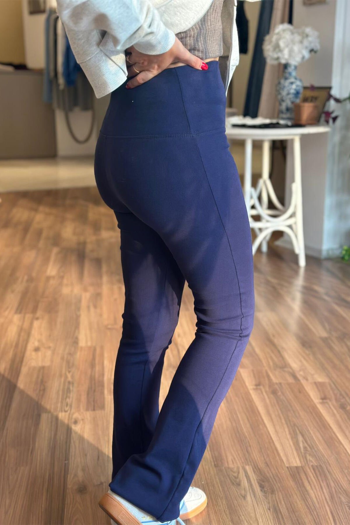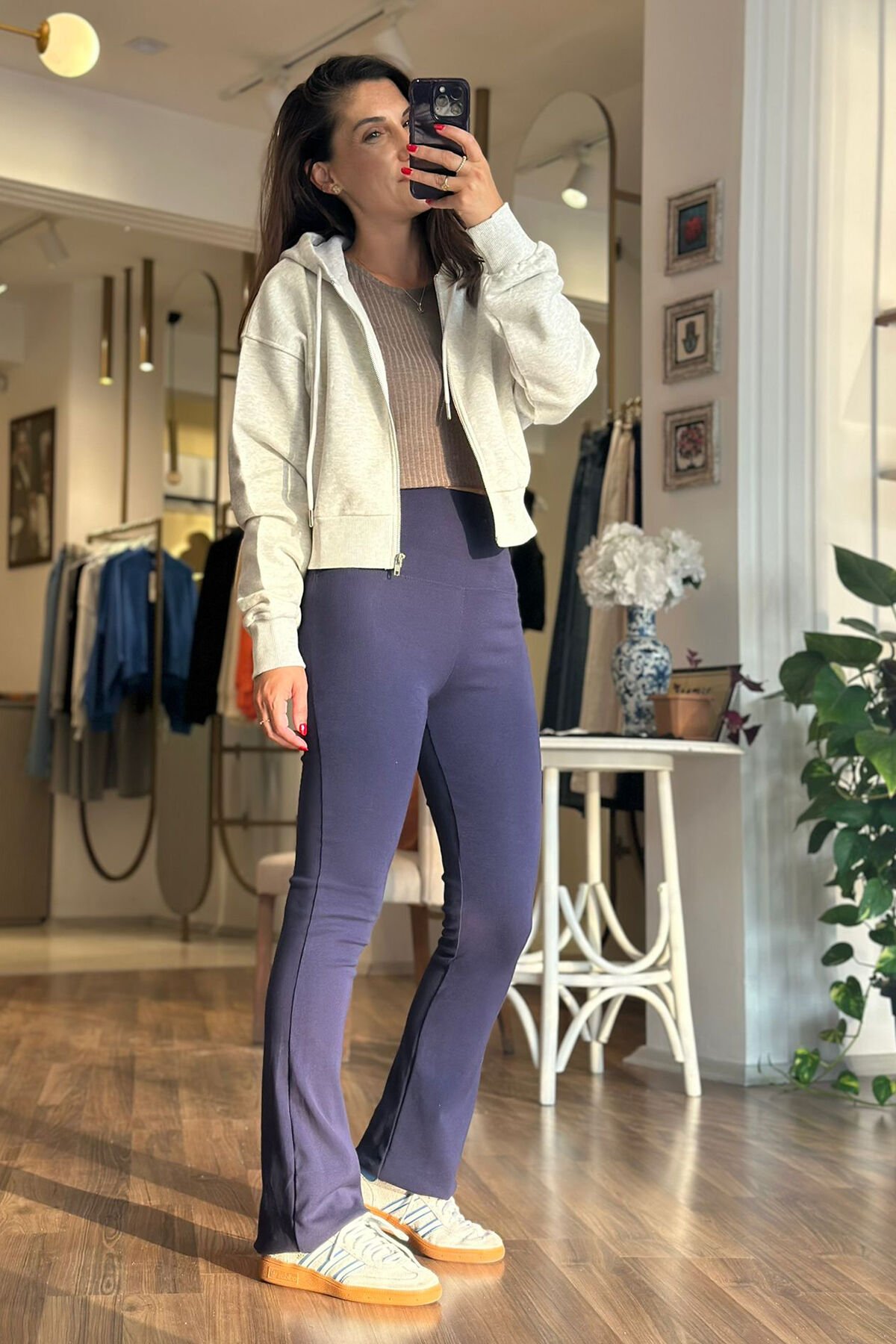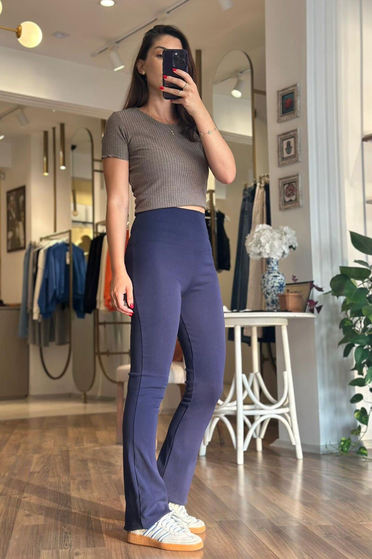 Bu lacivert pamuklu likralı İspanyol paça tayt, konforlu ve şık bir seçenektir. Pamuklu kumaşı cilde dosttur, likralı yapısı ise esneklik sağlar. İspanyol paça tasarımıyla modern bir görünüm sunar. Gündelik giyim için idealdir.