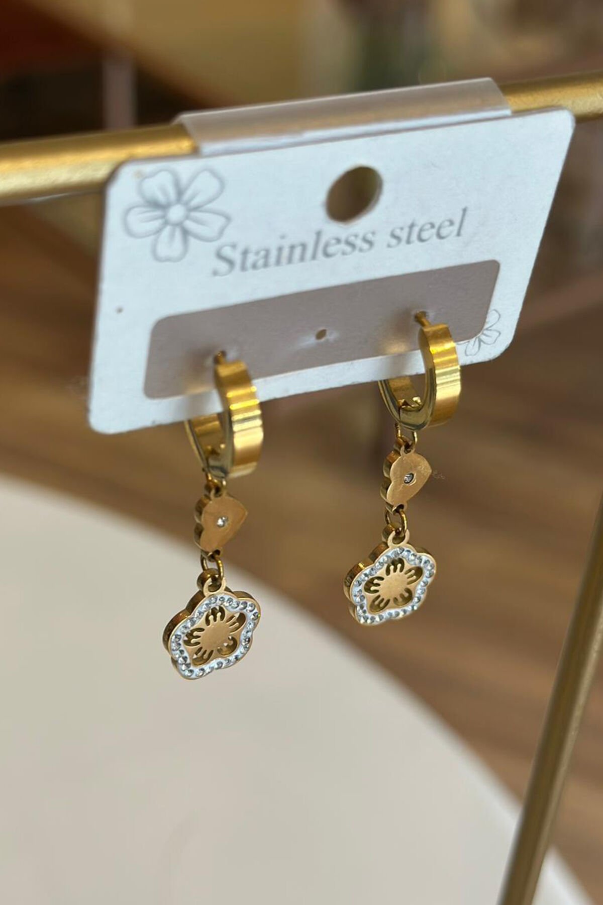 Çiçekli Taşlı Gold Çelik Küpe