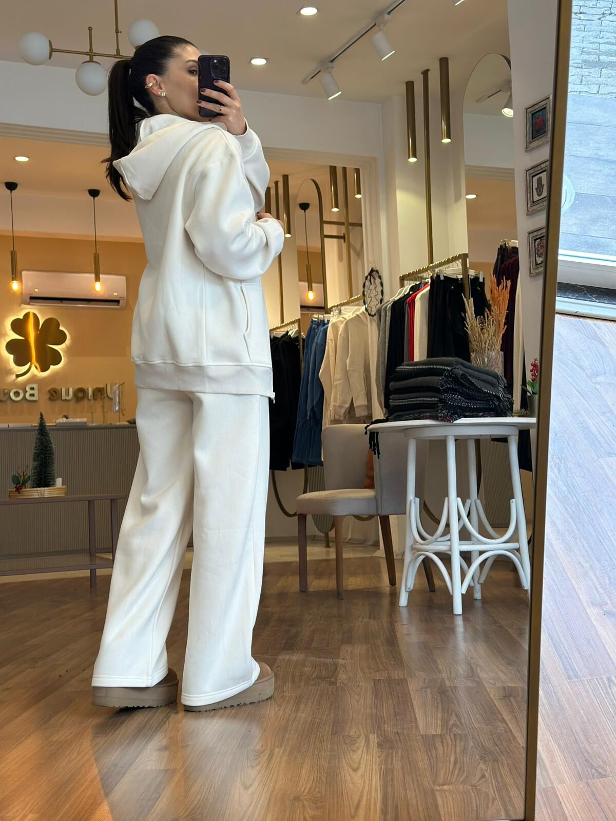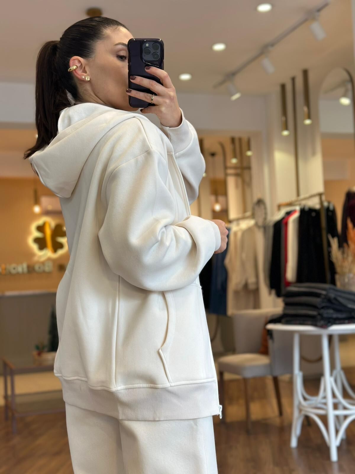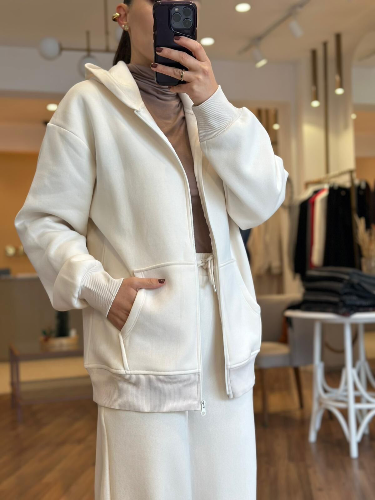Ekru kapüşonlu fermuarlı pamuklu sweatshirt, rahatlığı ve şıklığı bir arada sunar. Yumuşak pamuklu dokusu sayesinde gün boyu konfor sağlar. Fermuar detayı pratik kullanım imkanı yaratırken, sıcak tutan iç yüzeyi soğuk havalarda ideal seçimdir. Spor ve günlük kombinlerde fark yaratır.