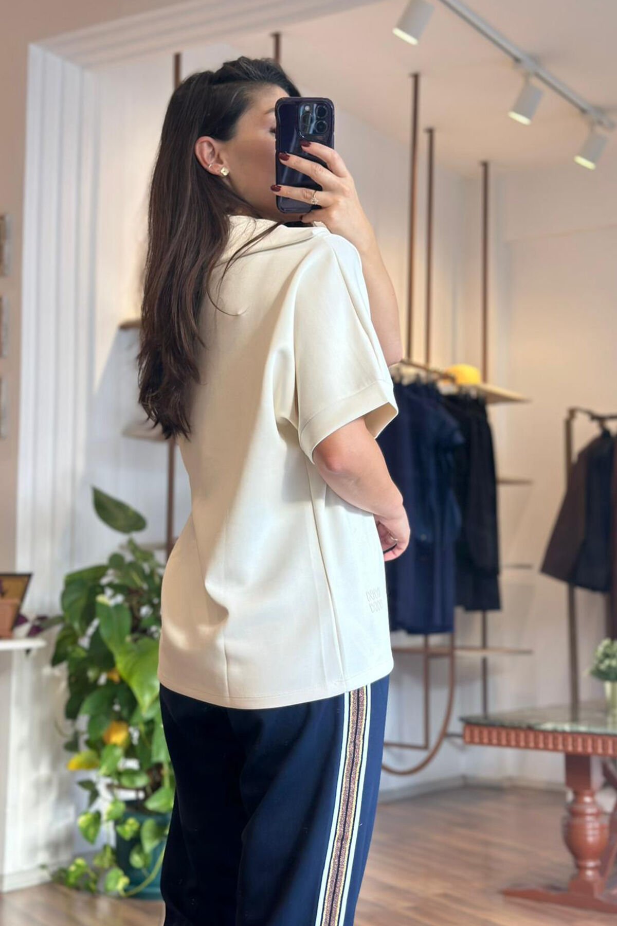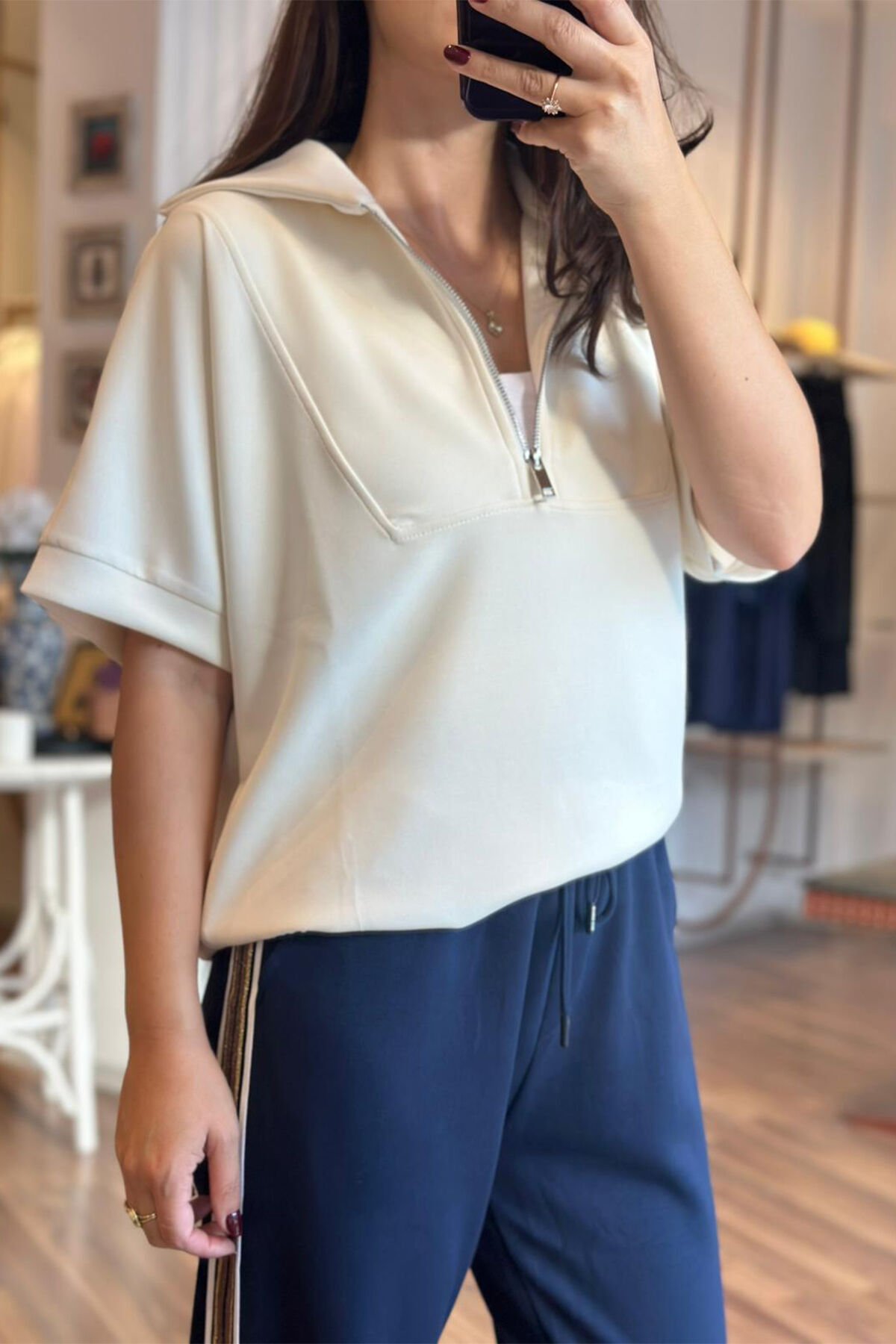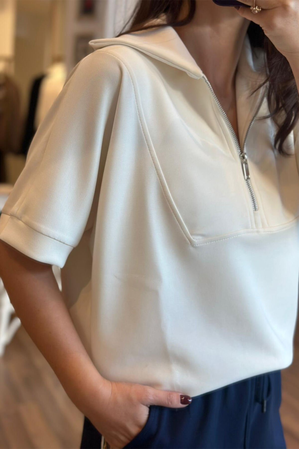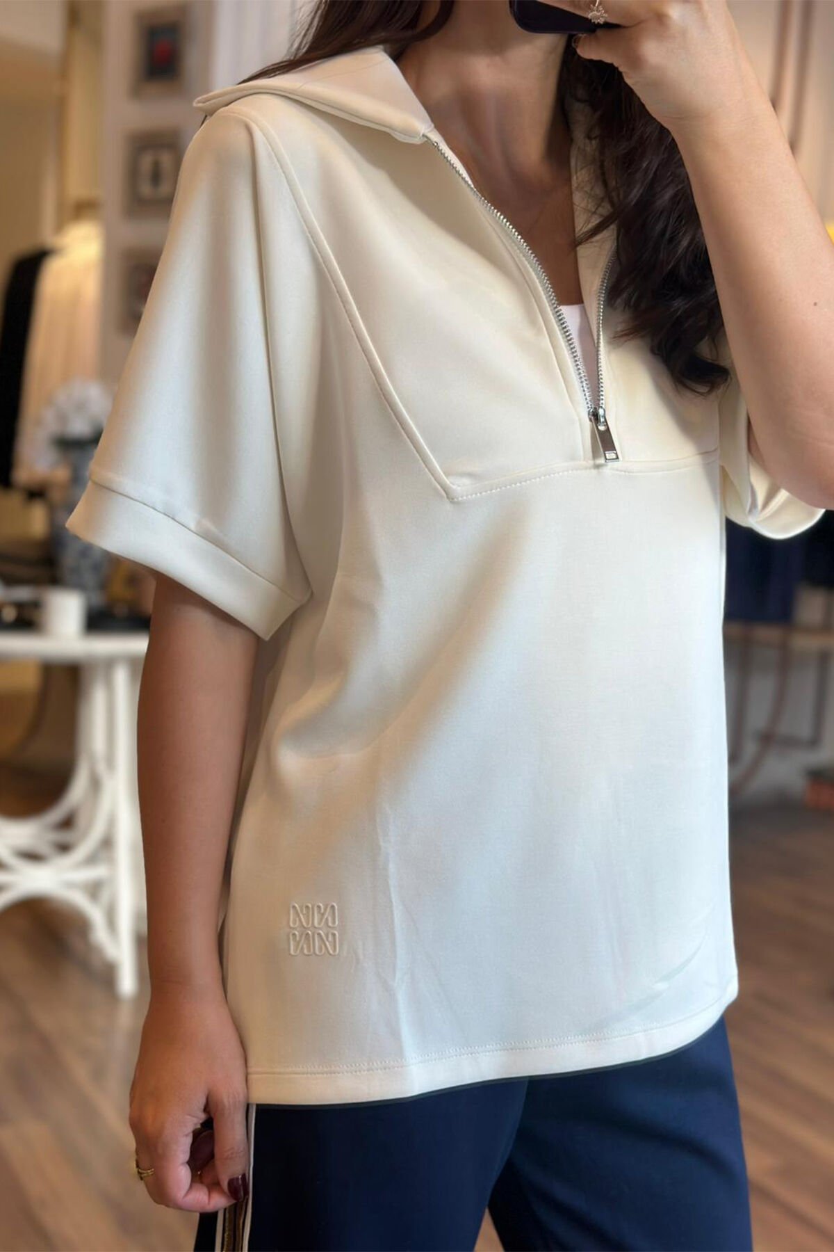 Ekru modal kumaştan üretilen bu polo yaka bluz, yarım fermuar kapamasıyla şıklık ve pratiklik sunar. Yumuşak dokusu ve rahat kesimi sayesinde gün boyu konfor sağlar. Hem günlük hem de özel kombinlerde kullanıma uygundur. Modern ve zarif tasarım tercihlerinize değer katacak.