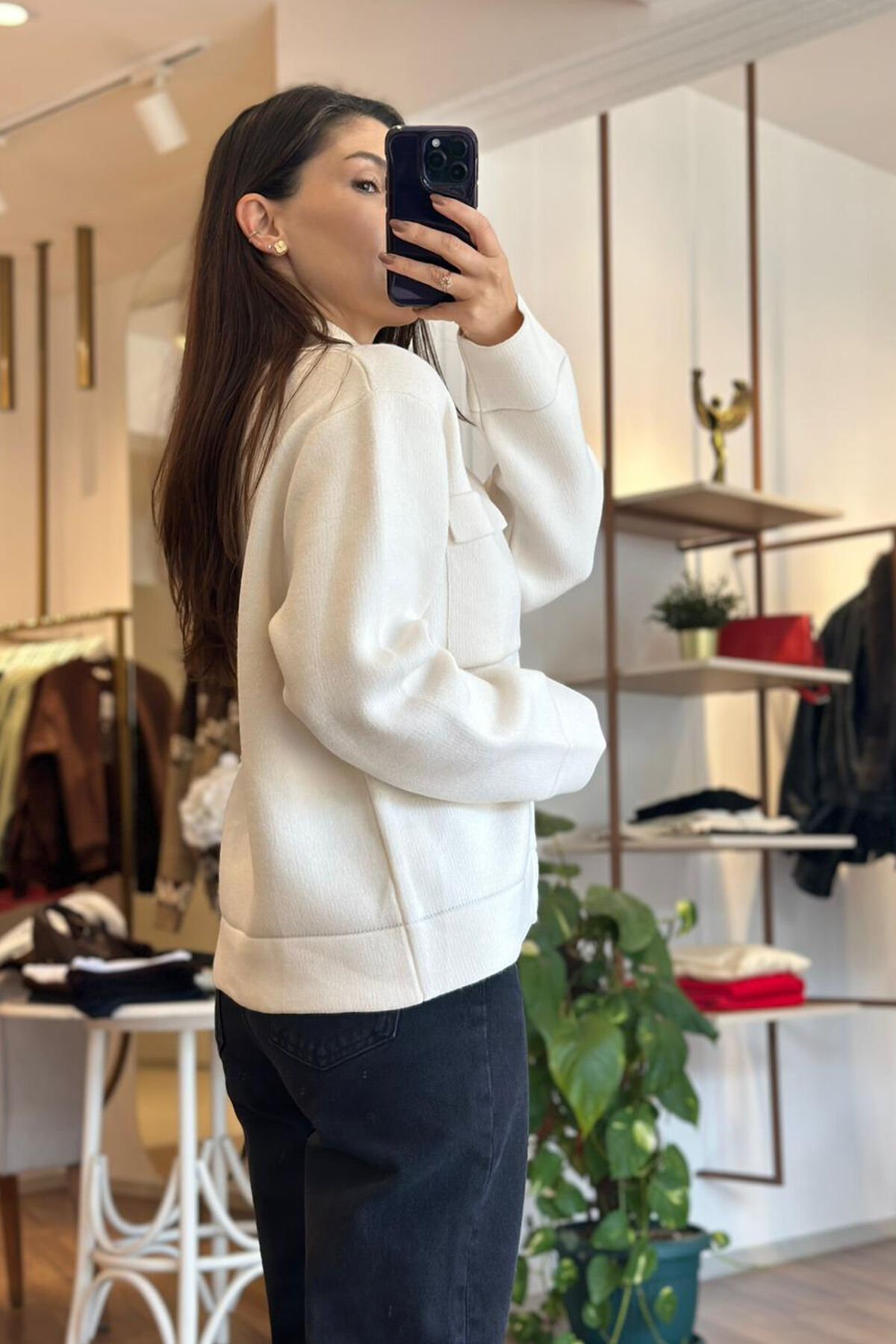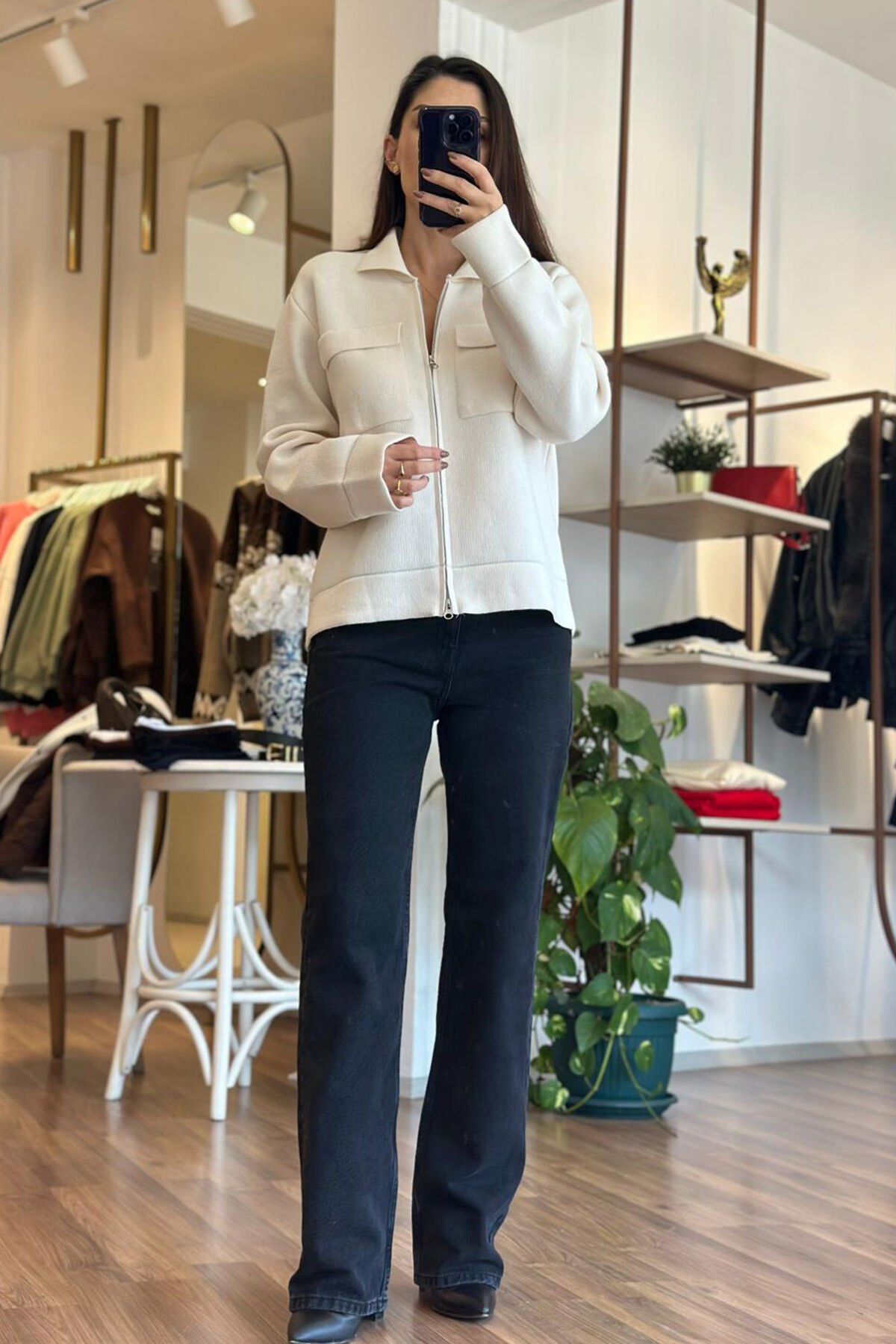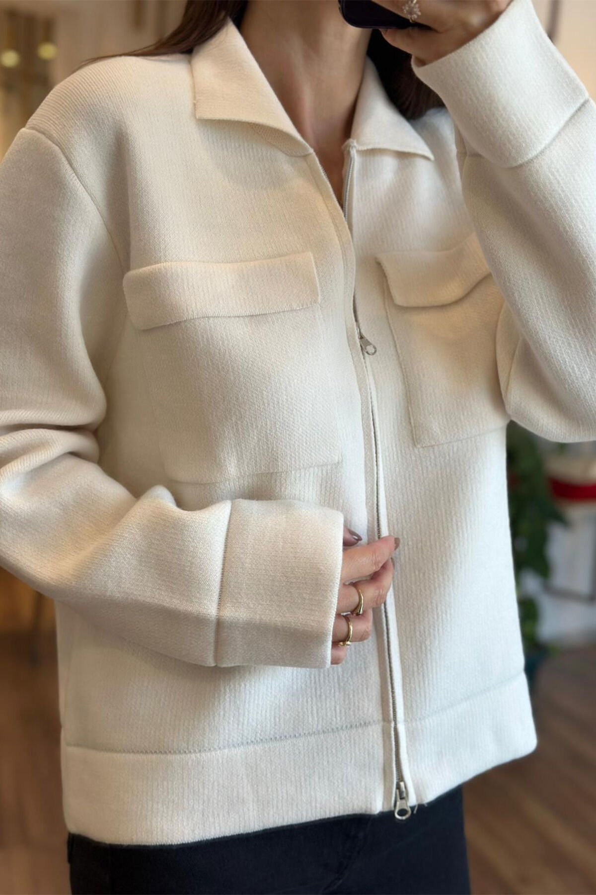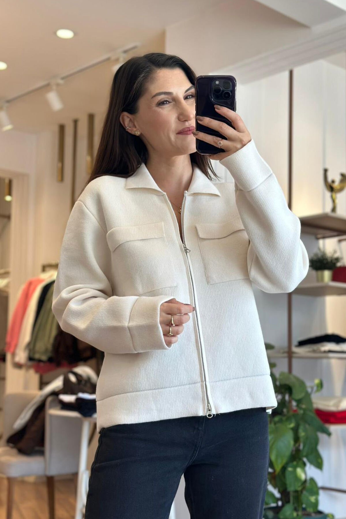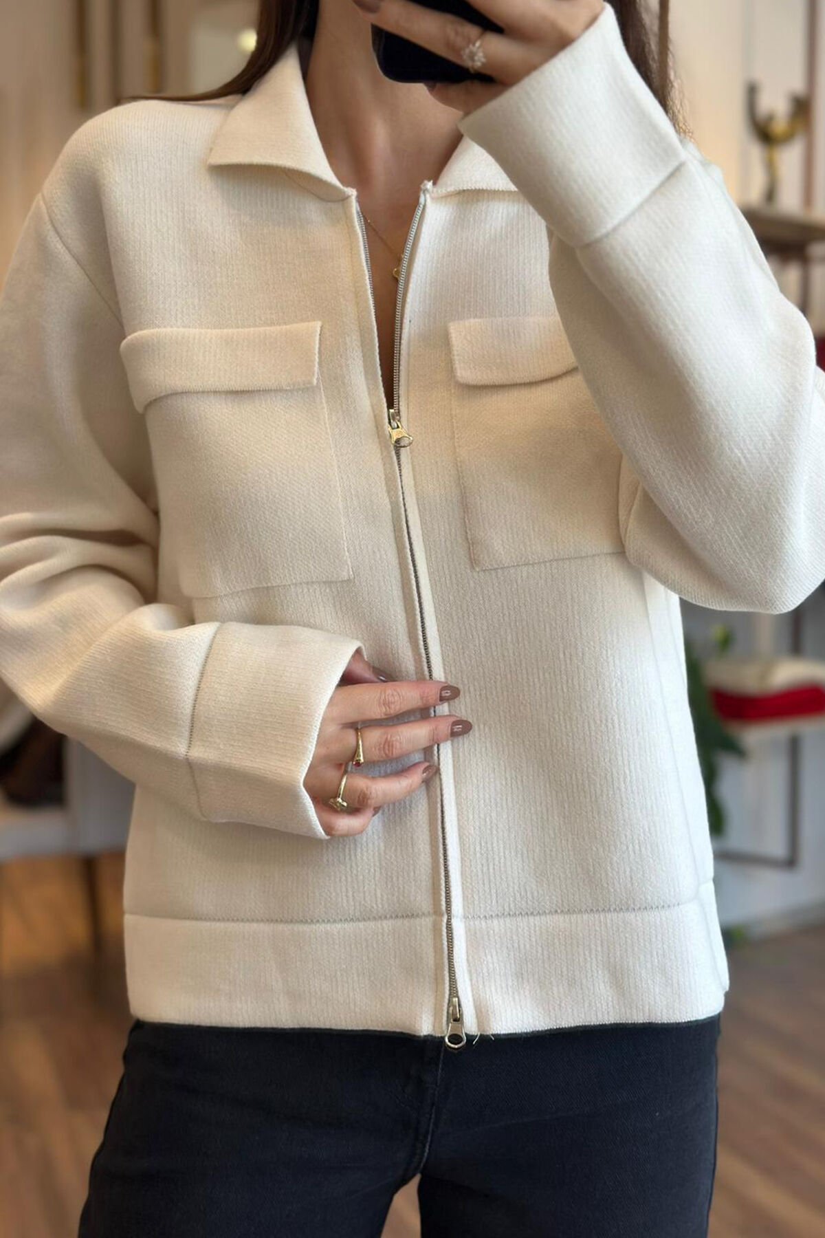 Ekru renkte, polo yaka ve fermuarlı tasarımı ile şıklığı bir arada sunan triko hırka. Standart bedene uygun, esnek ve likralı dokusuyla konfor sağlar. Günlük ve şık kombinleriniz için ideal, rahat kullanım vadeder. Her tarza kolayca uyum sağlar.