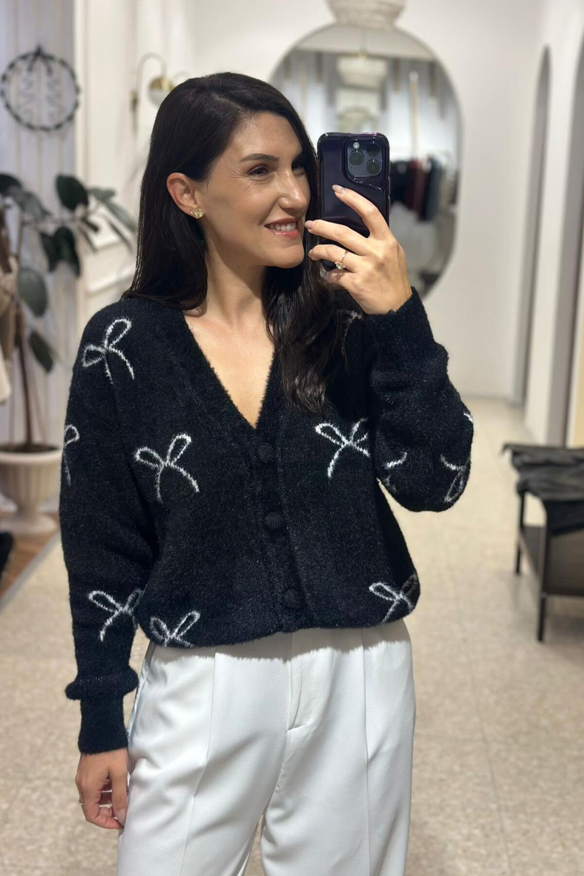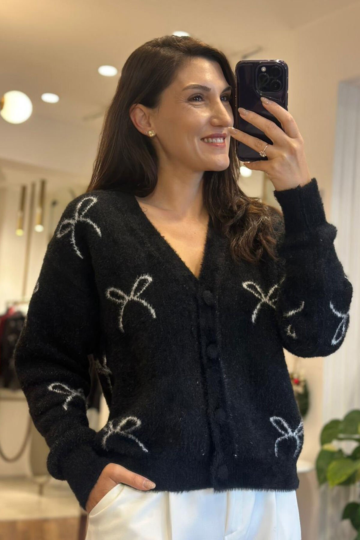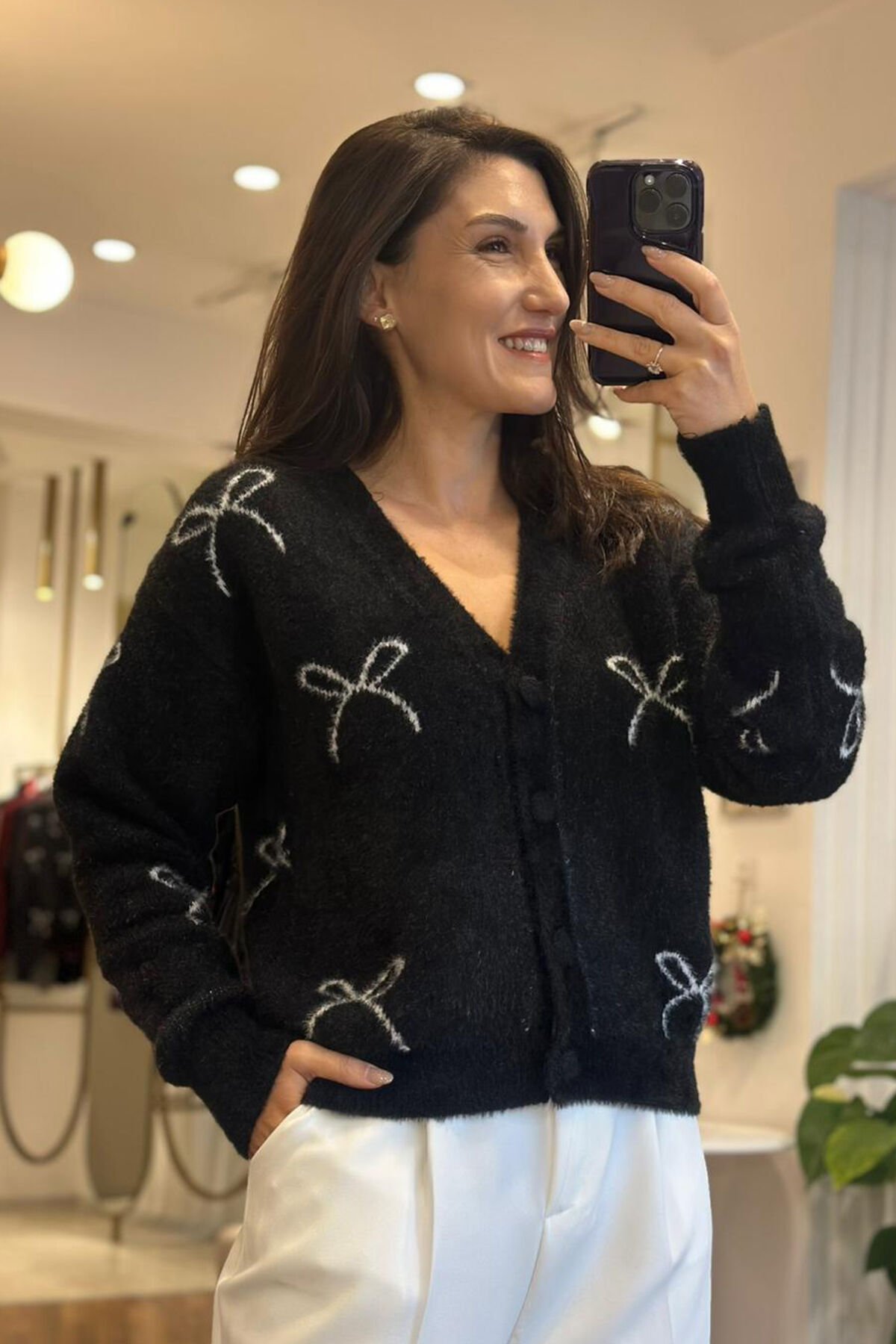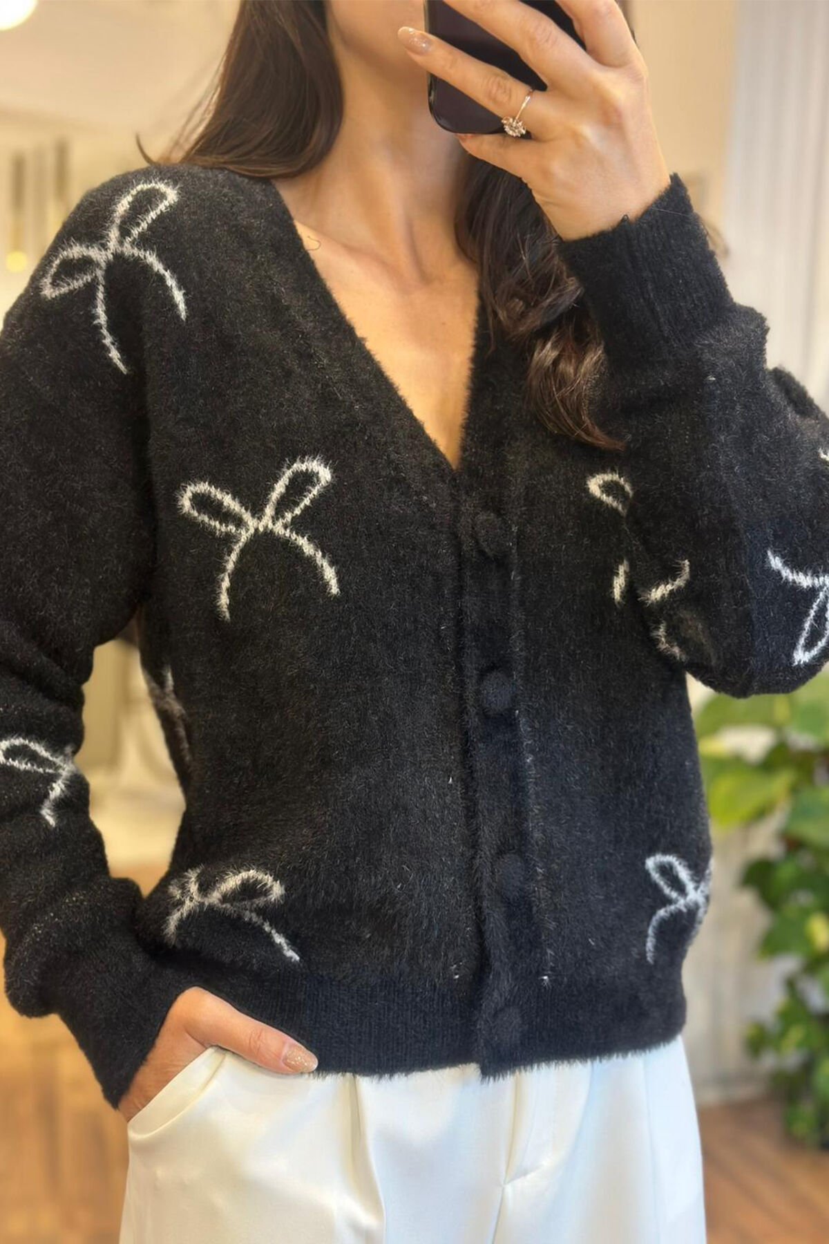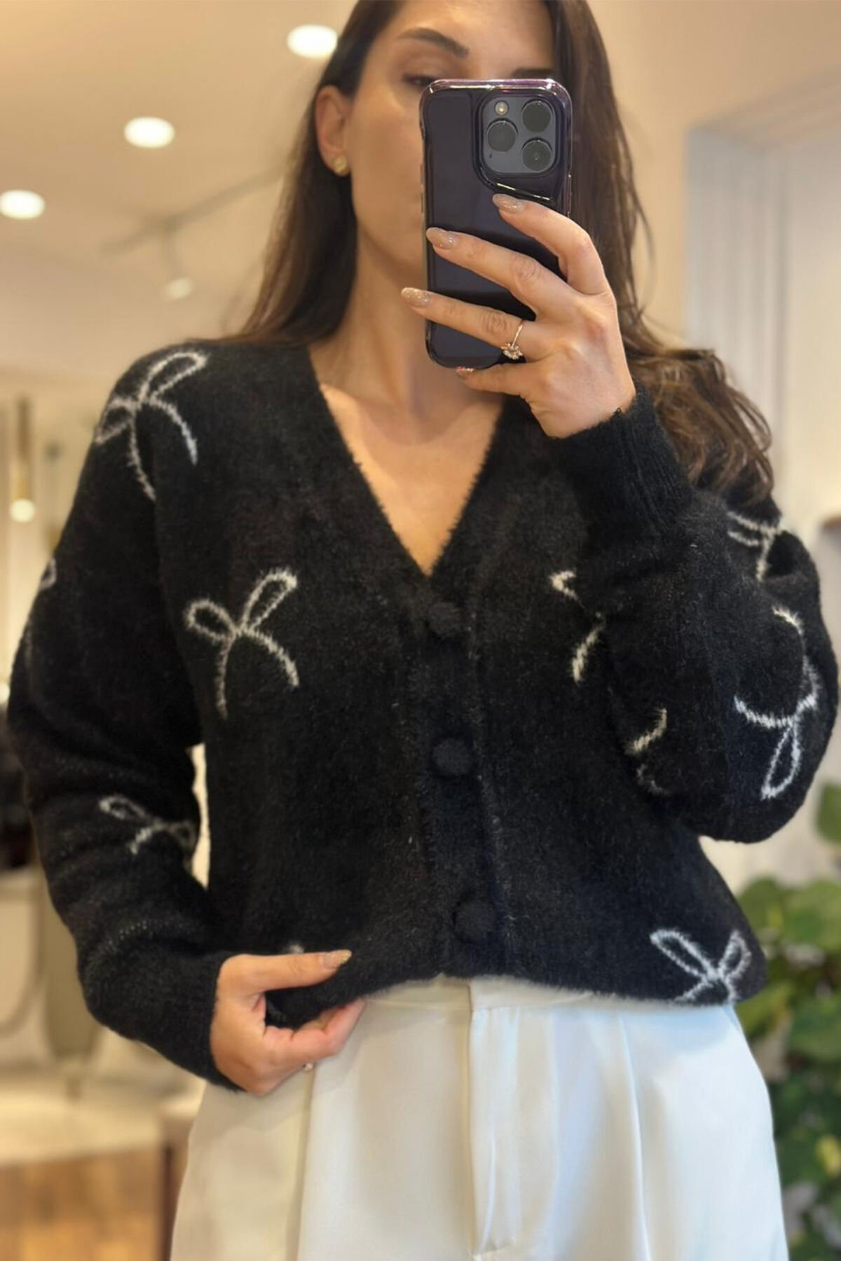 Siyah yün dokulu kısa hırka ,günlük kombinlerin vazgeçilmez parçası oluyor.Yumuşak dokusu sayesinde gün boyu konfor sağlarken ,modern kısa kesimiyle güzel bir görünüm sağlar.