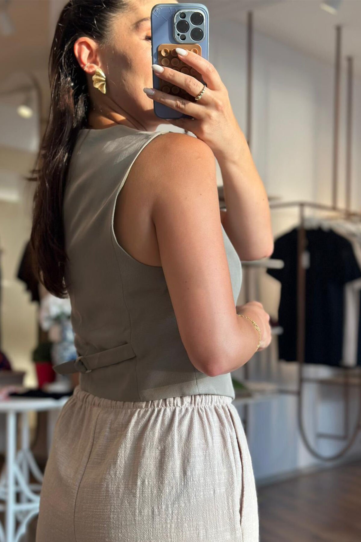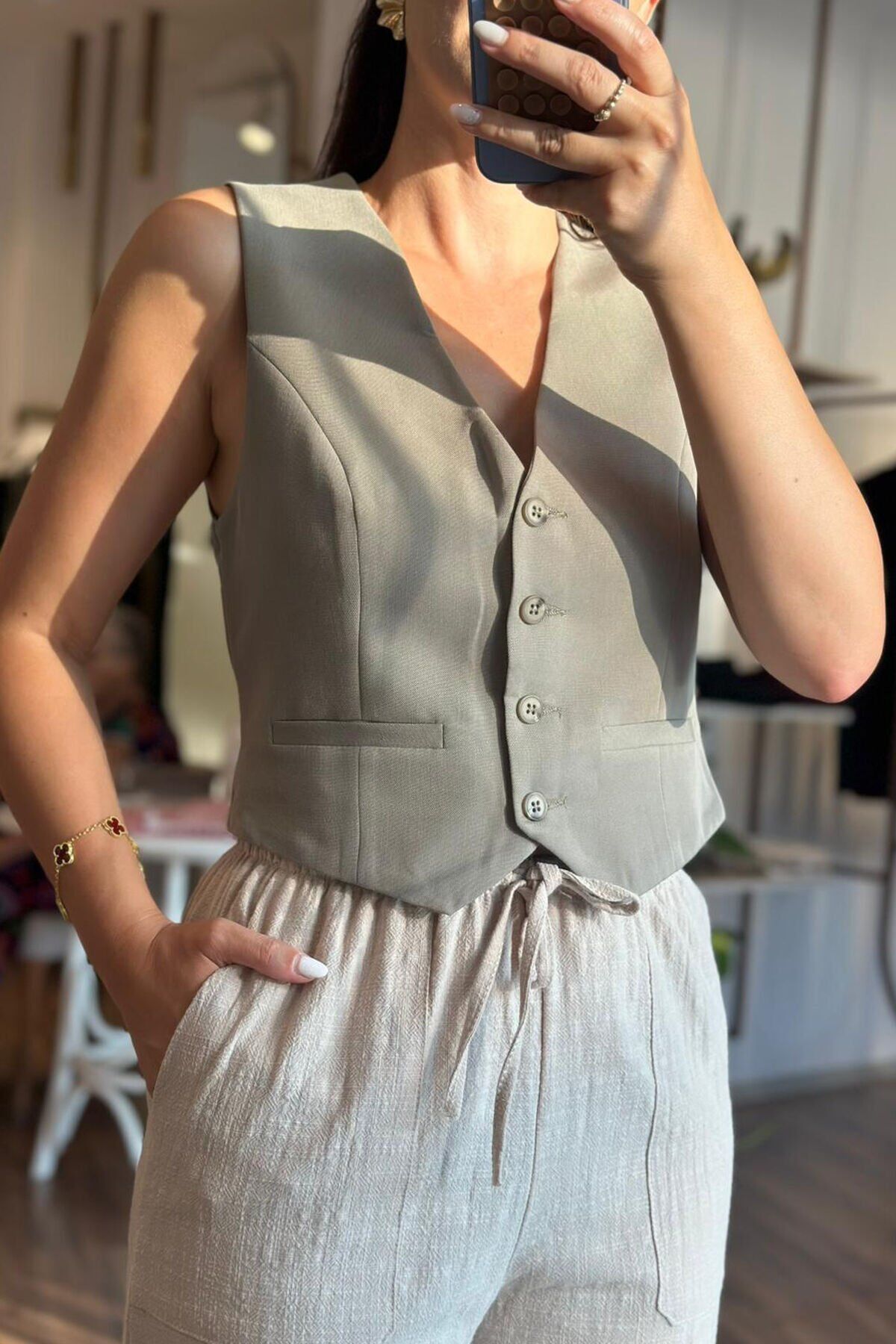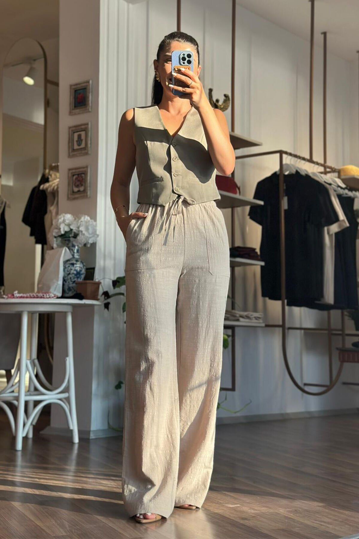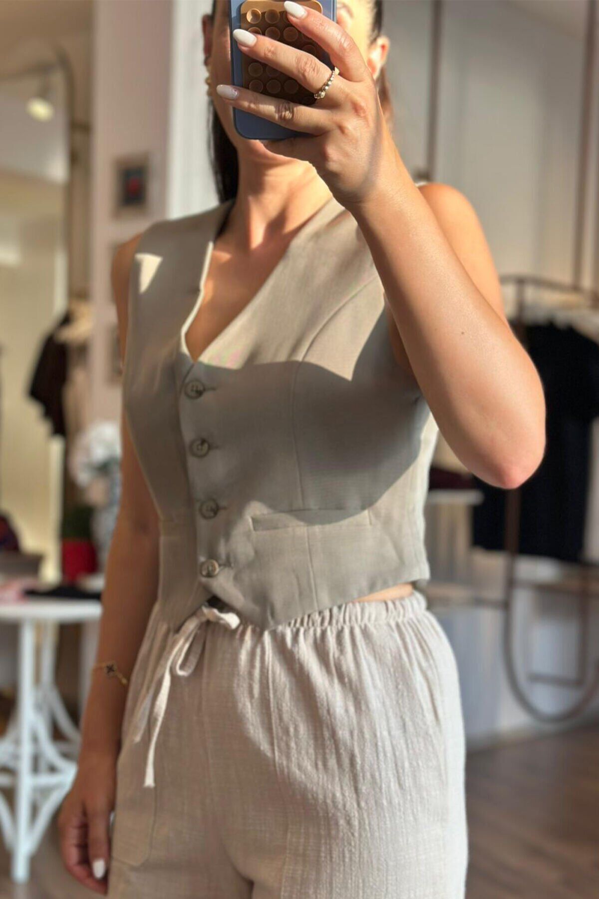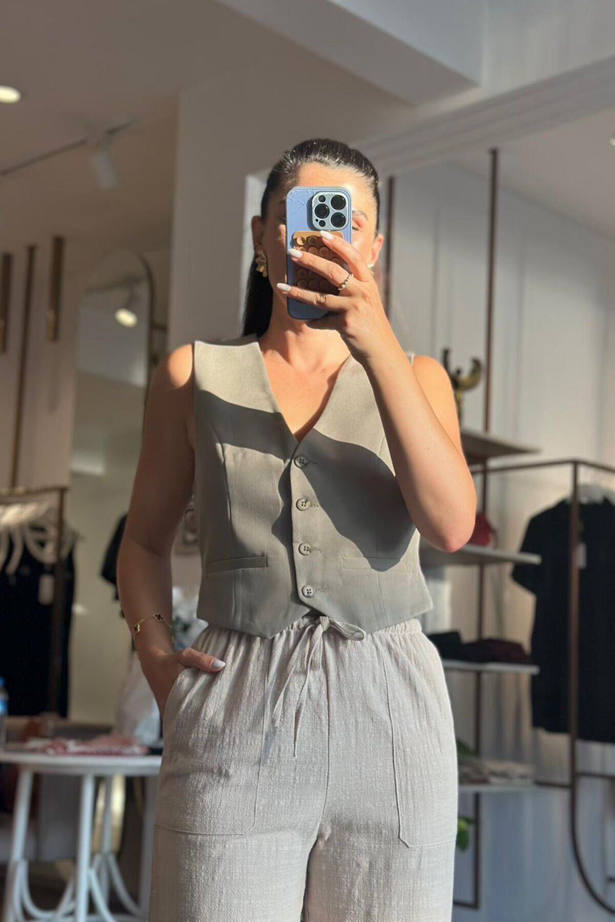 Bu şık keten yelek, iç astarlı tasarımı ile konforlu bir deneyim sunar. Krem rengi ve kemik düğmeleriyle modern ve şık bir görünüm elde edebilirsiniz. Hem gündelik hem de özel günlerde rahatlıkla kullanabilir, tarzınızı tamamlayabilirsiniz.