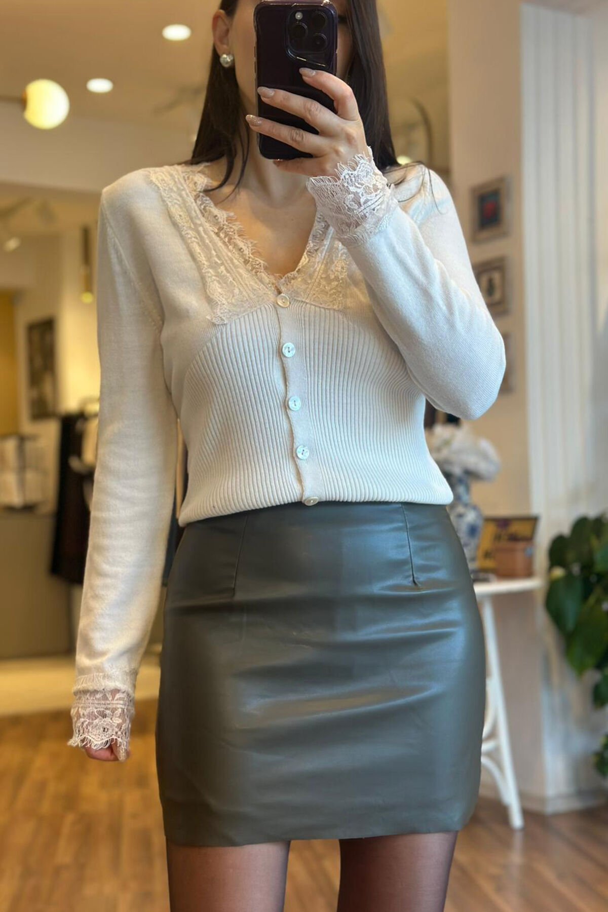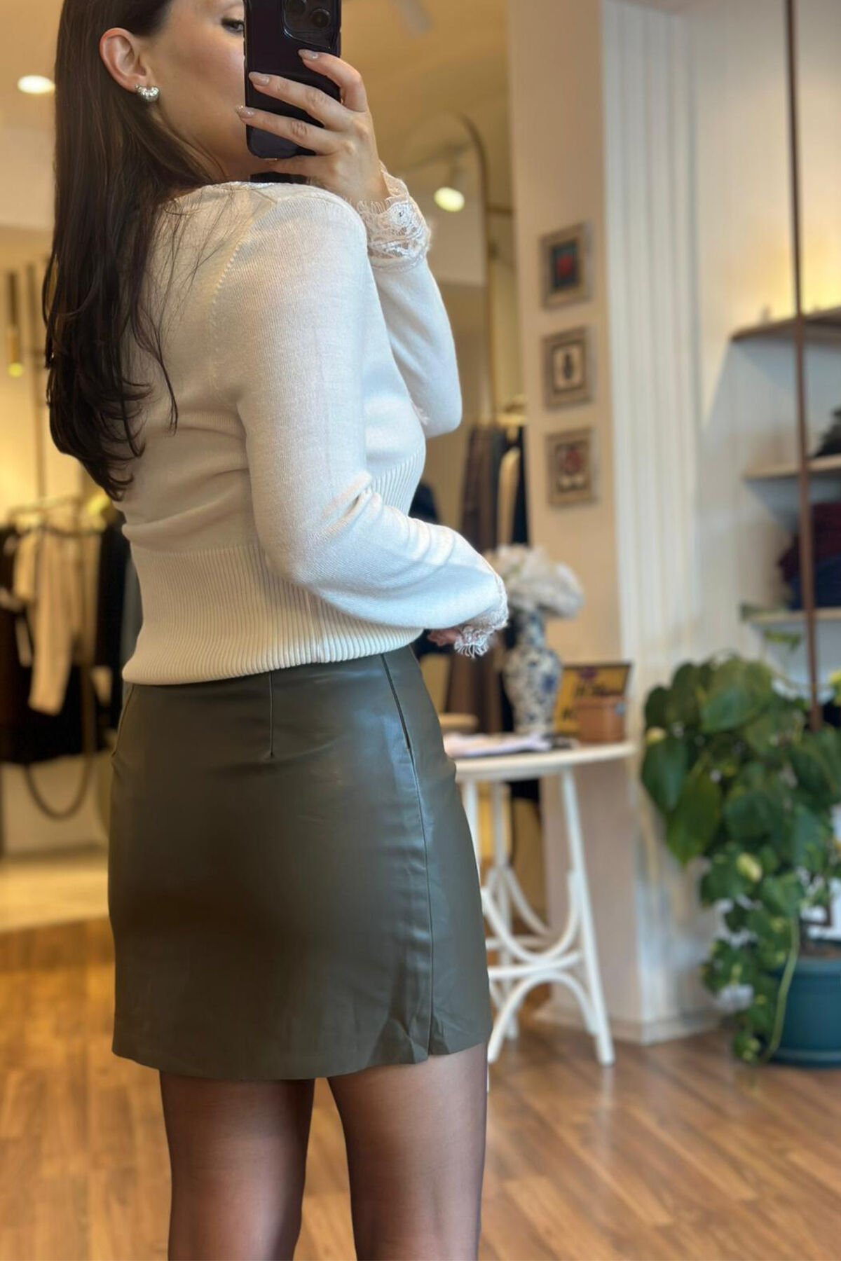 Haki deri eteğin iç astarı şort şeklinde üretilmiştir,hem şık hem rahat bir görüntü bu üründe sizi bekliyor.
