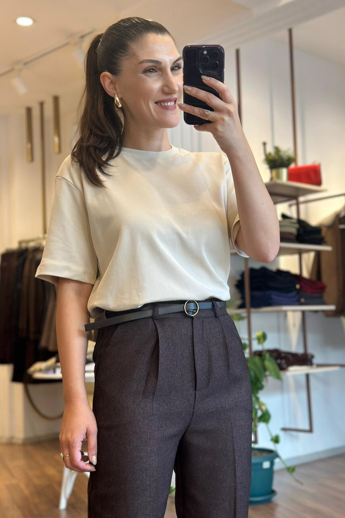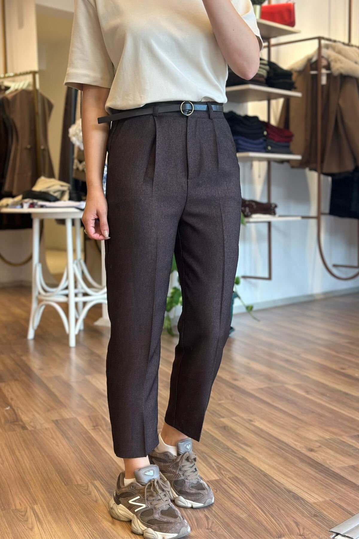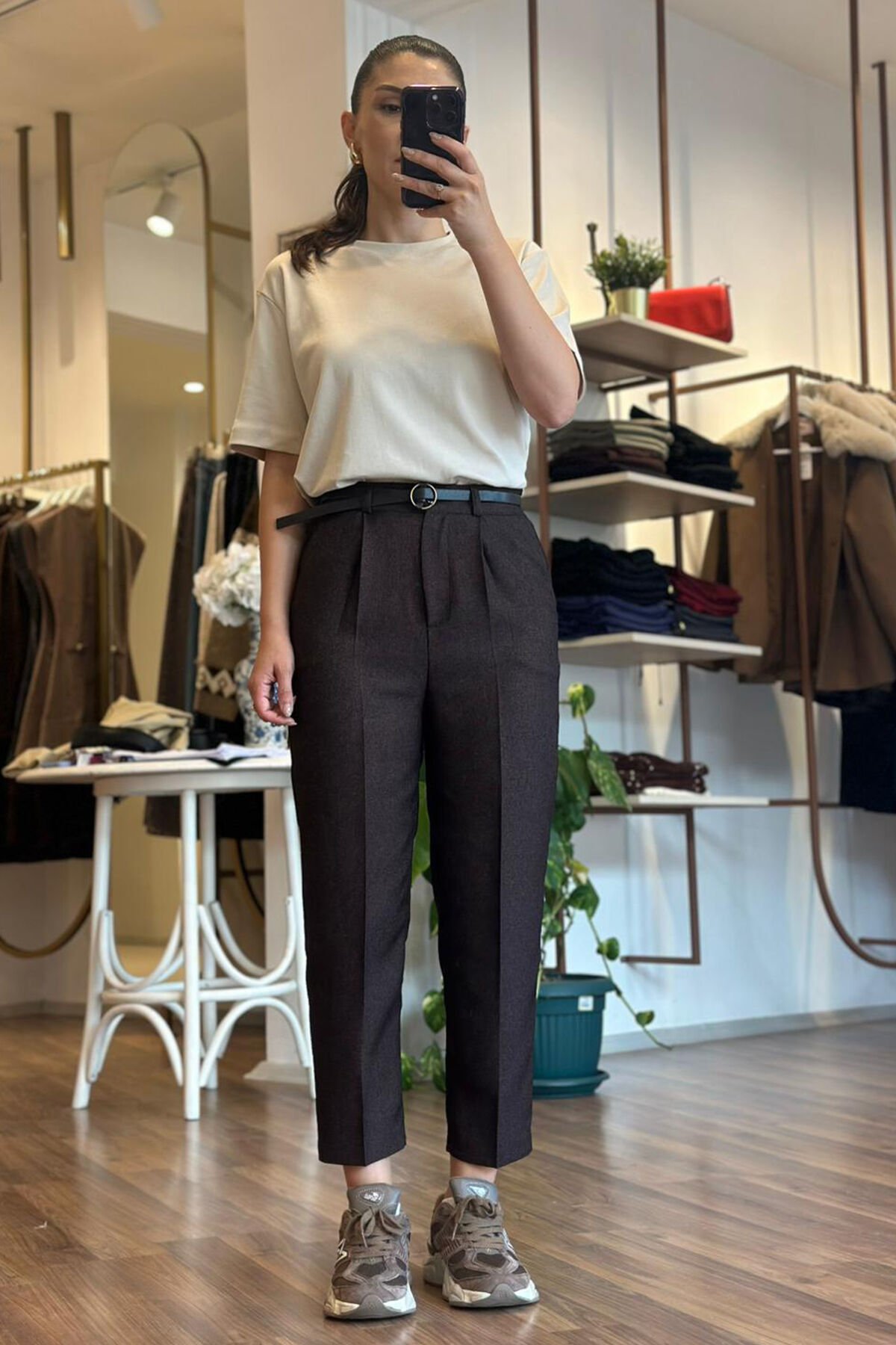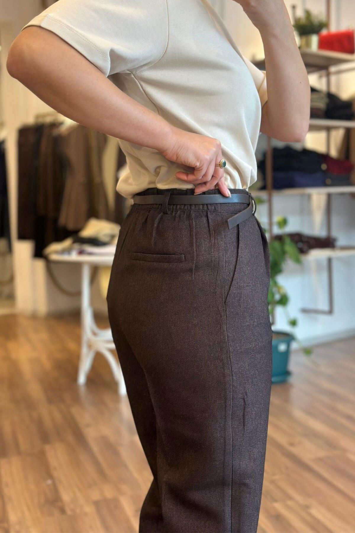 Yün dokulu beli lastikli bu kumaş pantolon rahatlığınız ve şıklığınız için tasarlandı.