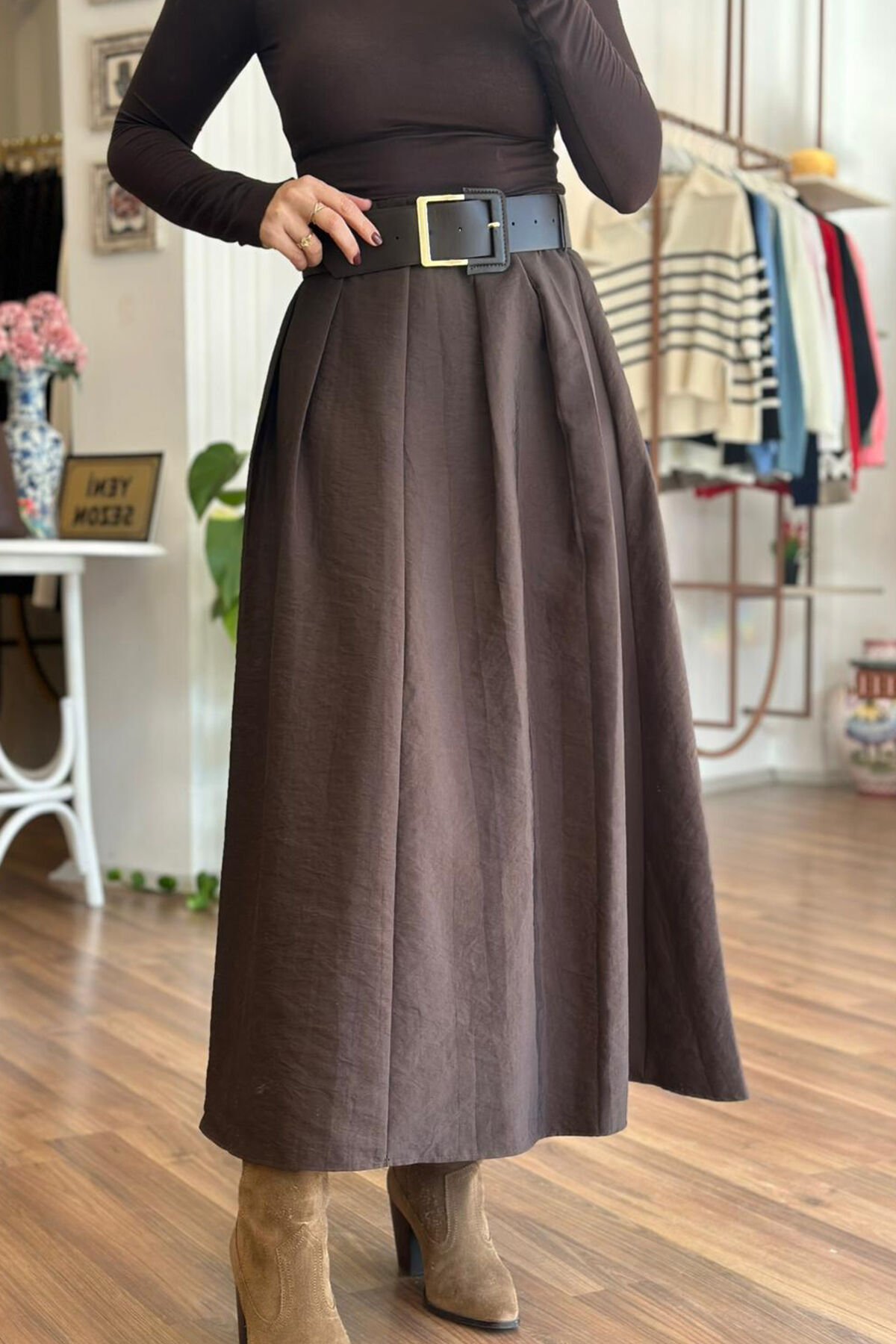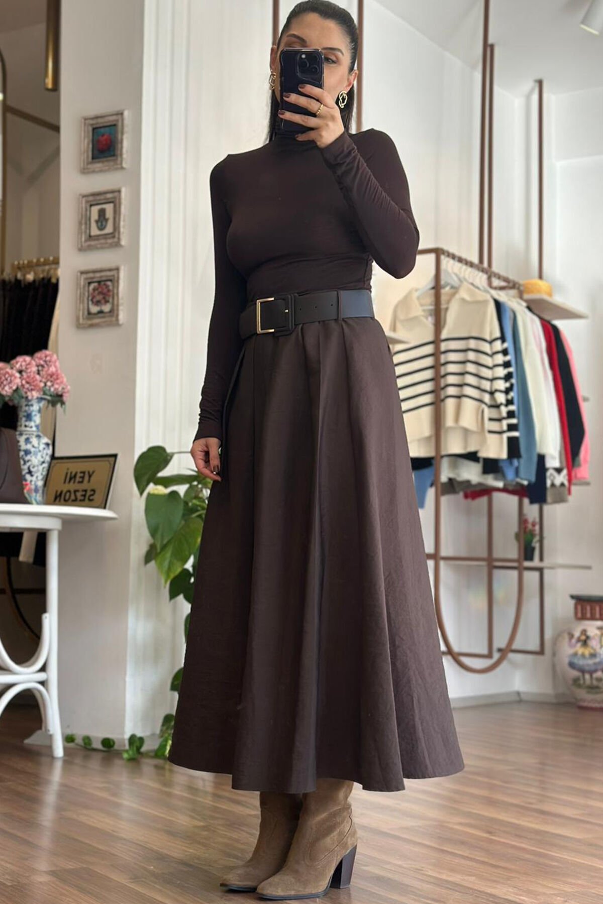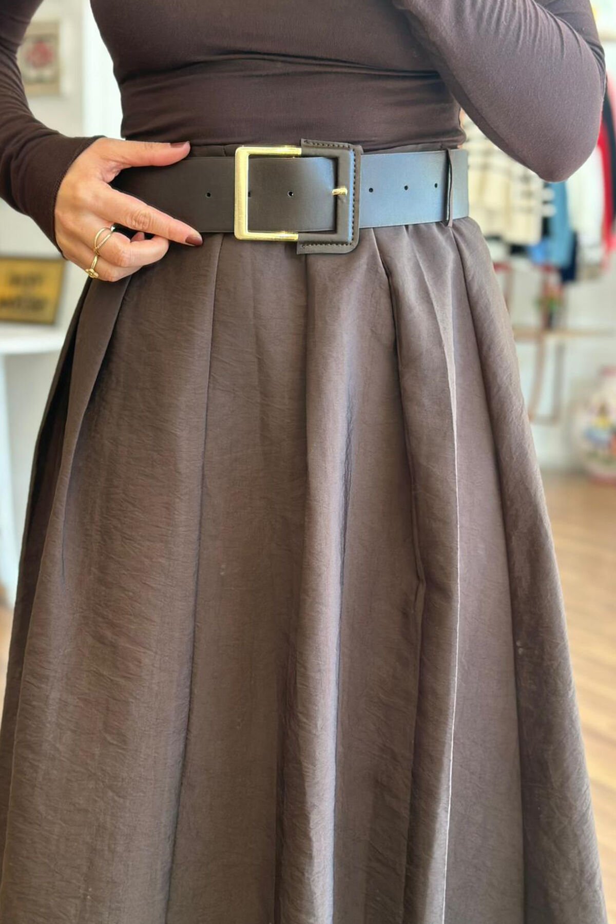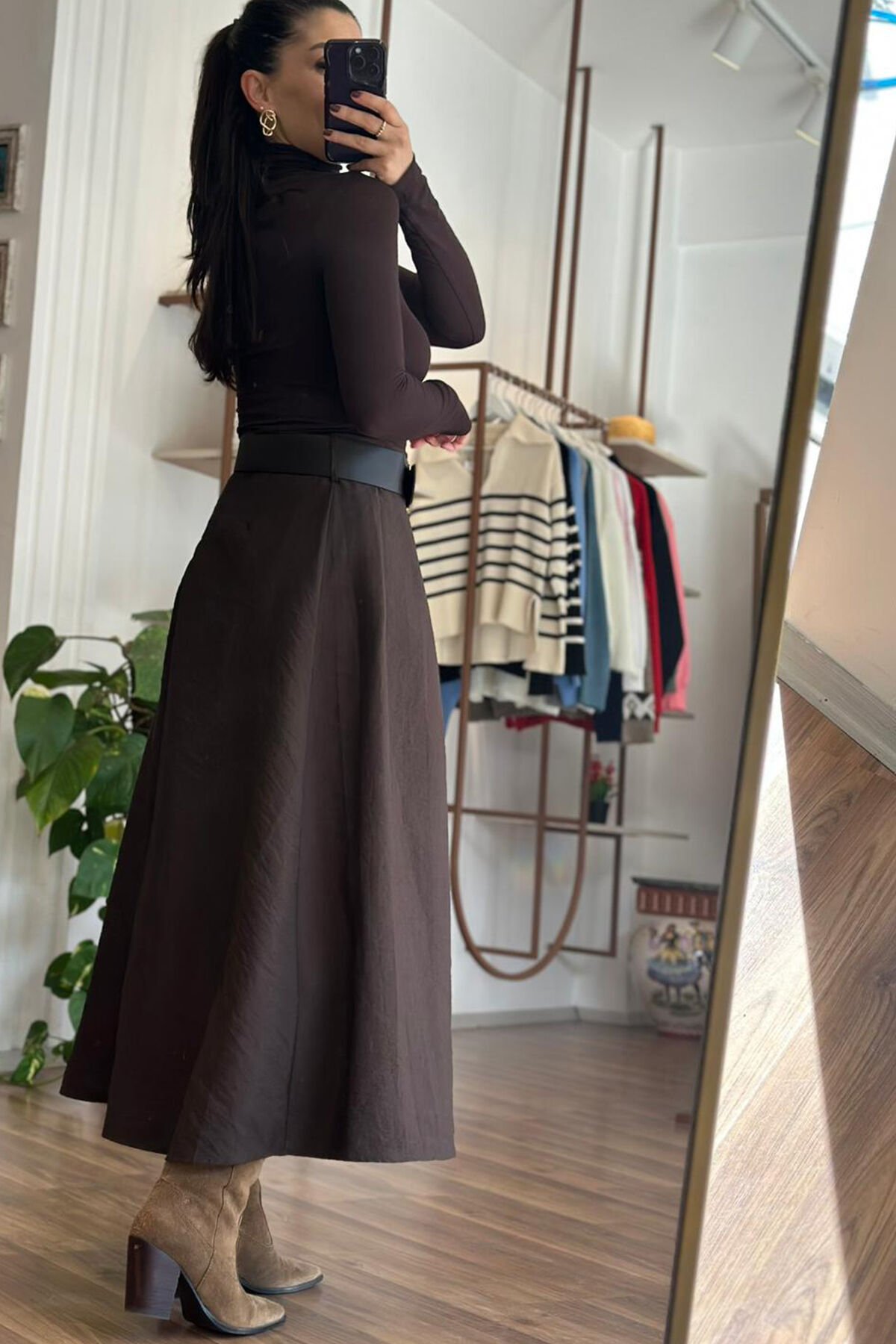 Yüksek bel kendinden kemerli siyah etek, kesimi ve kumaşı ile sezonun yıldızı oldu bile. Kemer ürüne aittir.