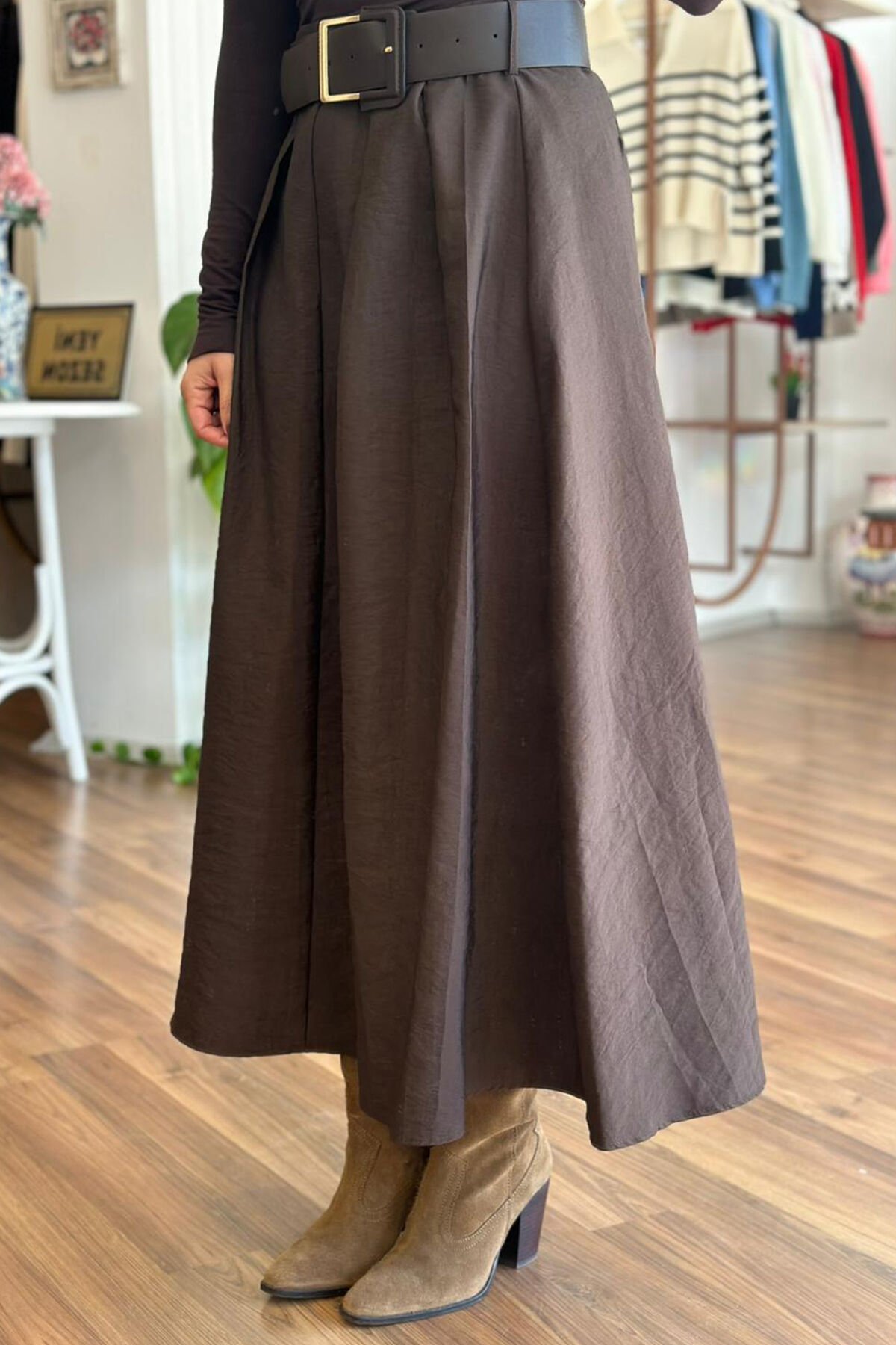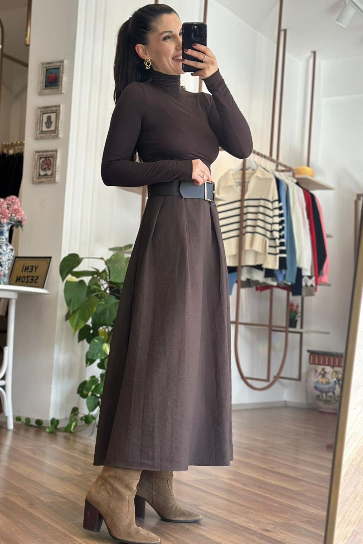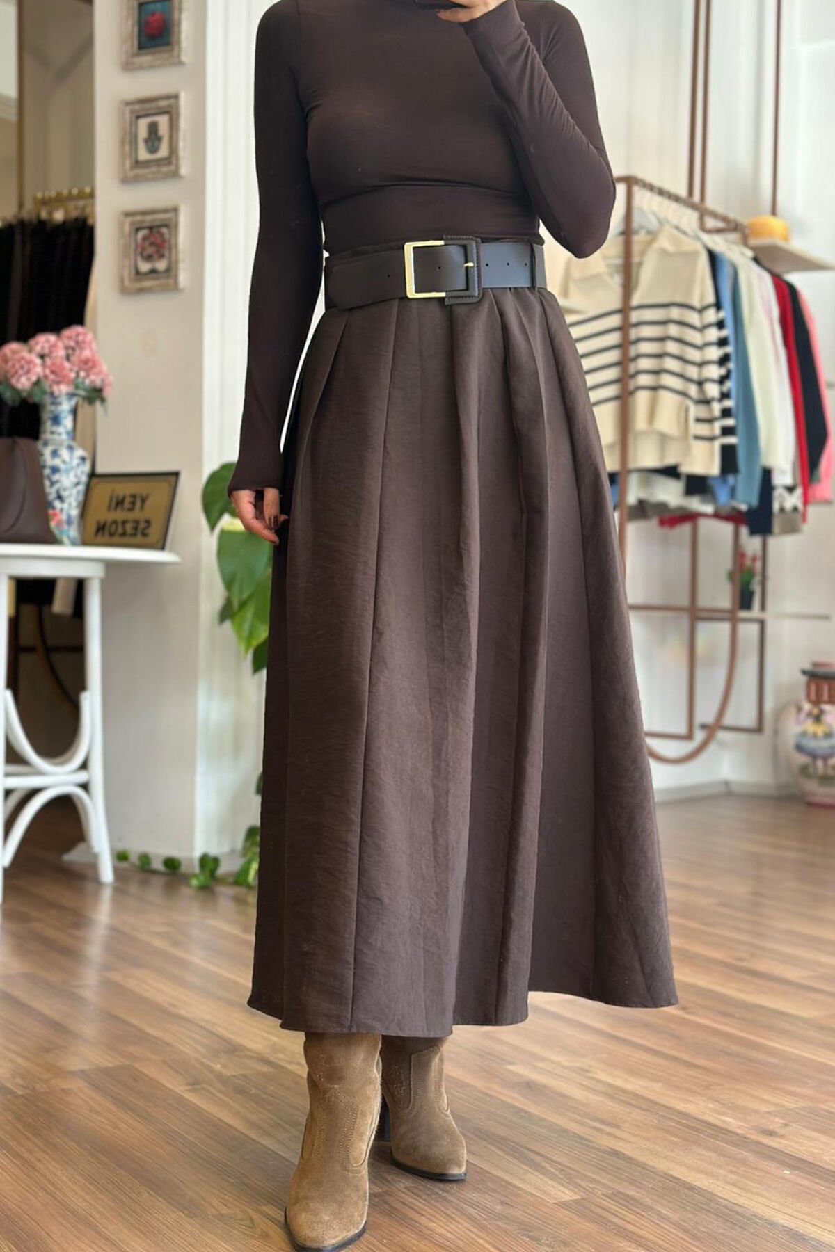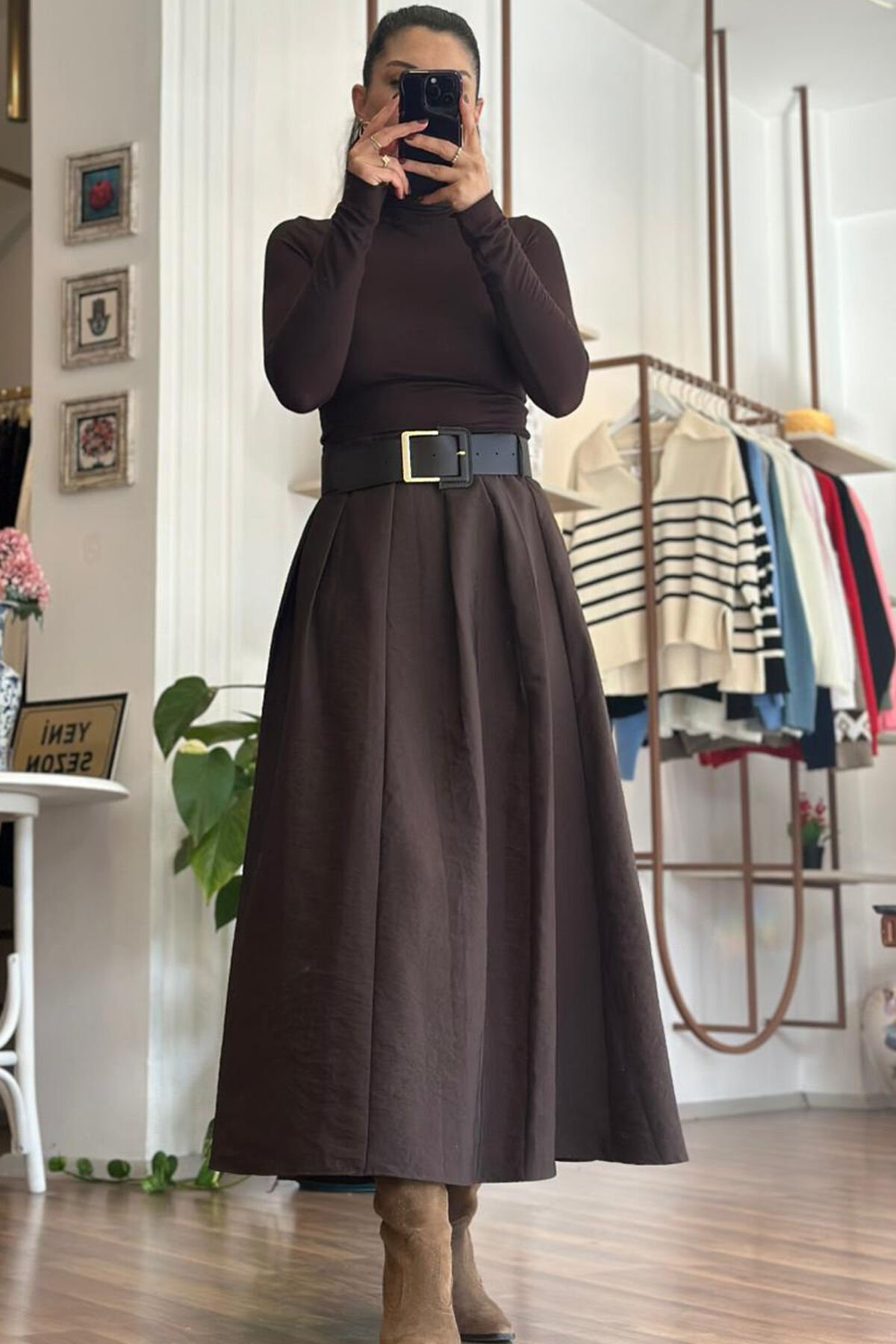Yüksek bel kendinden kemerli siyah etek, kesimi ve kumaşı ile sezonun yıldızı oldu bile. Kemer ürüne aittir.