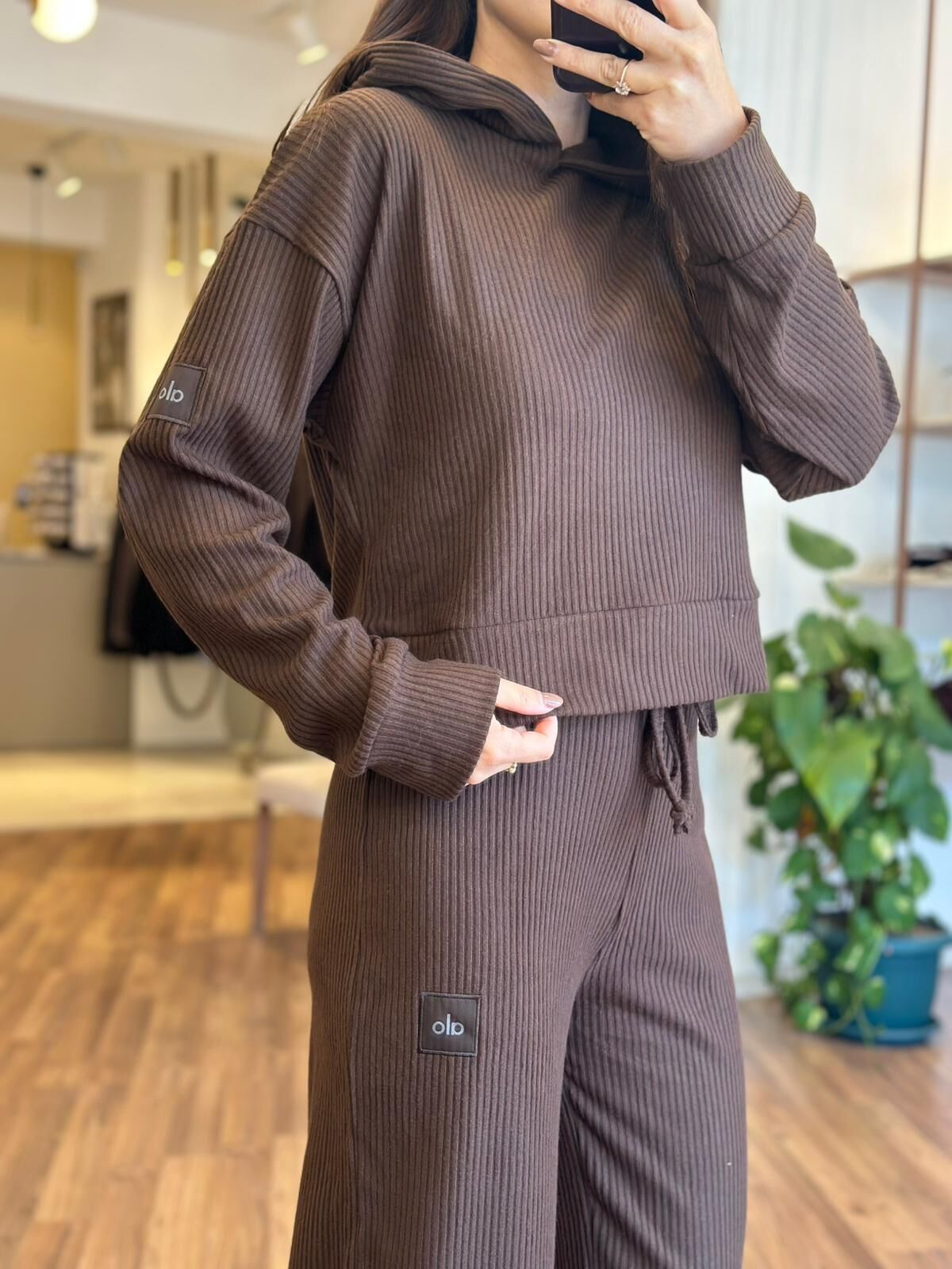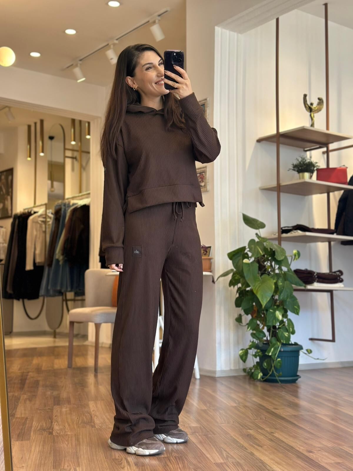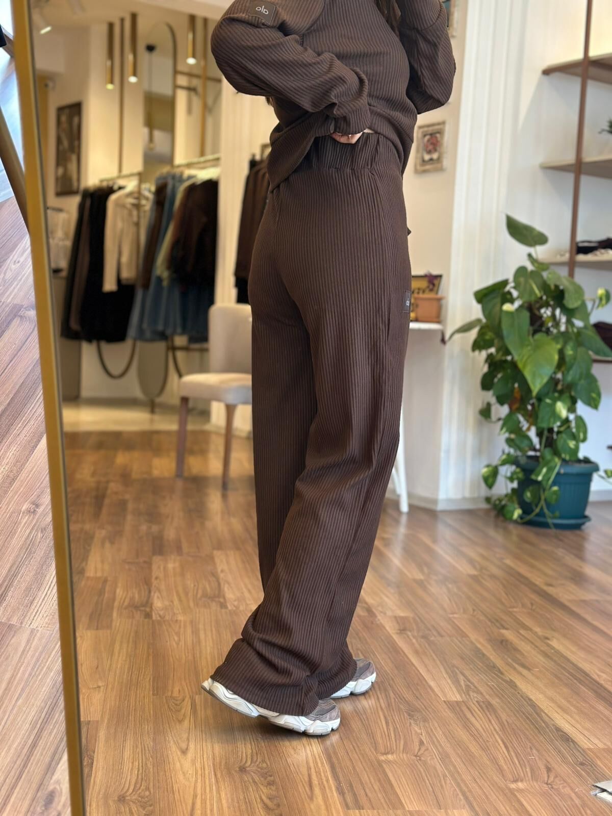 Kahverengi yün dokulu fitilli takım, şıklığı ve konforu bir arada sunar. Yumuşak dokusu ve fitilli detaylarıyla hem sıcak tutar hem de zarif bir görünüm sağlar.