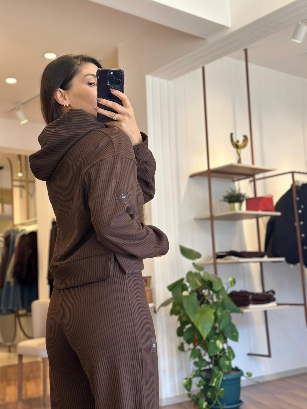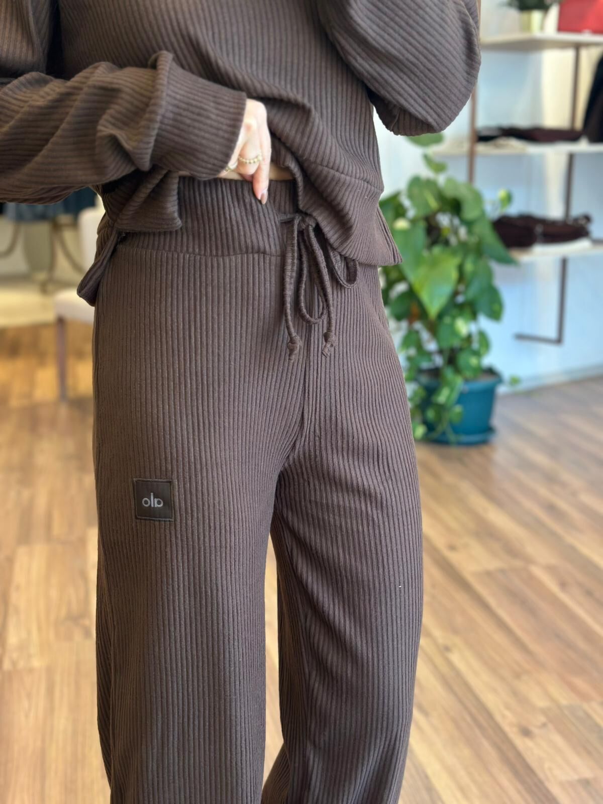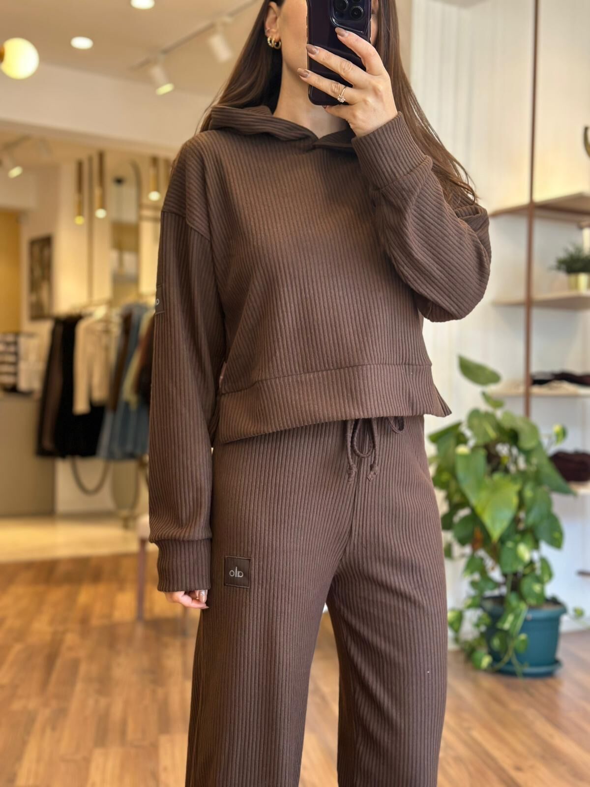Kahverengi yün dokulu fitilli takım, şıklığı ve konforu bir arada sunar. Yumuşak dokusu ve fitilli detaylarıyla hem sıcak tutar hem de zarif bir görünüm sağlar.