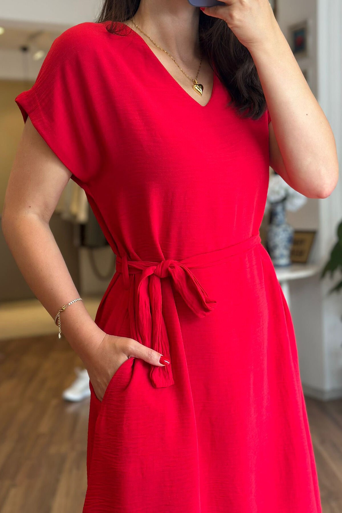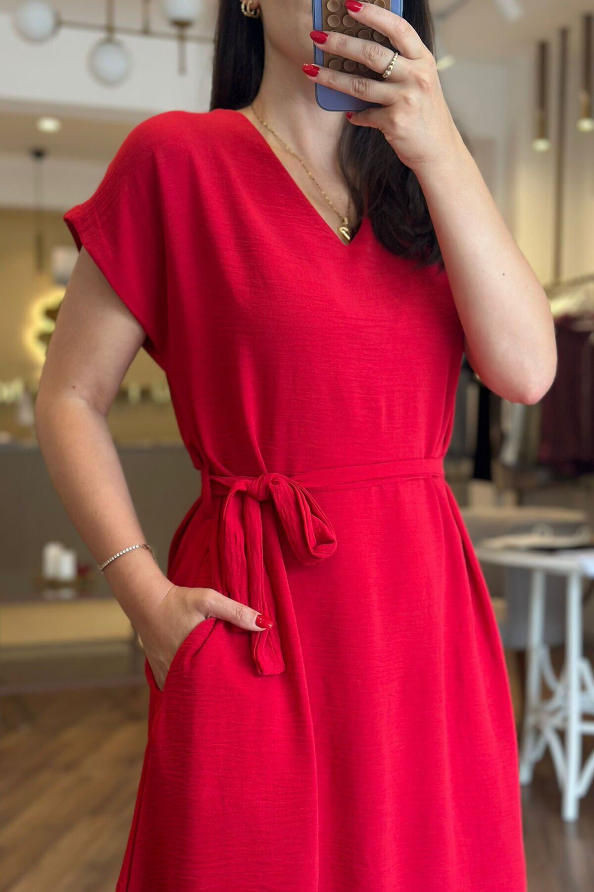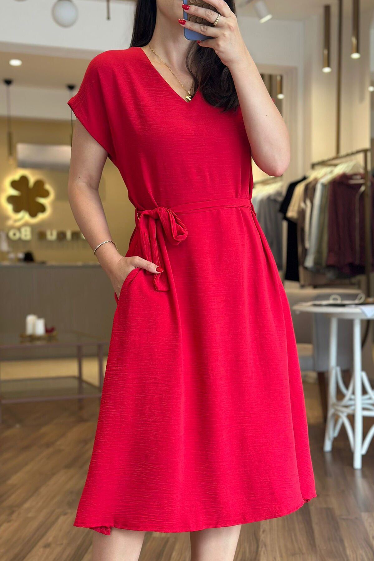 Bu kırmızı midi boy elbise, kırışmayan ve kolay kuruyan özel aerobin kumaştan yapılmıştır. Günlük kullanıma uygun olan bu elbise, şık bir kuşak detayıyla tamamlanmıştır. Her durumda rahatlıkla kullanabileceğiniz pratik bir seçenektir.
