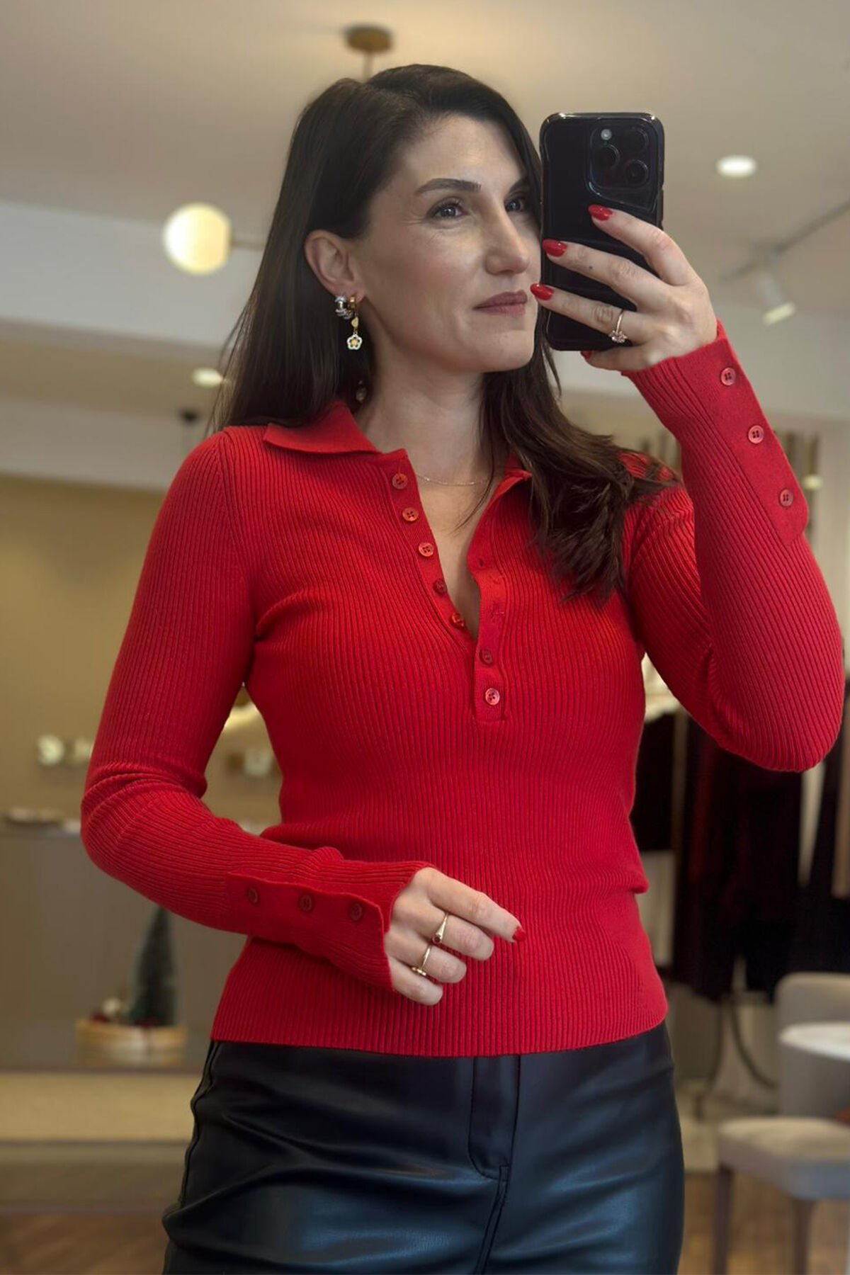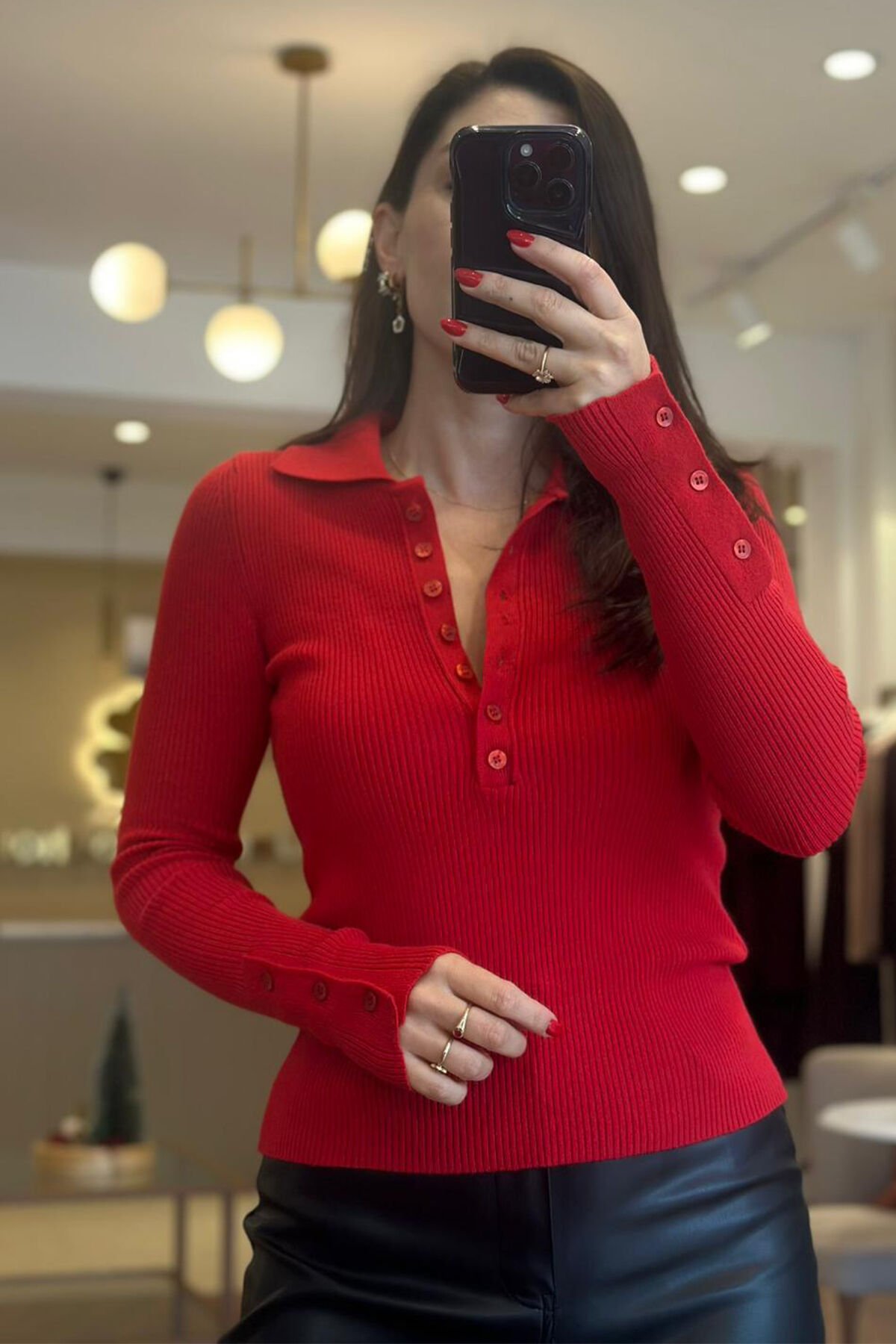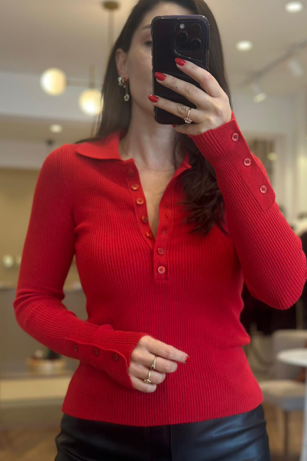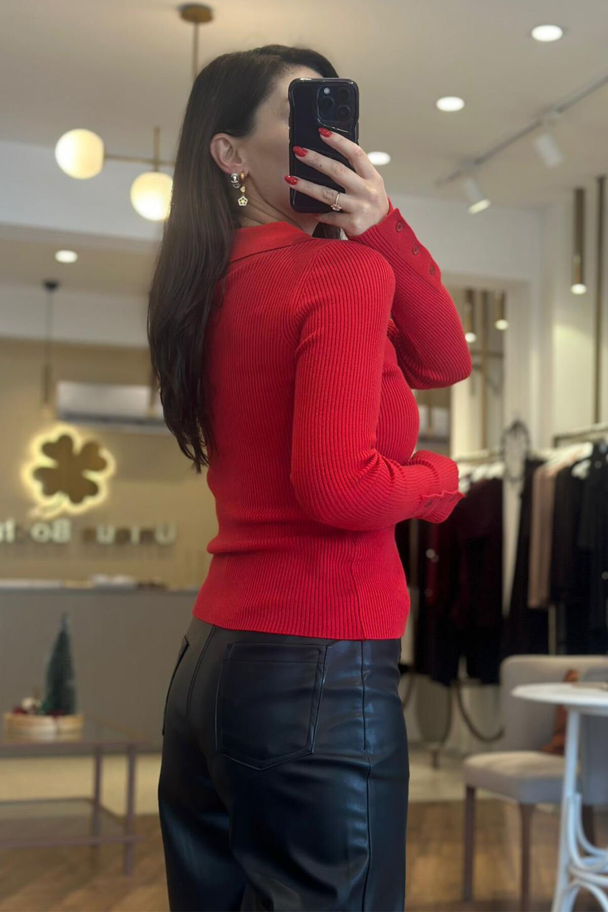 Kırmızı standart beden önden düğmeli fitilli triko kombinlerinize renk katmak için hazır.