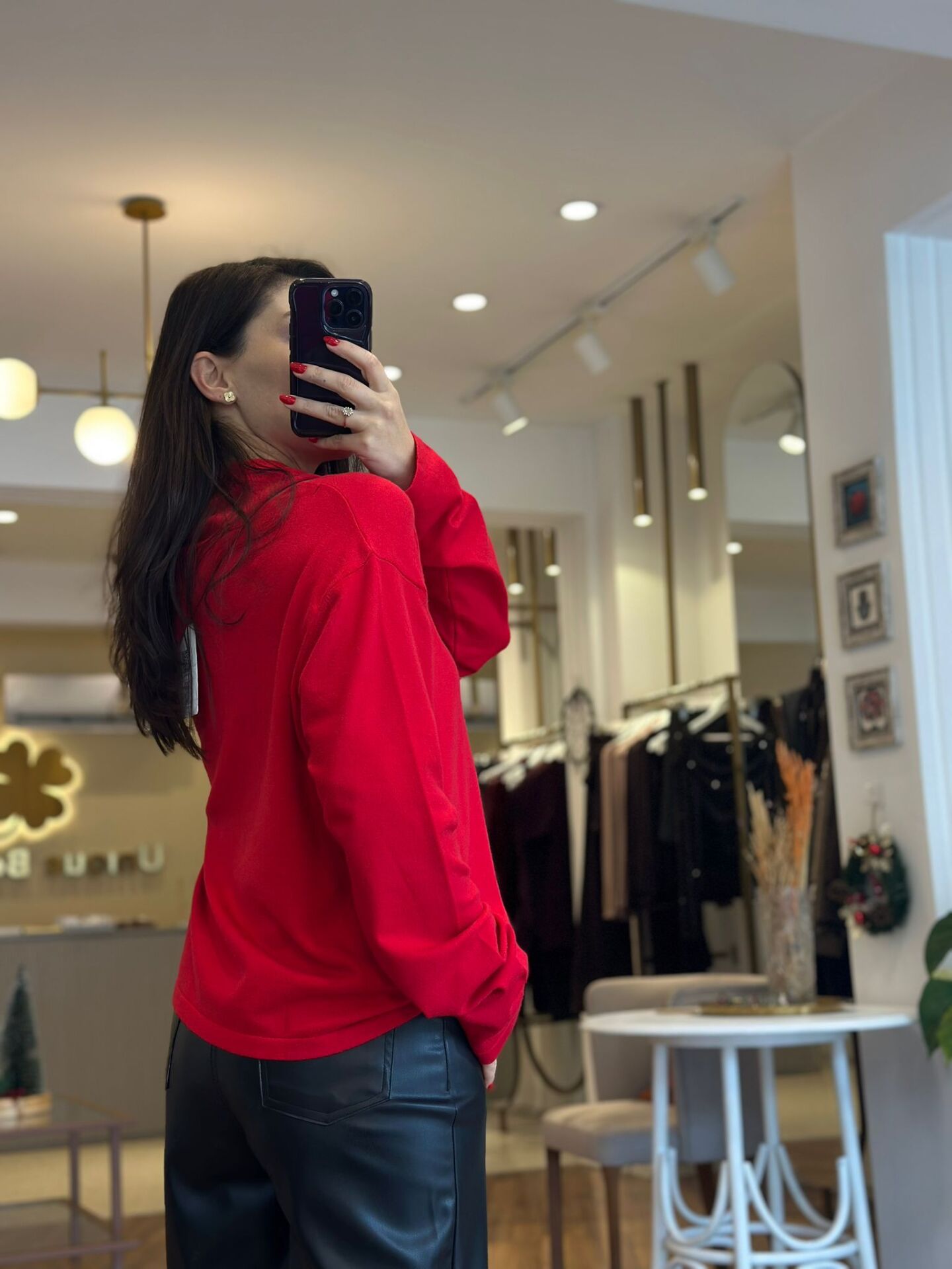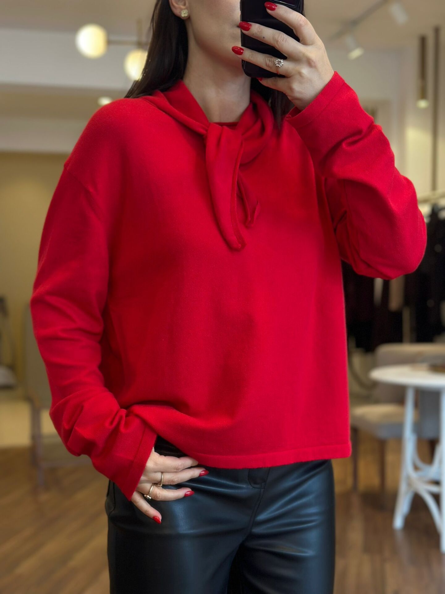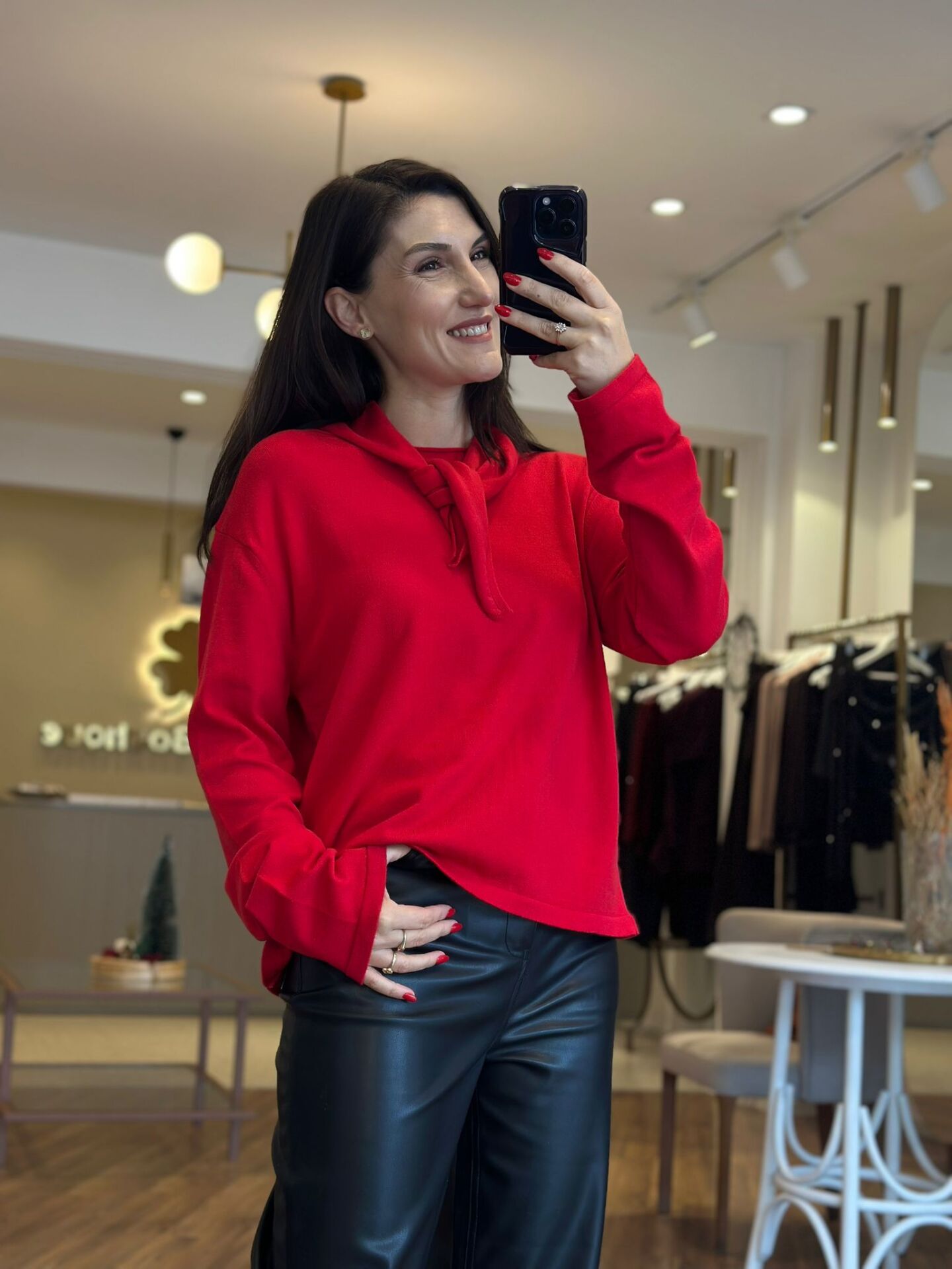 Kırmızı std beden fular detaylı kazak kombinlerinize renk katmak için hazır.