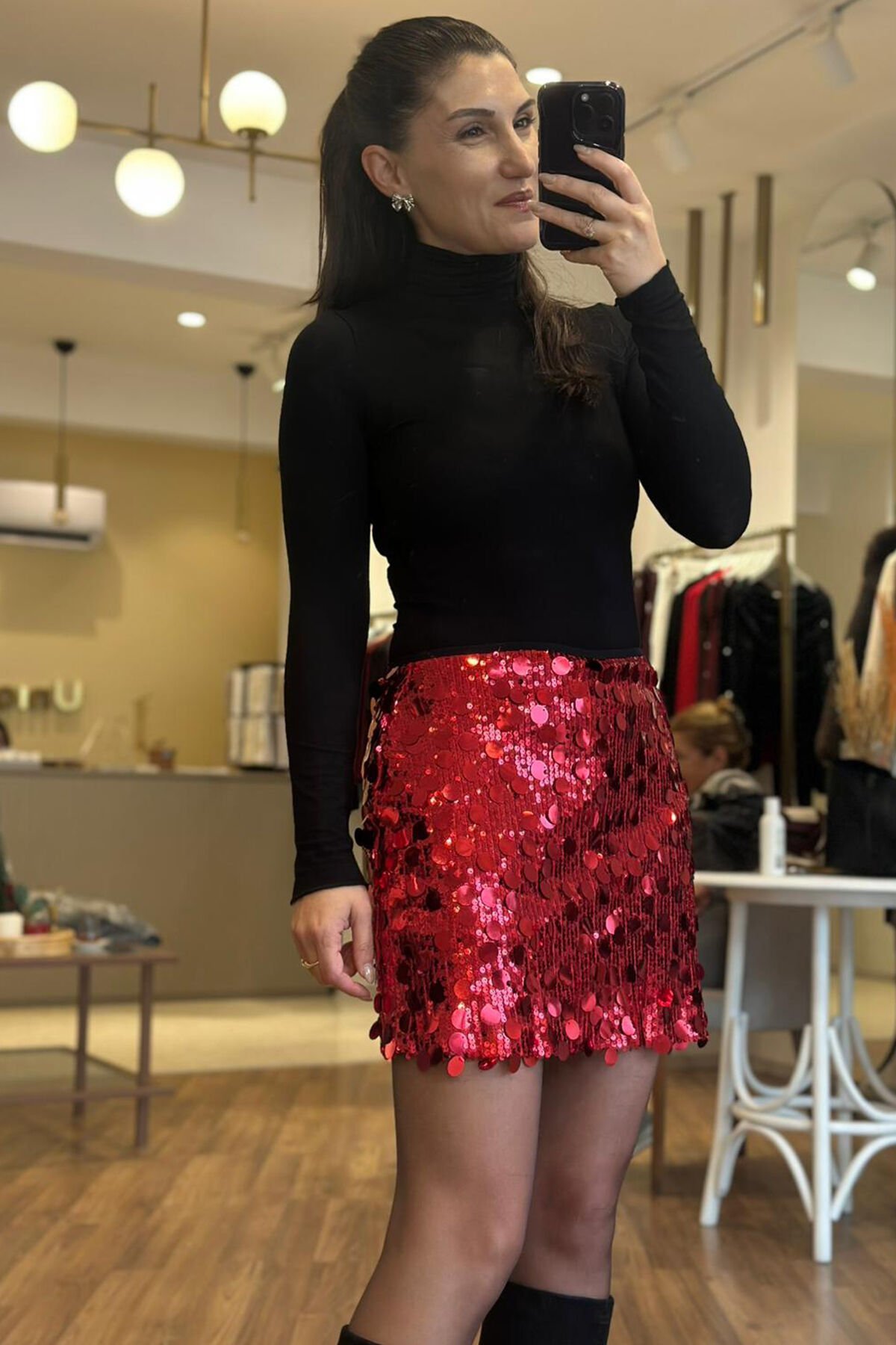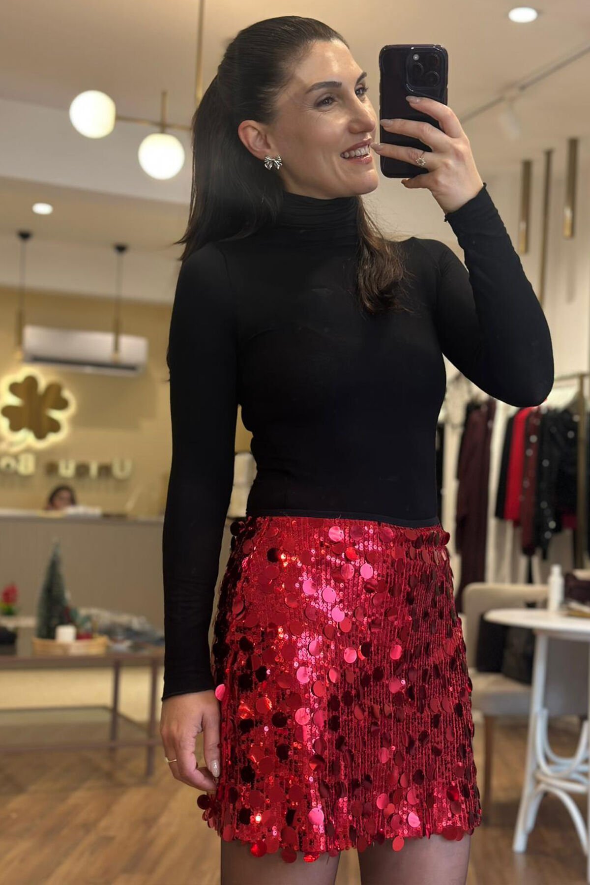 Gece şıklığının favorisi olmaya aday bu kırmızı pullu etek ,yoğun parlak dokusu ve modern kesimiyle göz alıcı bir stil sunuyor. Hem şık bluzlarla hem de basic üstlerle kolayca kombinlenebilir.