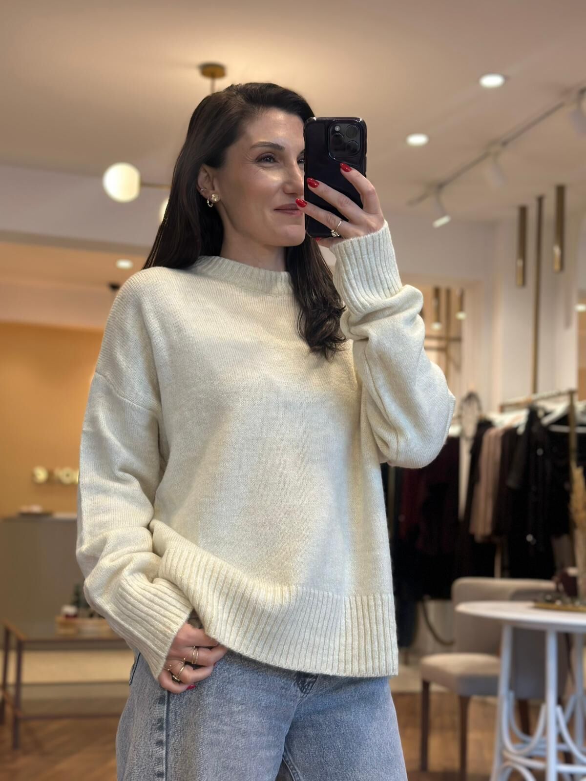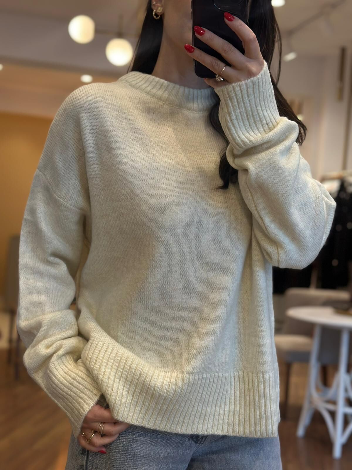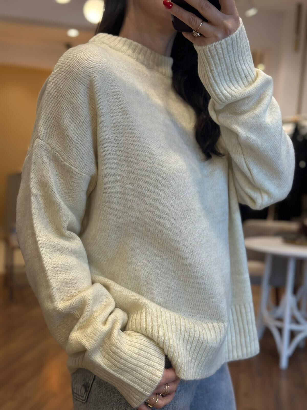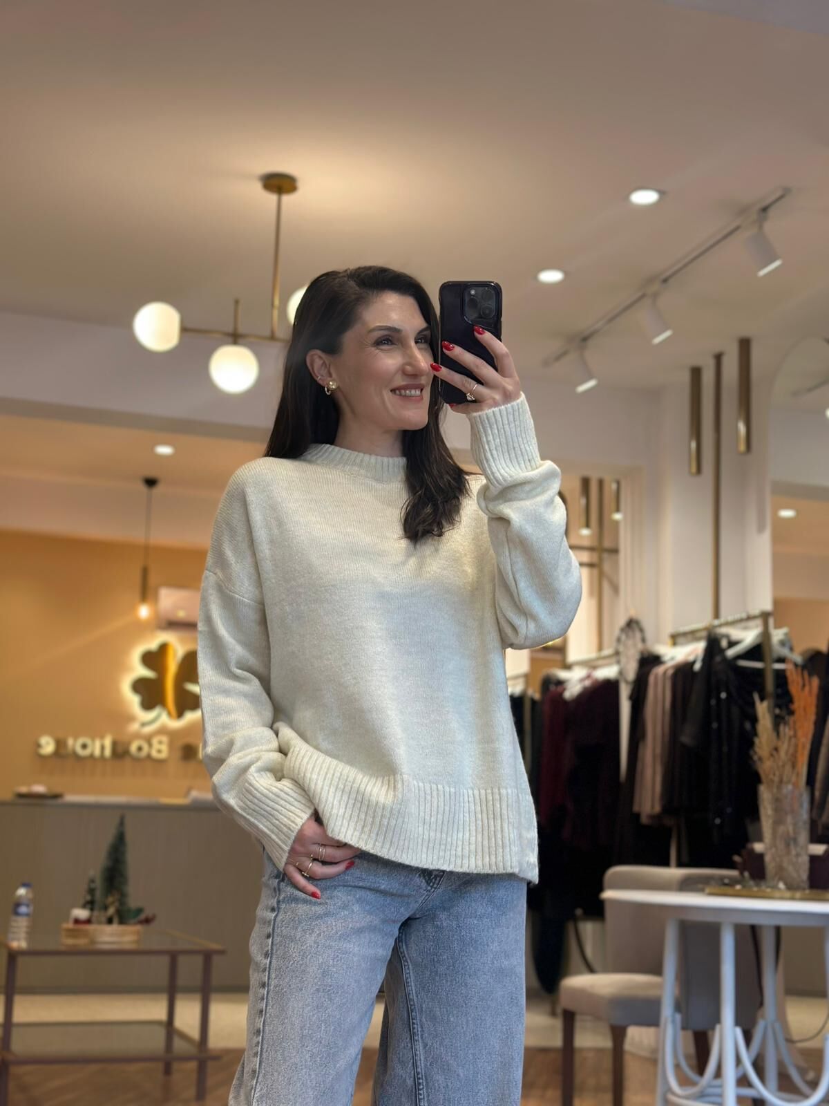 Model üzerindeki kazak krem rengi,standart beden ve rahat kalıptadır. Giyçık kombinleriniz için vazgeçilmez olacak.