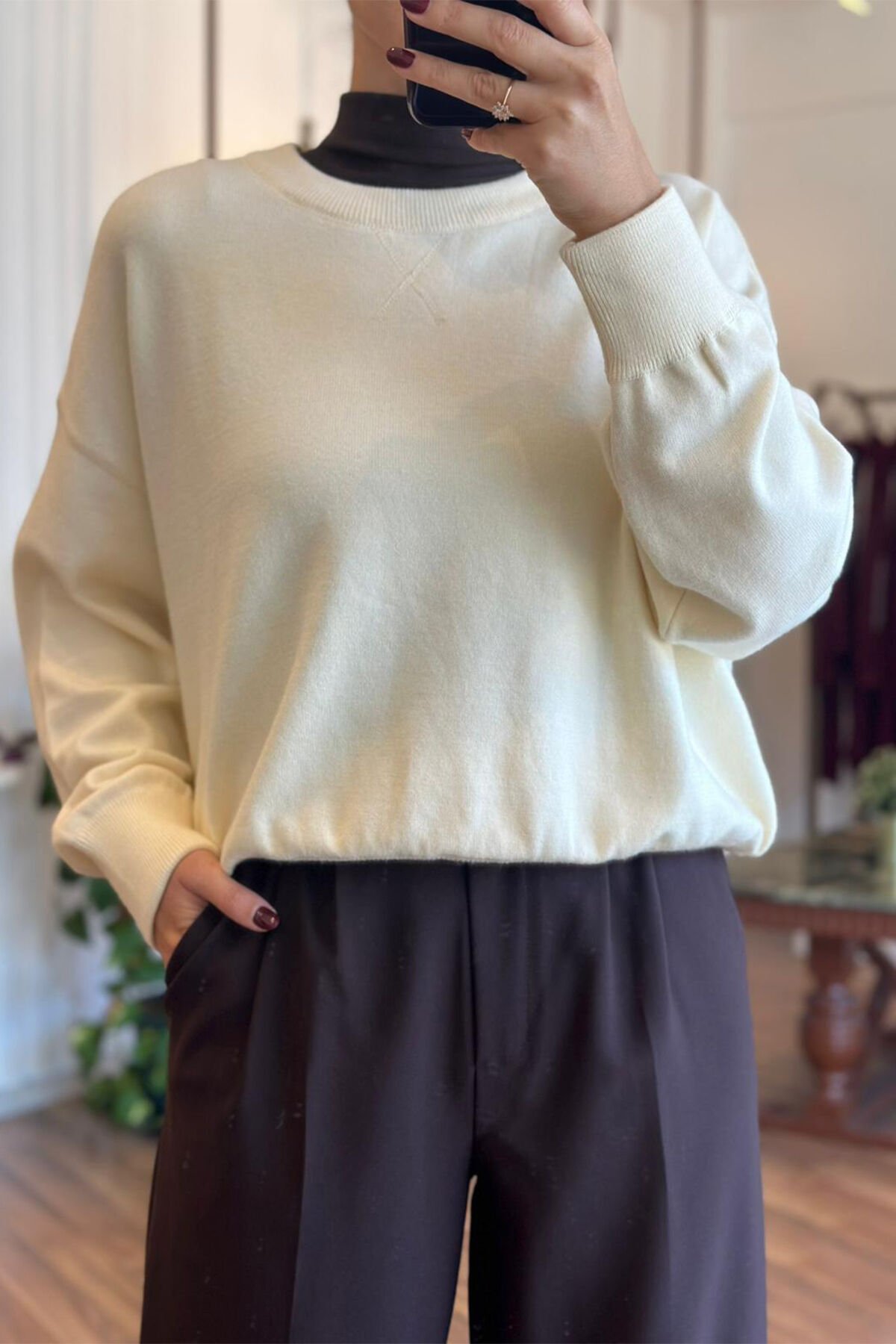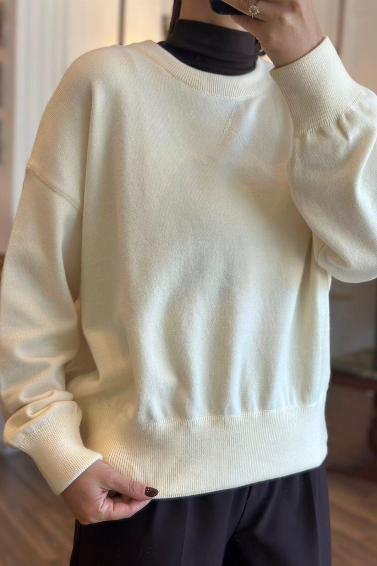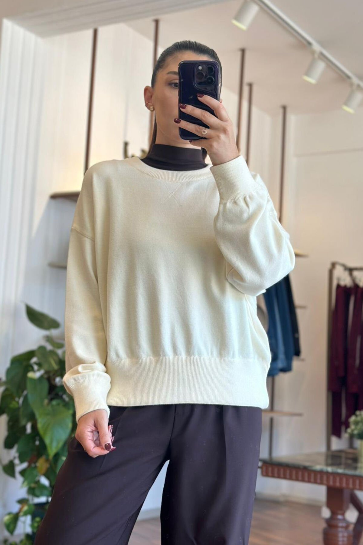 Bu yumuşak dokulu standart beden kazak,krem rengi bisiklet yaka detayıyla şıklığınıza şıklık katıyor. Sıcak tutan kumaşı ve rahat kesimiyle her mevsim rahatlıkla kullanabilirsiniz. Gardrobunuzun vazgeçilmezi olmaya aday!