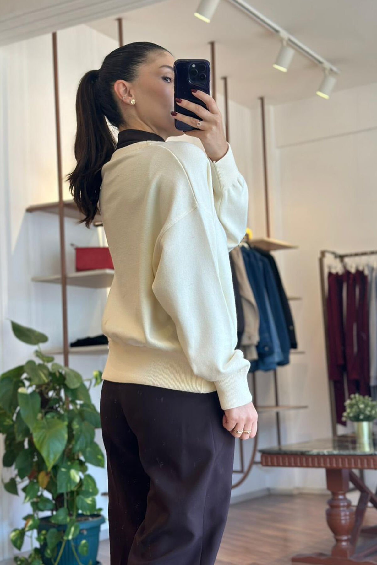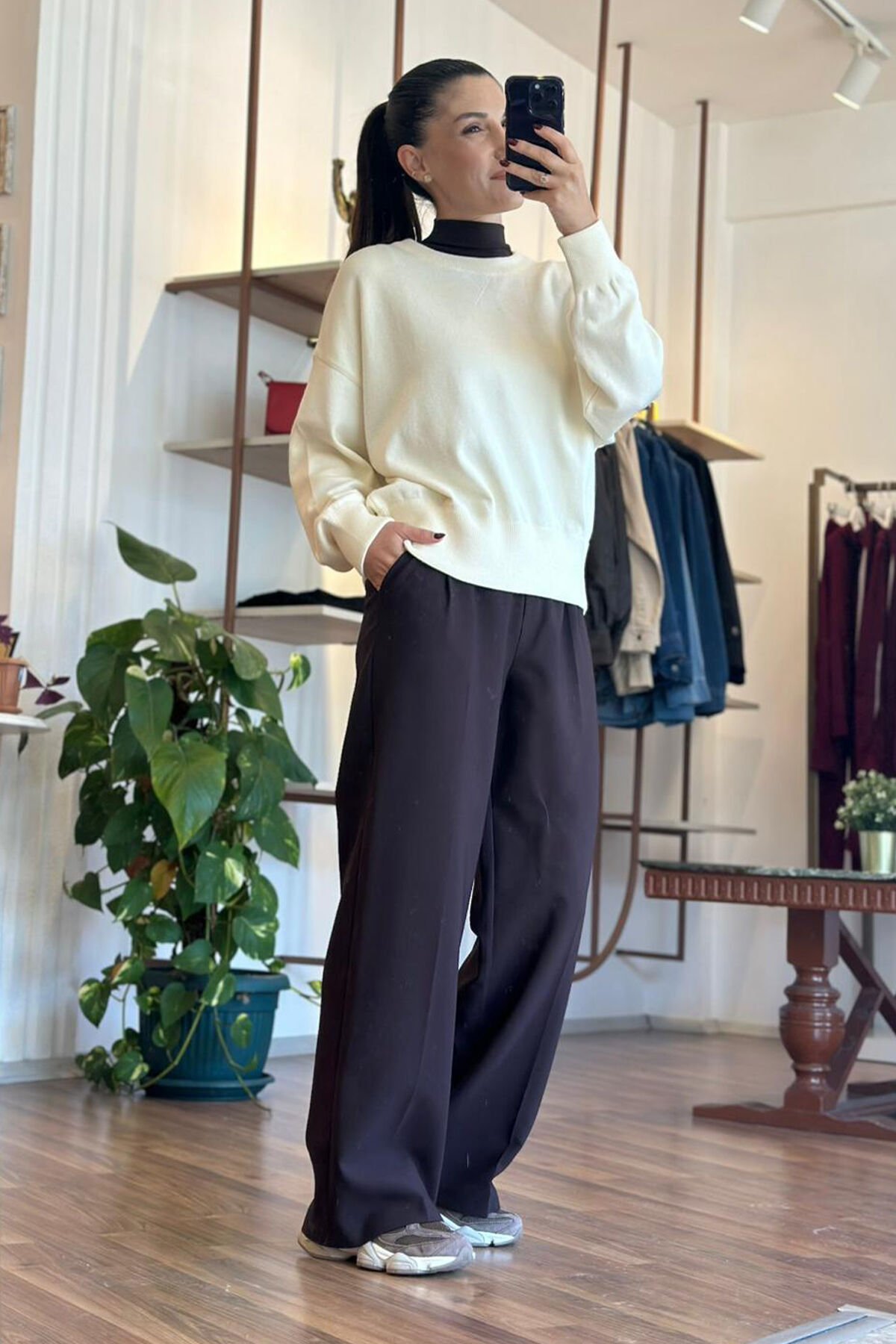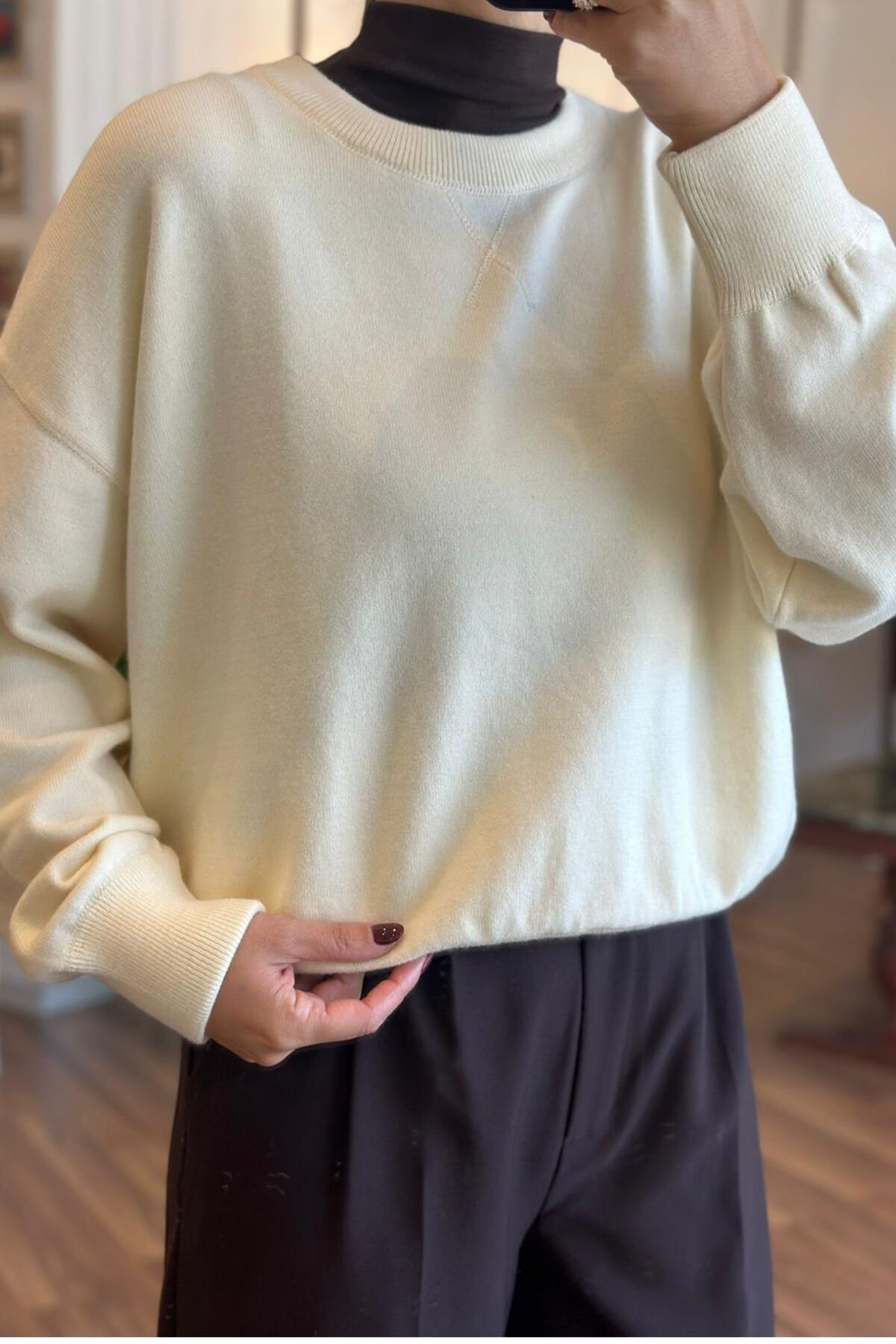 Bu yumuşak dokulu standart beden kazak,krem rengi bisiklet yaka detayıyla şıklığınıza şıklık katıyor. Sıcak tutan kumaşı ve rahat kesimiyle her mevsim rahatlıkla kullanabilirsiniz. Gardrobunuzun vazgeçilmezi olmaya aday!