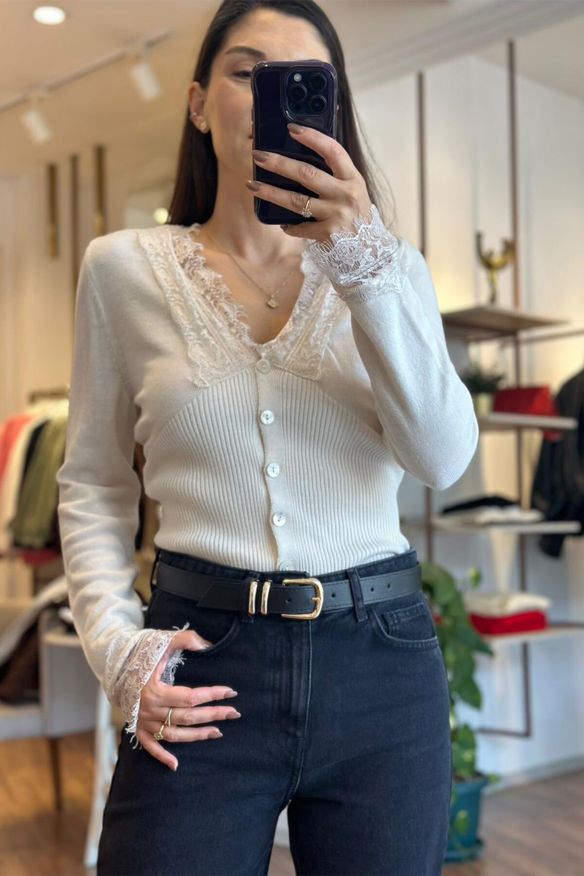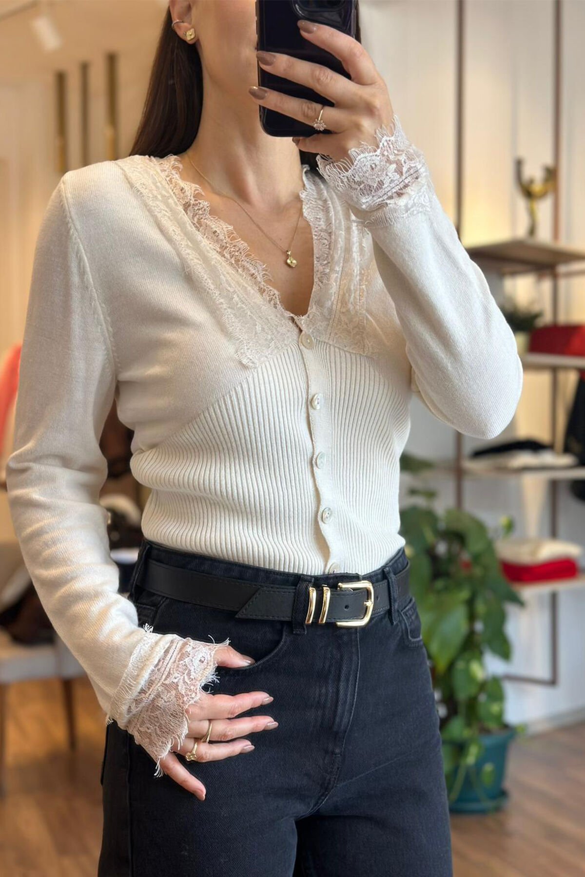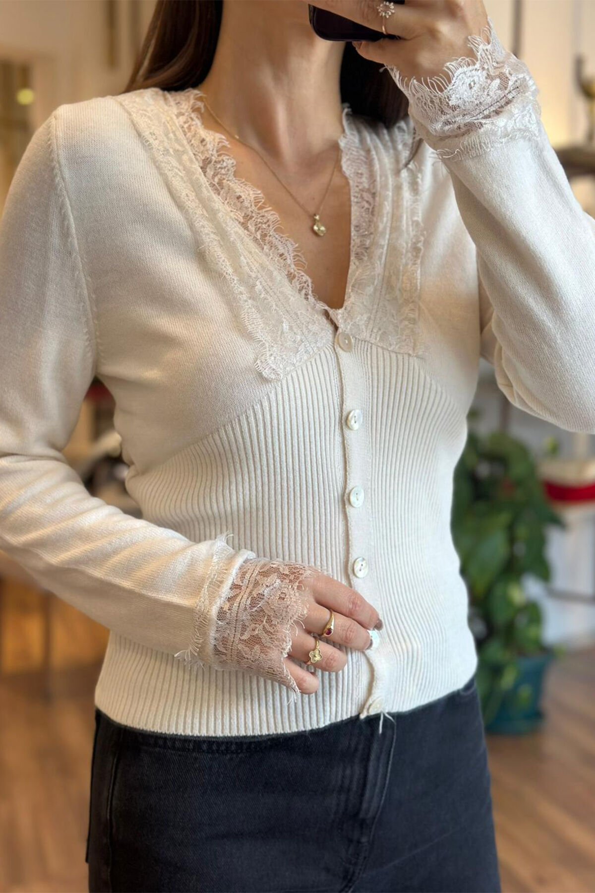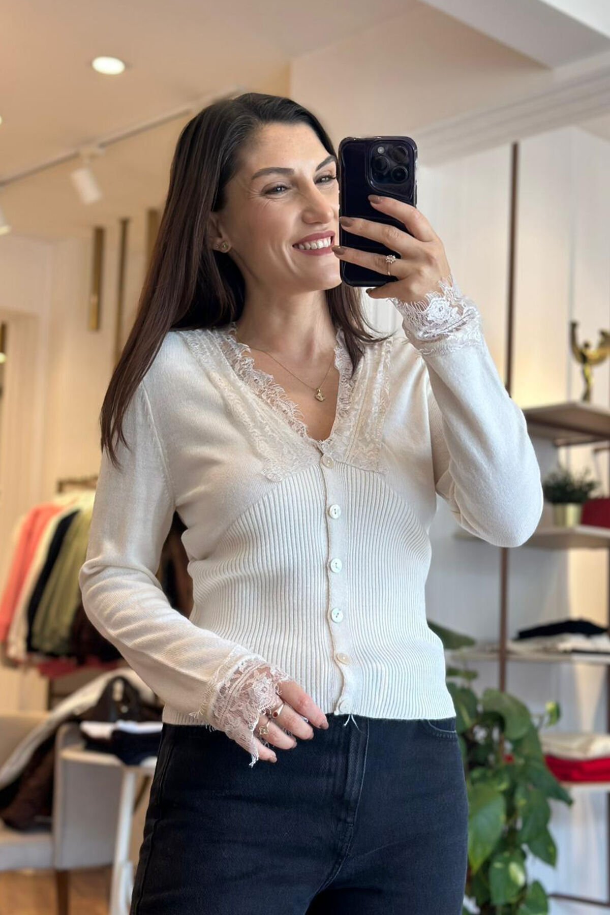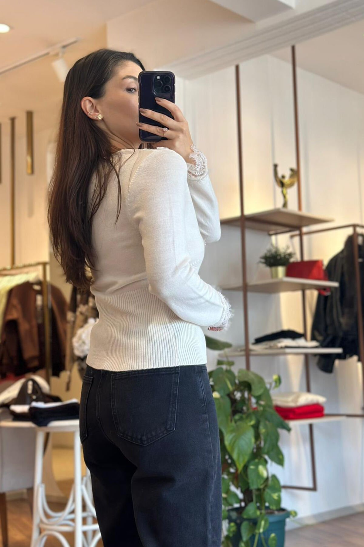 Krem rengi dantel detaylı standart beden triko, zarif tasarımı ve rahat kesimiyle şıklığı günlük hayata taşıyor. Yumuşak dokusuyla konfor sunarken, dantel detayları sayesinde feminen bir görünüm elde etmenizi sağlar. Hem klasik hem modern stil için ideal bir tercihtir.