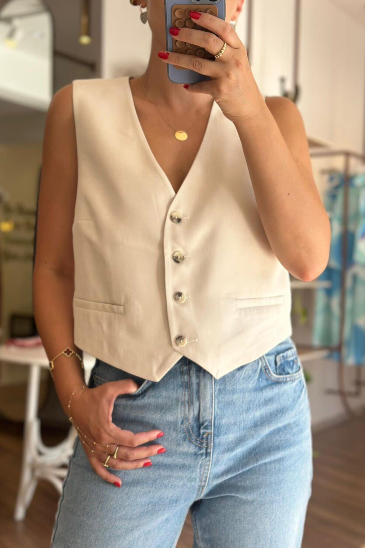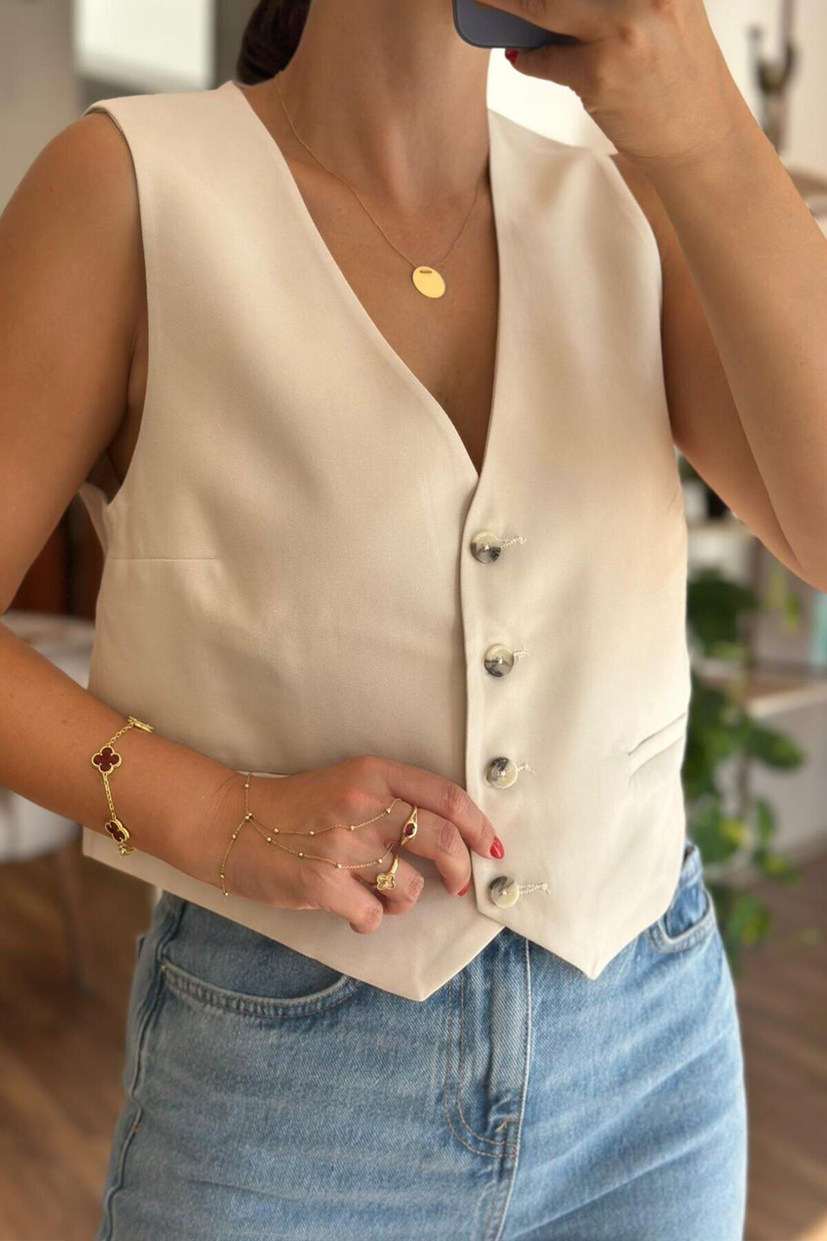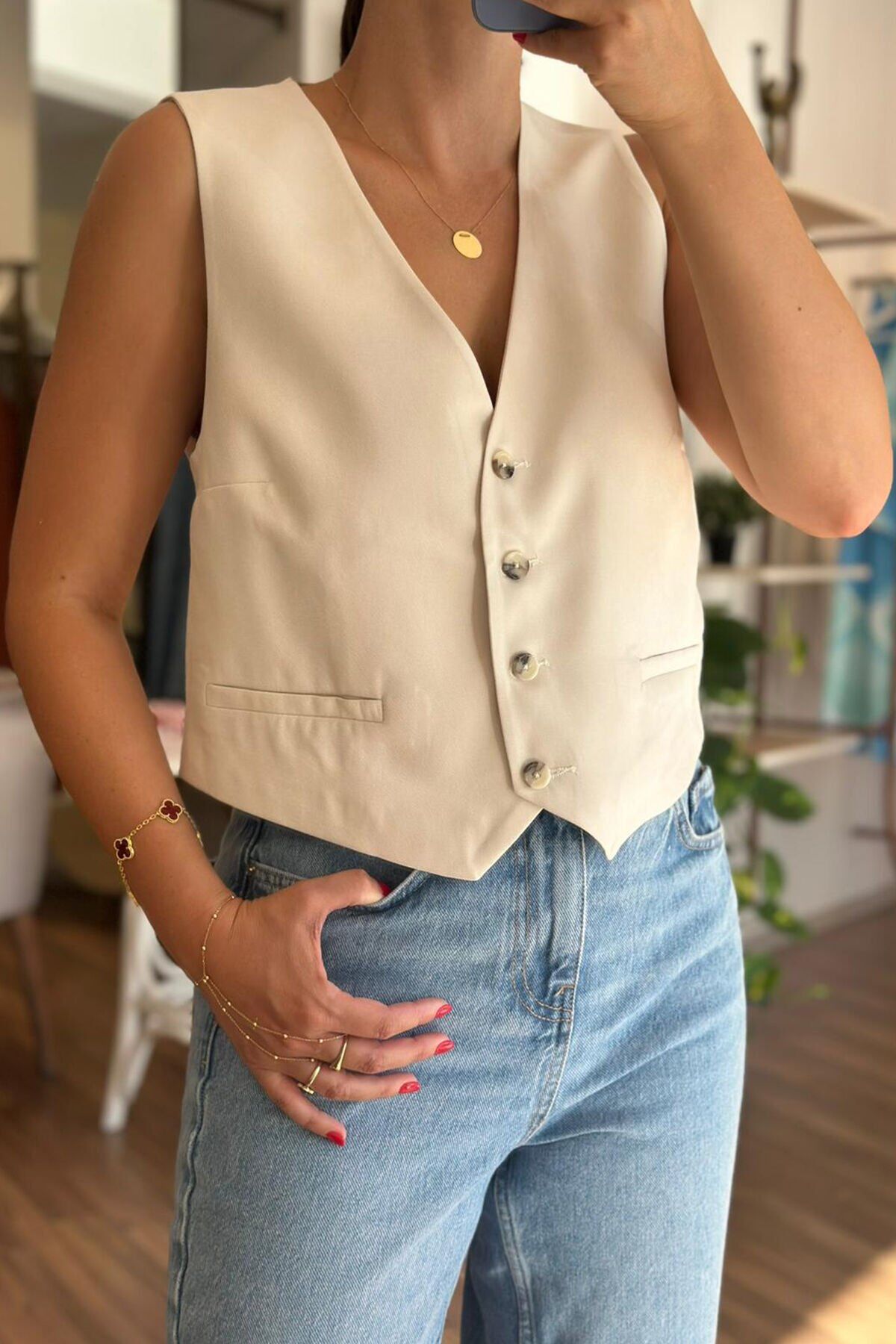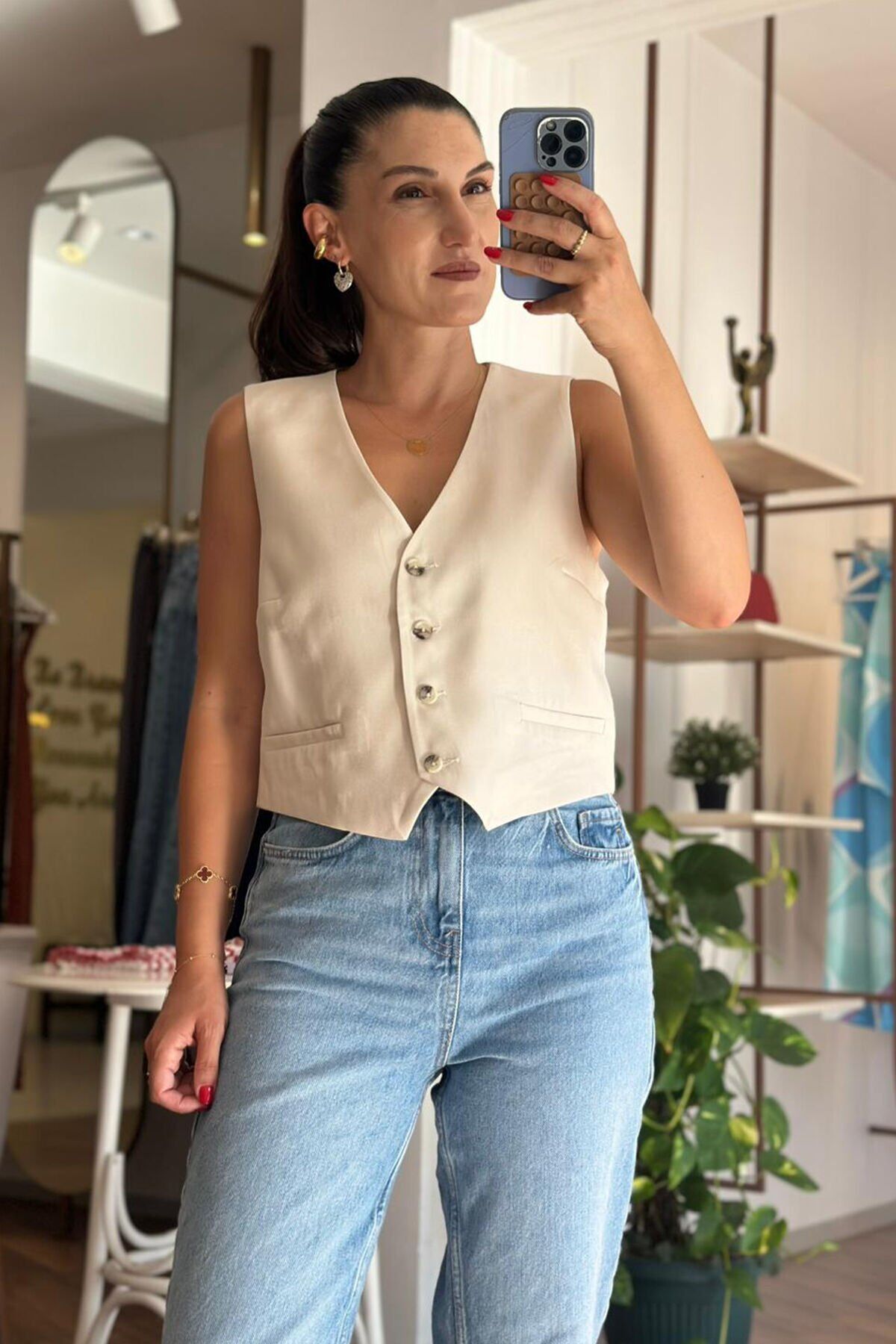 Bu şık keten yelek, iç astarlı tasarımı ile konforlu bir deneyim sunar. Krem rengi ve kemik düğmeleriyle modern ve şık bir görünüm elde edebilirsiniz. Hem gündelik hem de özel günlerde rahatlıkla kullanabilir, tarzınızı tamamlayabilirsiniz.