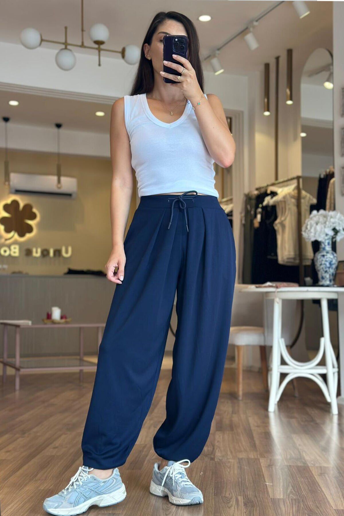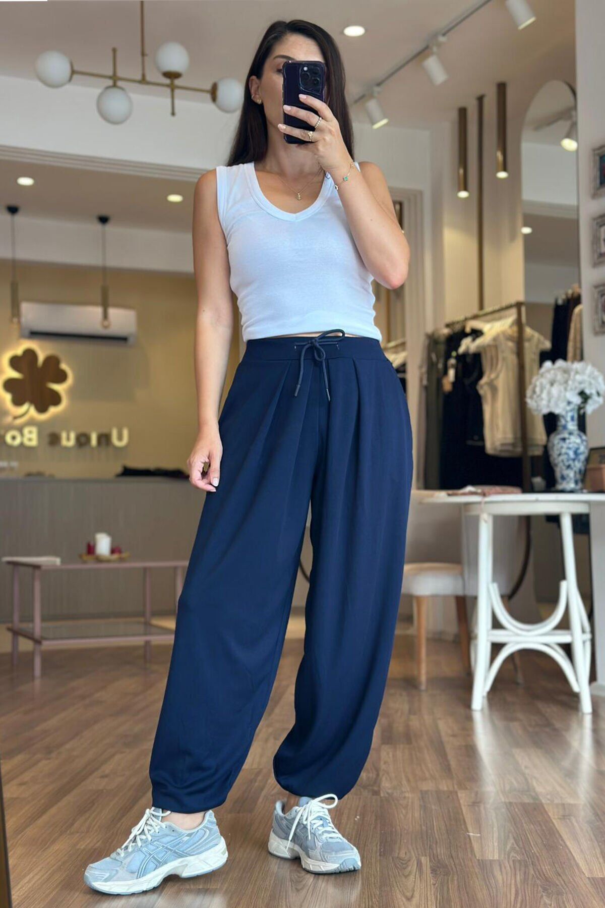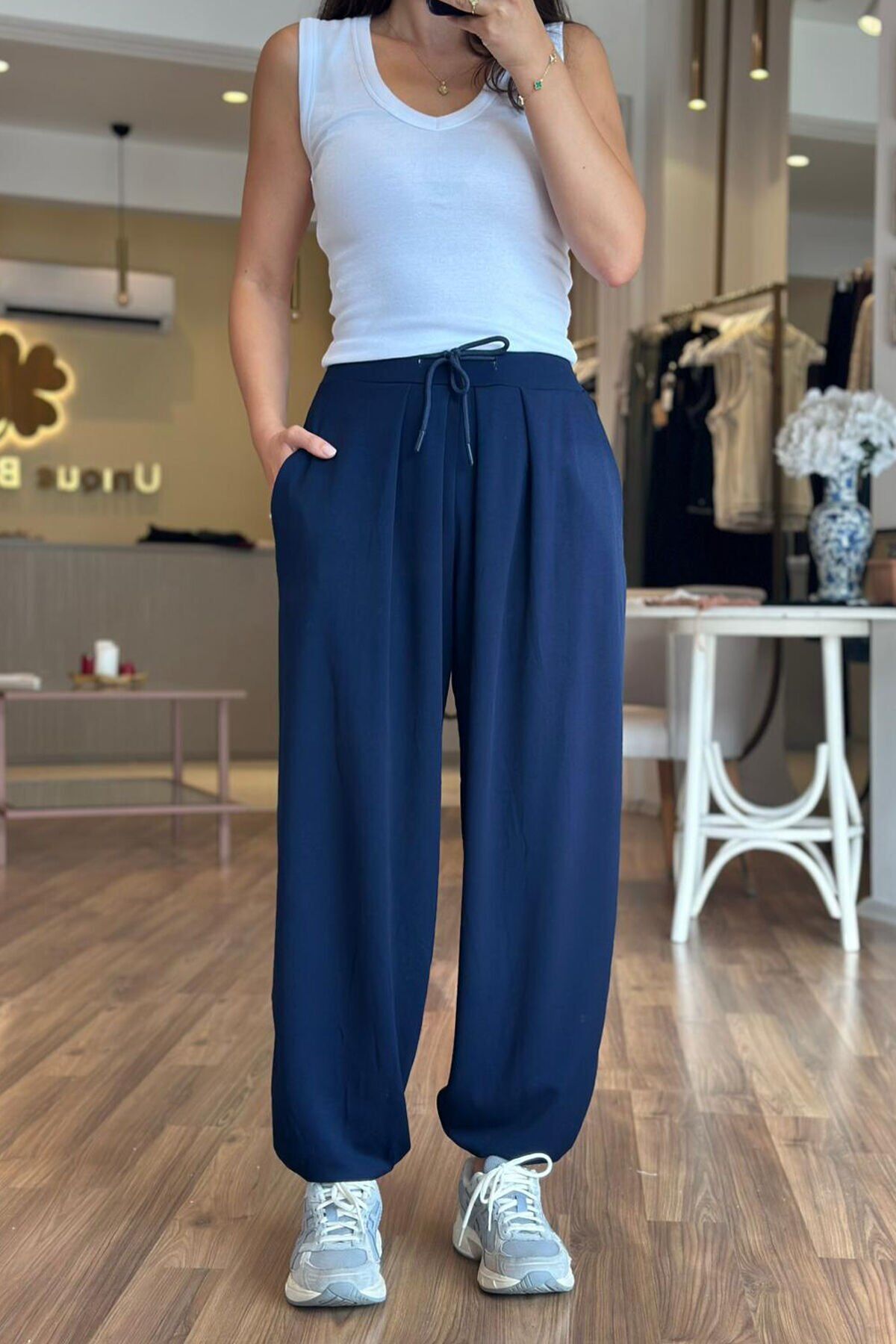 Bu lacivert modal kumaş şalvar pantolon, hem şıklığı hem de rahatlığı bir arada sunar. Yumuşak dokusuyla gün boyu konfor sağlarken, modern şalvar kesimiyle de trend bir görünüm sunar. Günlük kullanıma uygun olan bu pantolon, her tarza kolayca uyum sağlar.
