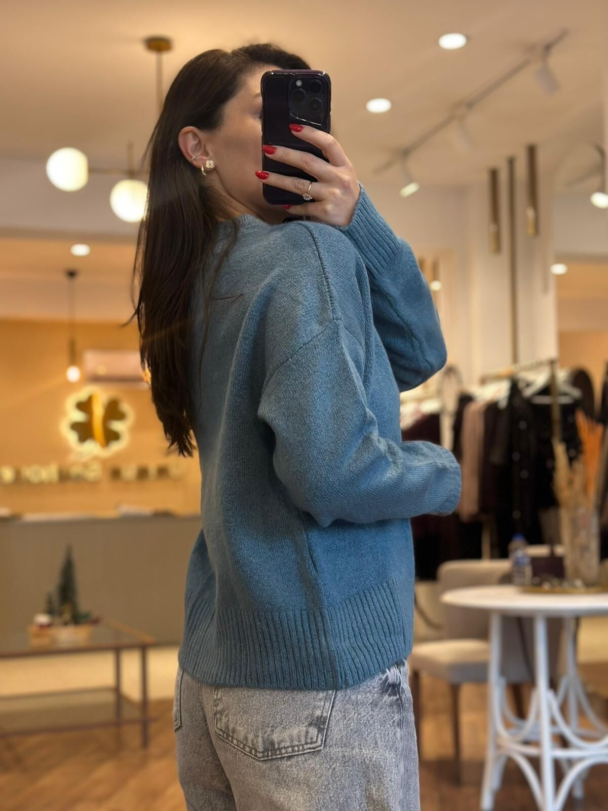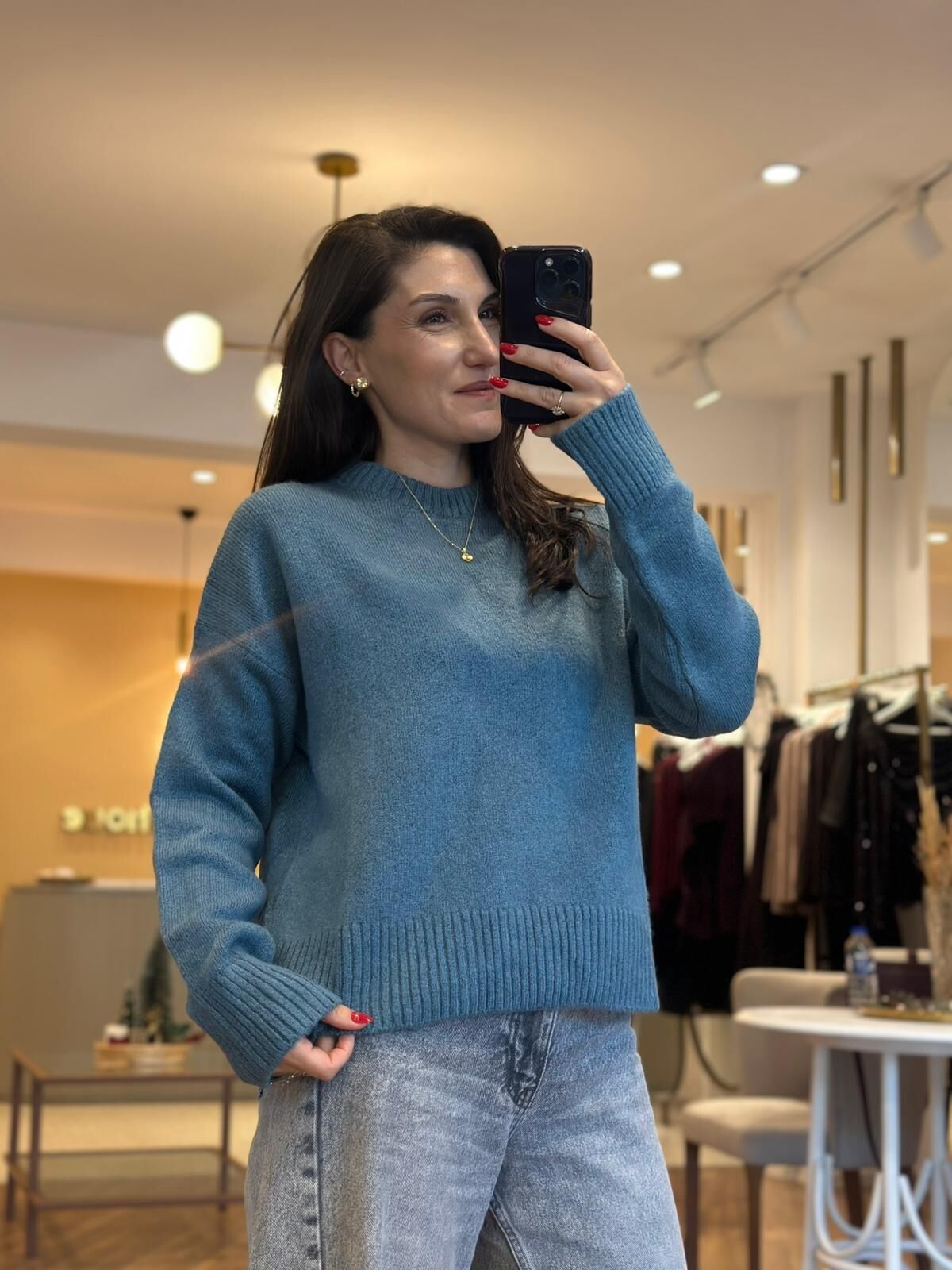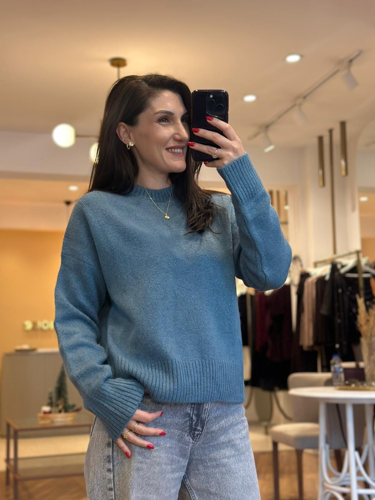 Model üzerindeki kazak mavinin sevilen tonunda standart beden ve rahat kalıptadır. Giyçık kombinleriniz için vazgeçilmez olacak.
