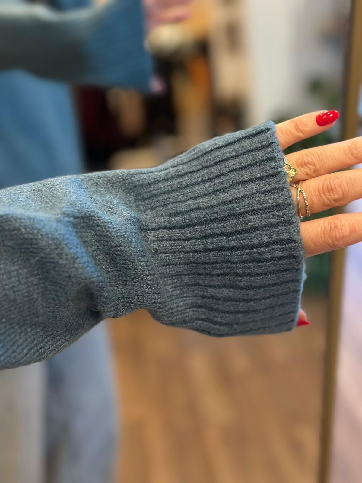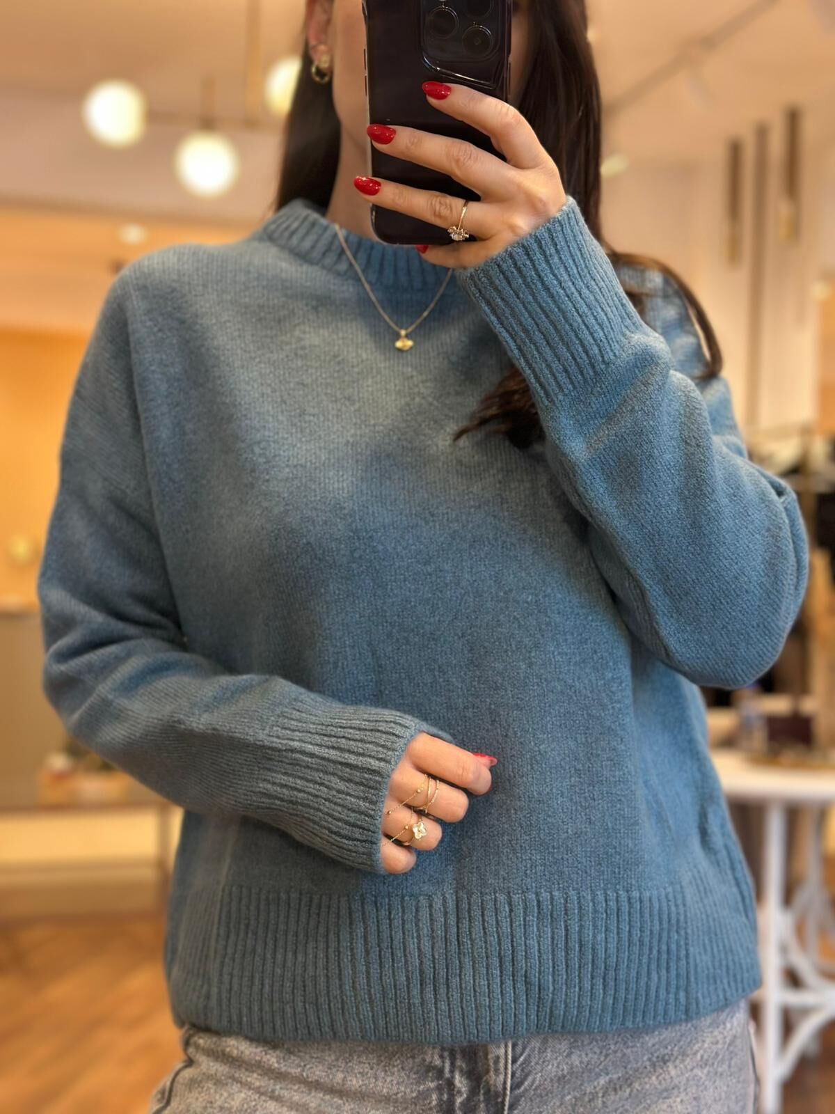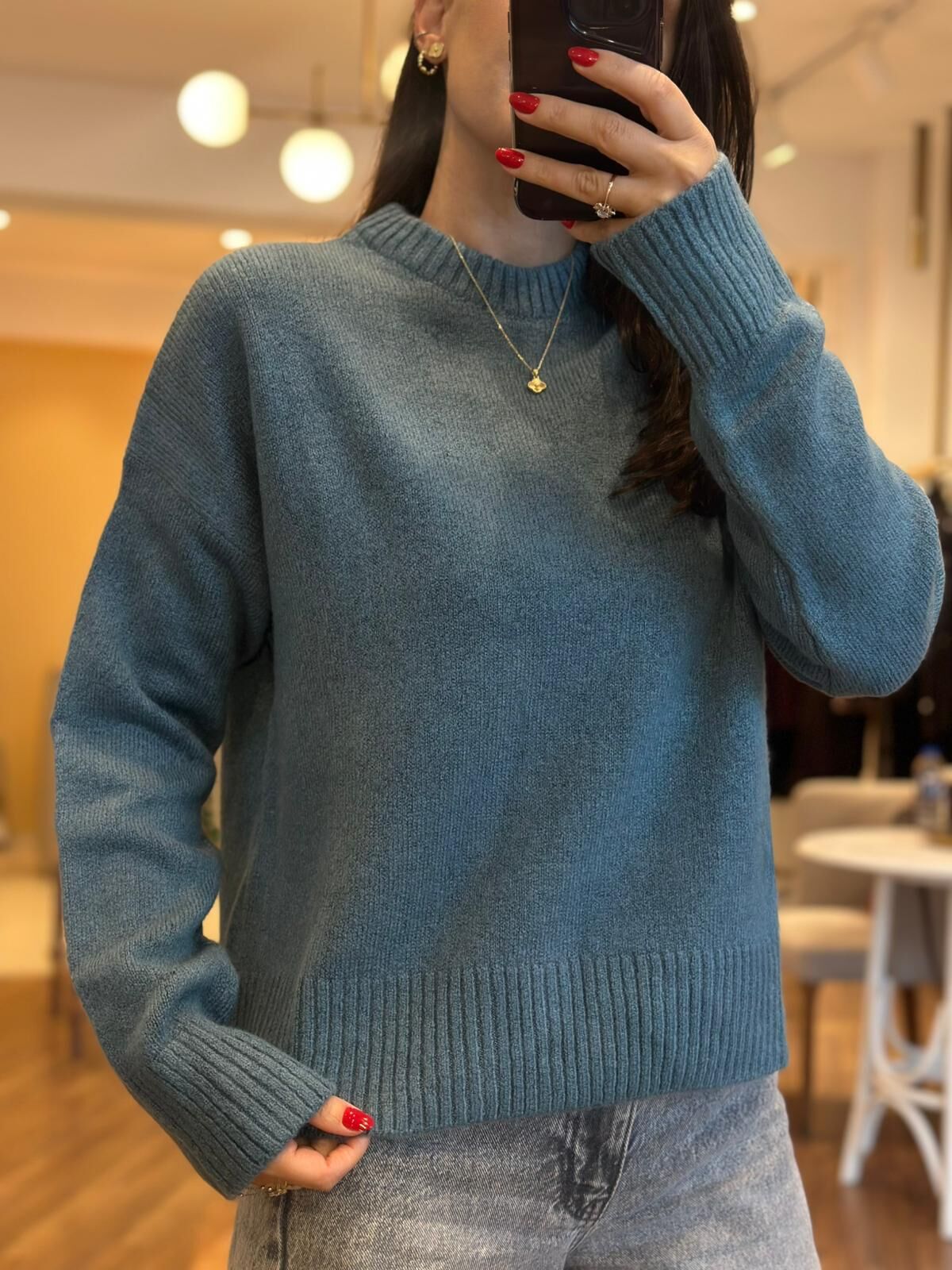 Model üzerindeki kazak mavinin sevilen tonunda standart beden ve rahat kalıptadır. Giyçık kombinleriniz için vazgeçilmez olacak.