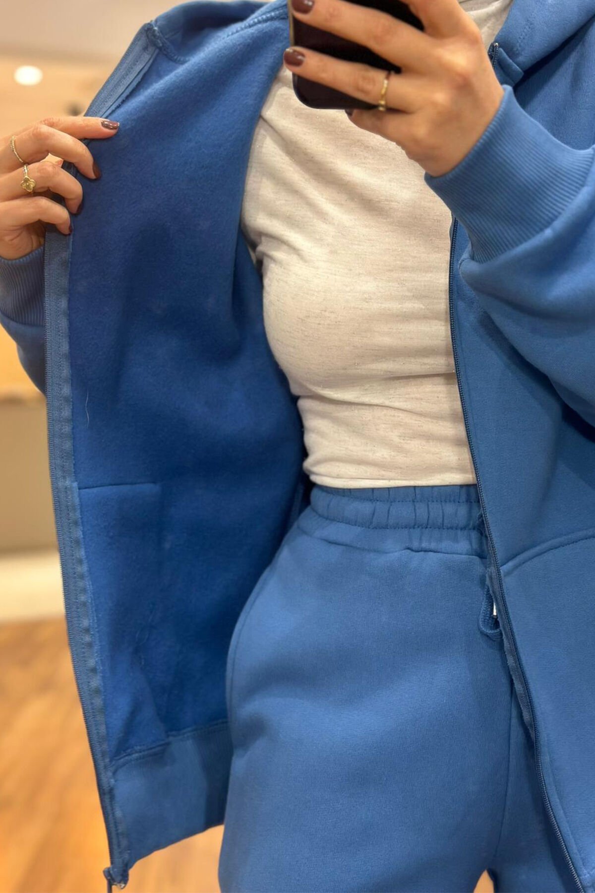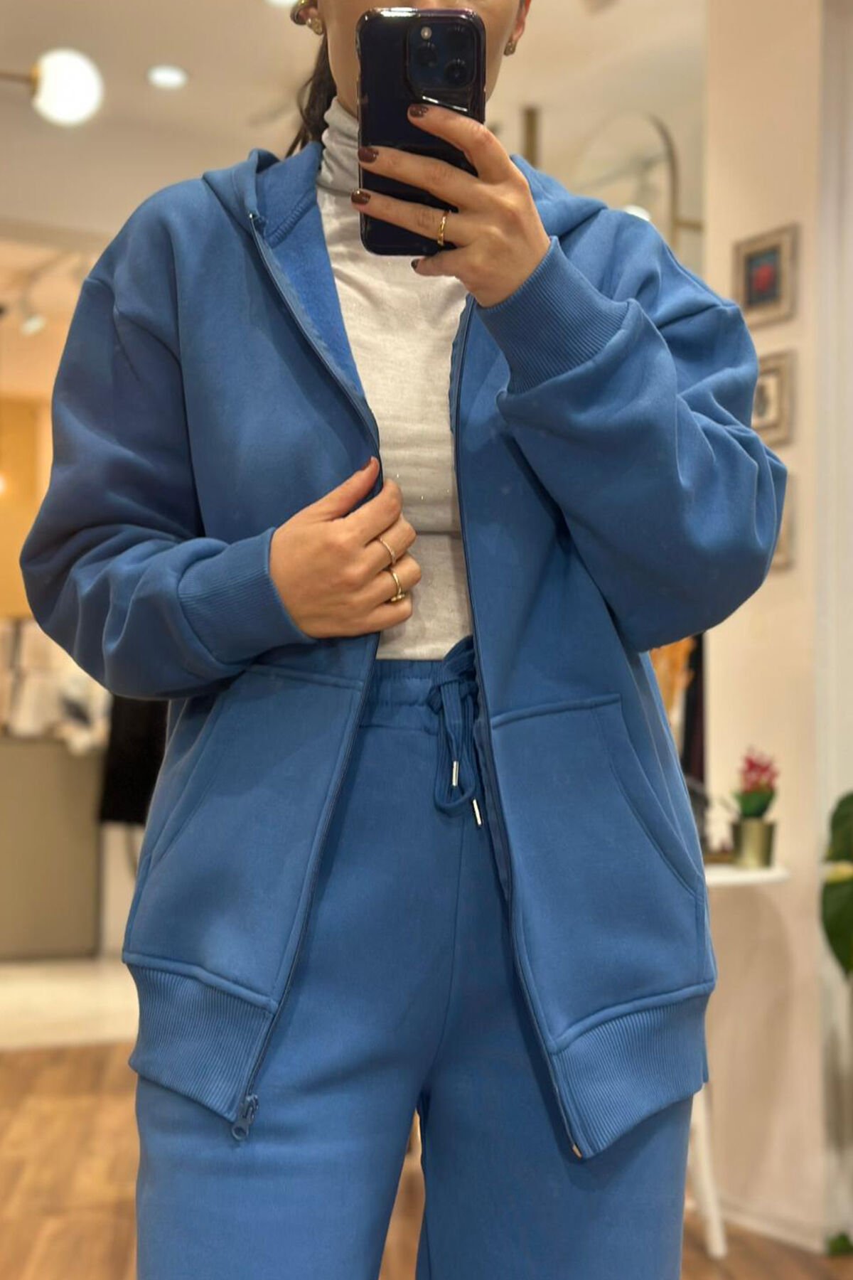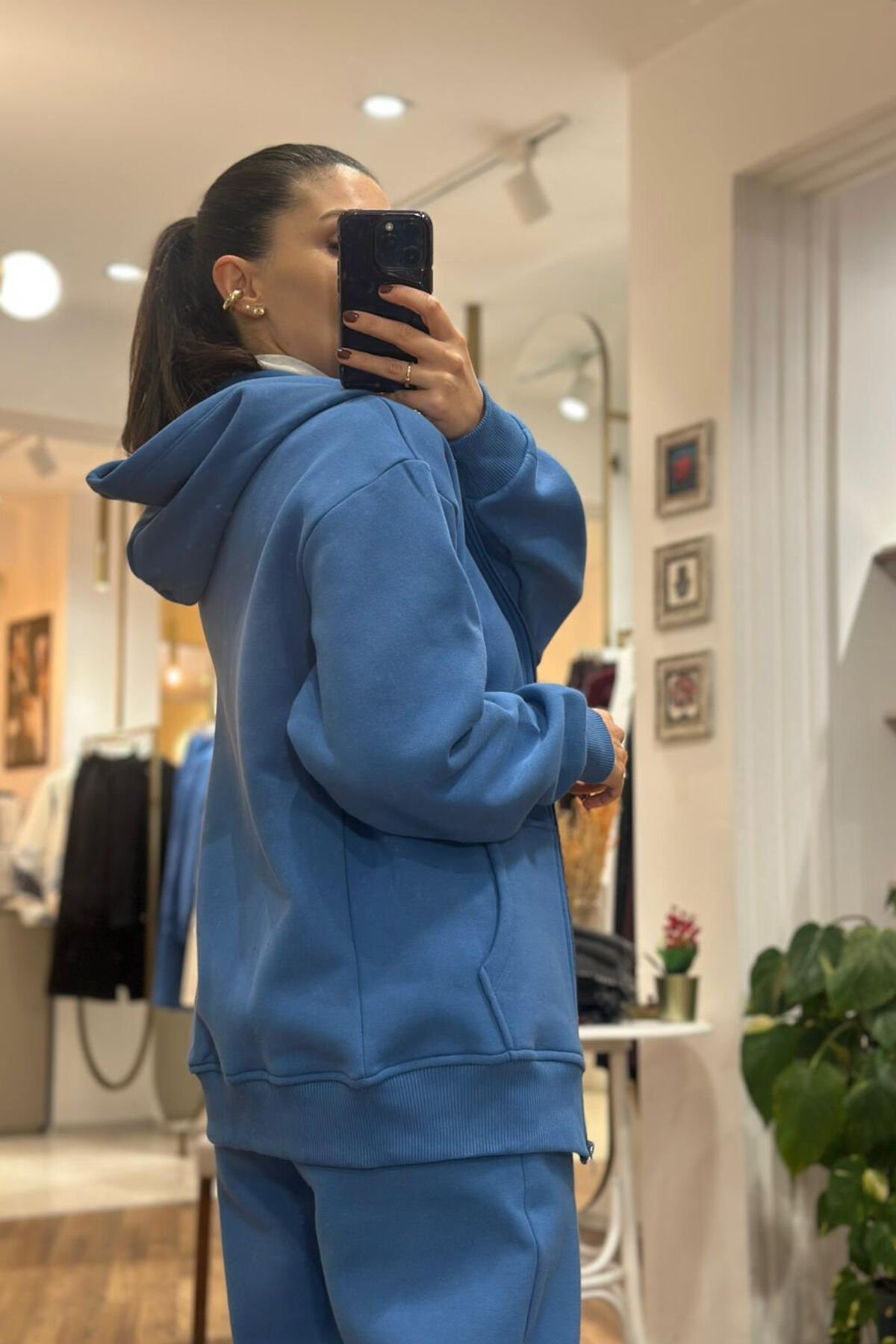 Mavi kapüşonlu fermuarlı pamuklu sweatshirt, rahatlığı ve şıklığı bir arada sunar. Yumuşak pamuklu dokusu sayesinde gün boyu konfor sağlar. Fermuar detayı pratik kullanım imkanı yaratırken, sıcak tutan iç yüzeyi soğuk havalarda ideal seçimdir. Spor ve günlük kombinlerde fark yaratır.