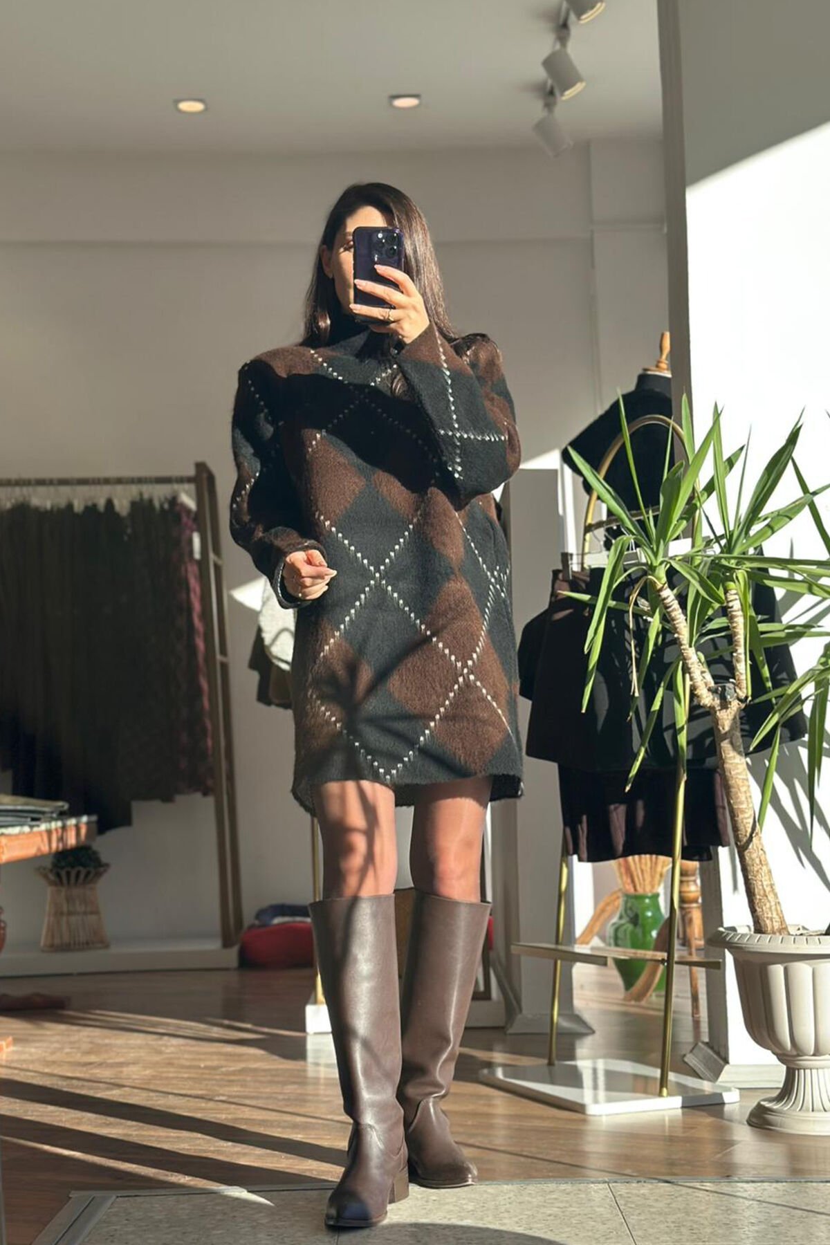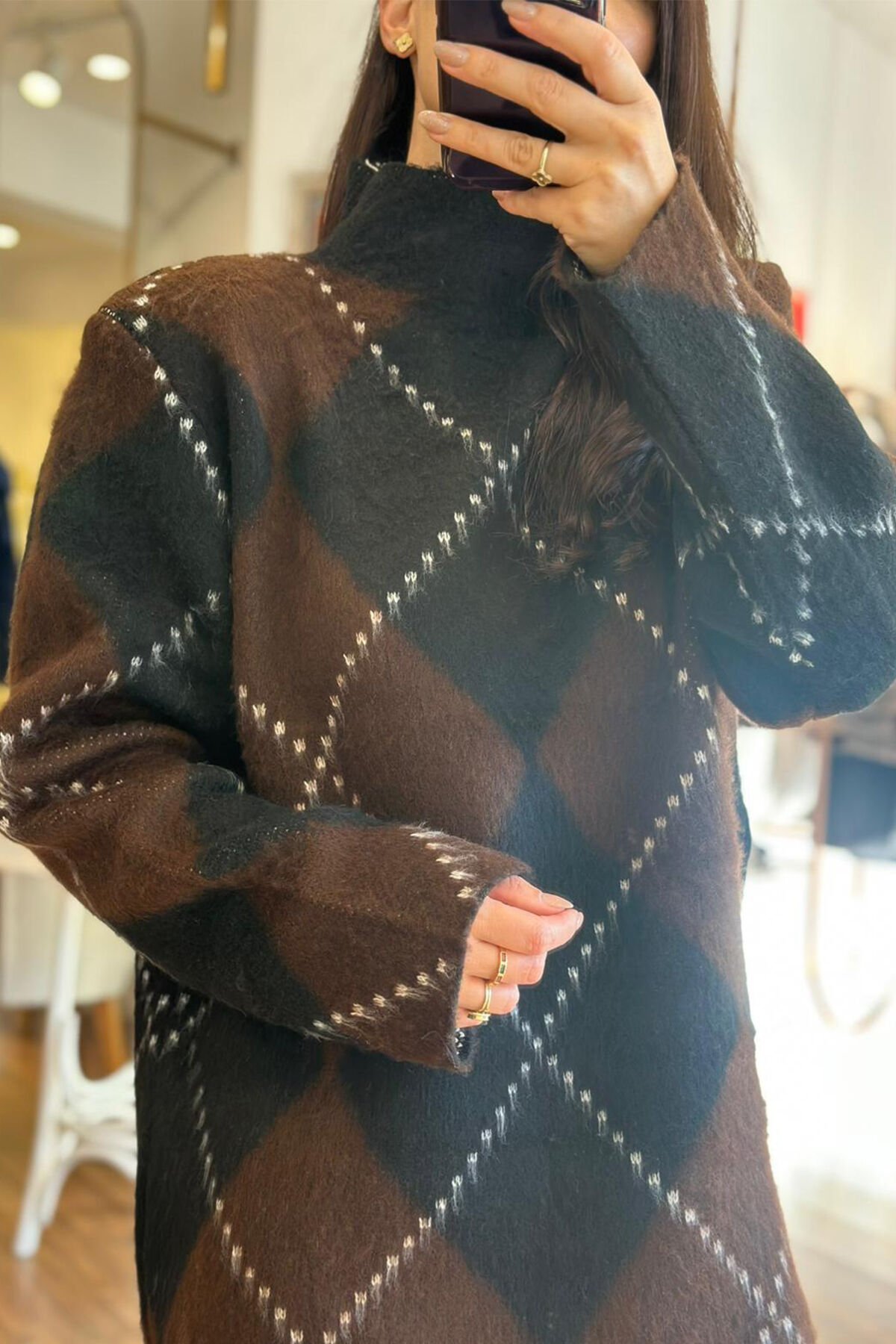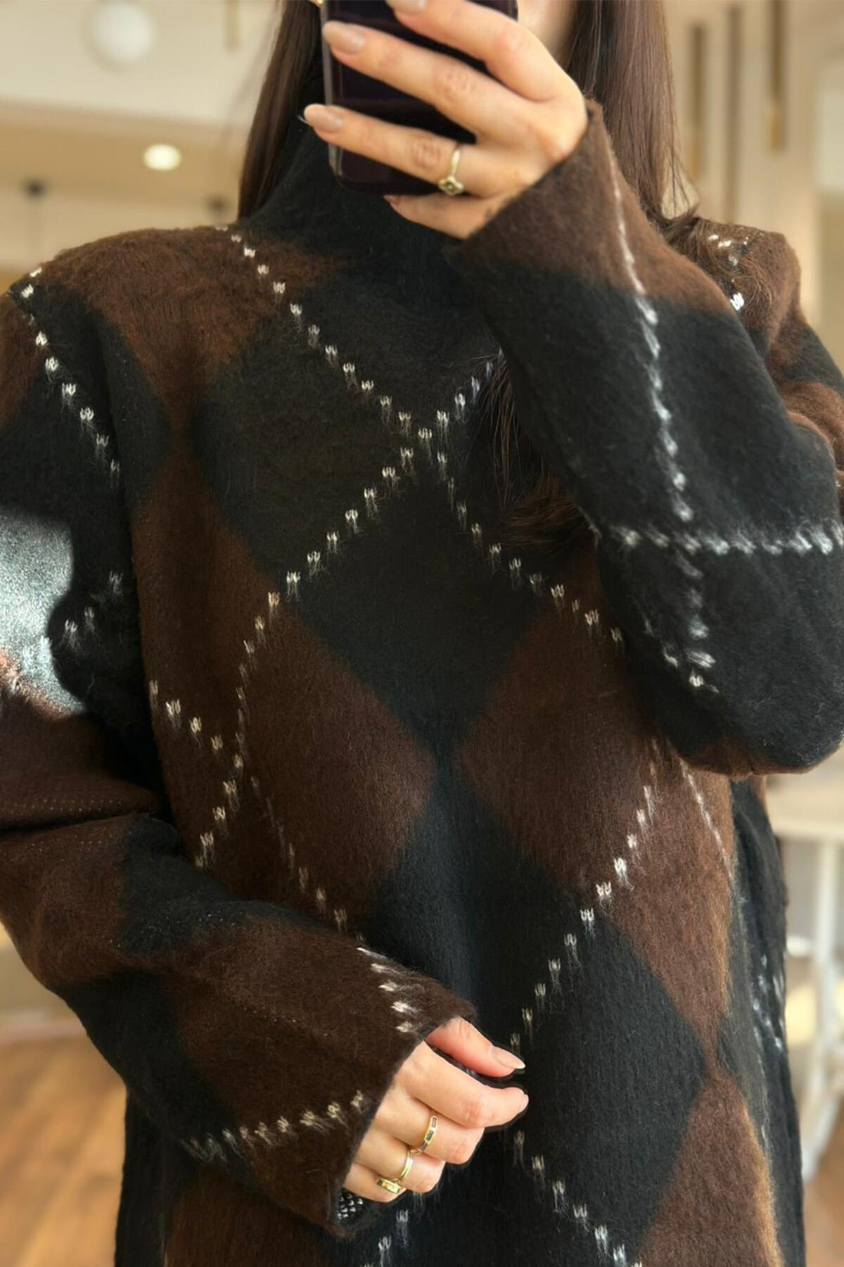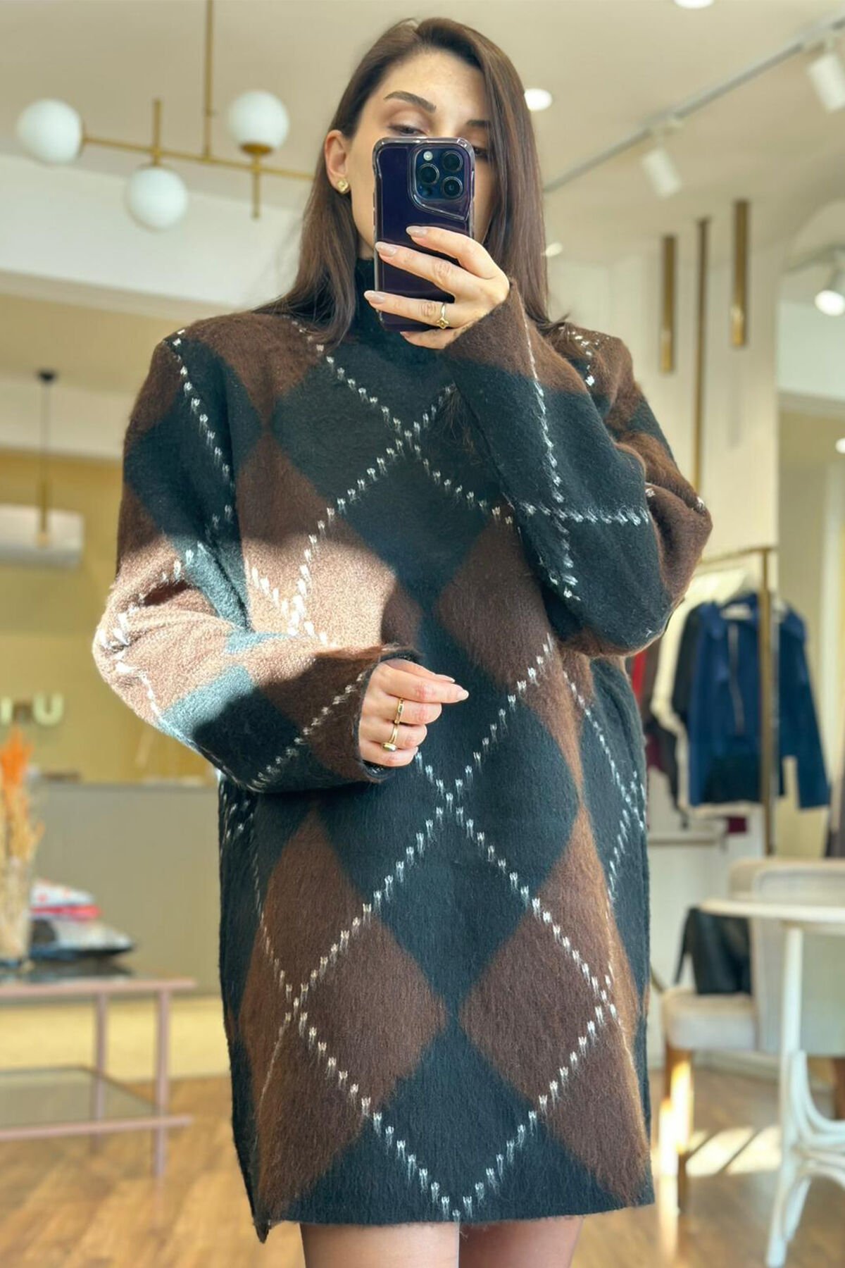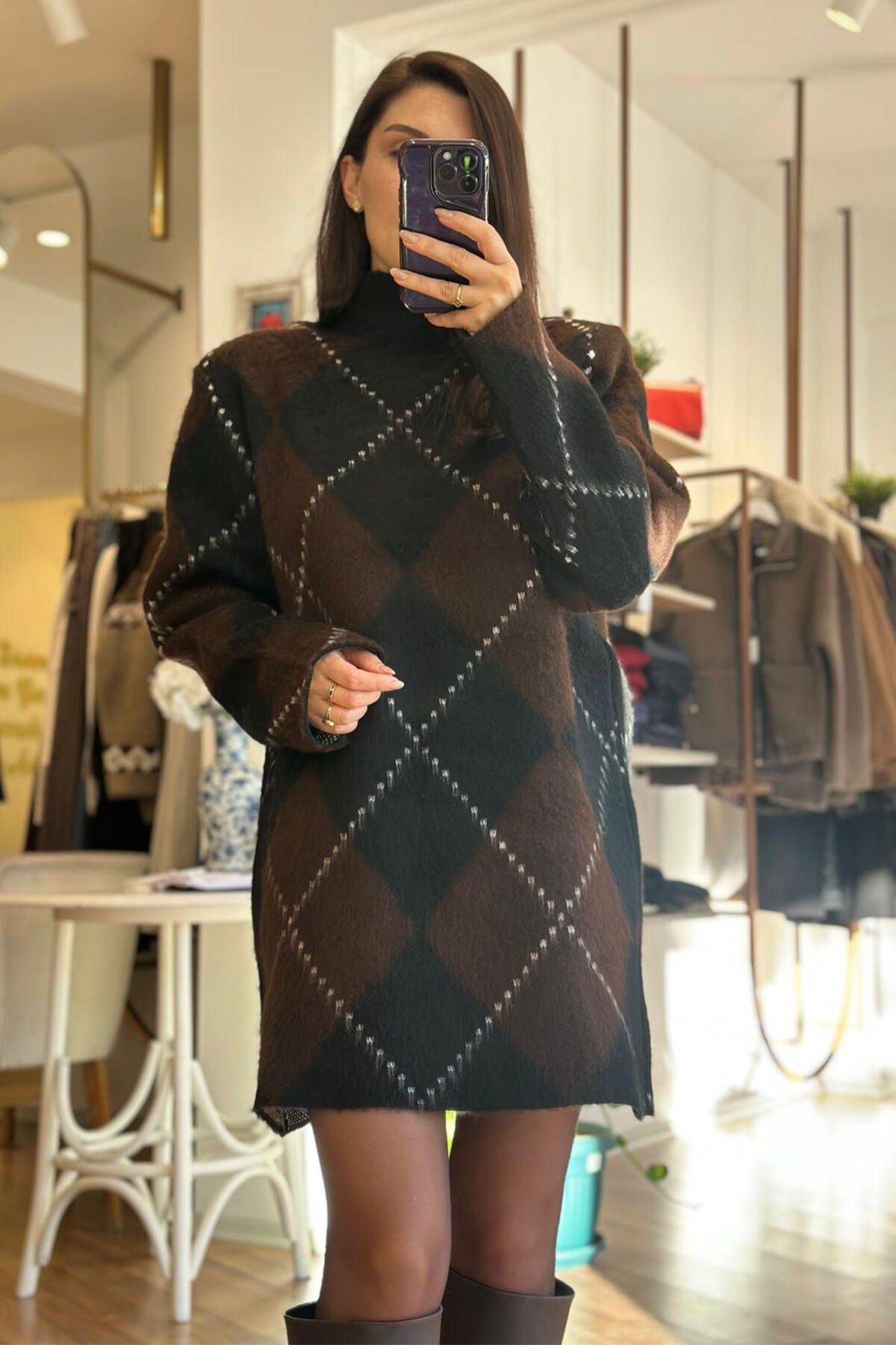Omuzu vatkalı, baklava desenli kahve-siyah yün elbise, şık ve modern tarzı bir araya getiriyor. Standart beden seçeneği ile rahat kullanım sunan bu elbise, soğuk havalarda sıcak tutarken, dikkat çekici deseniyle stilinizi tamamlar. Günlük ve özel davetler için ideal seçimdir.