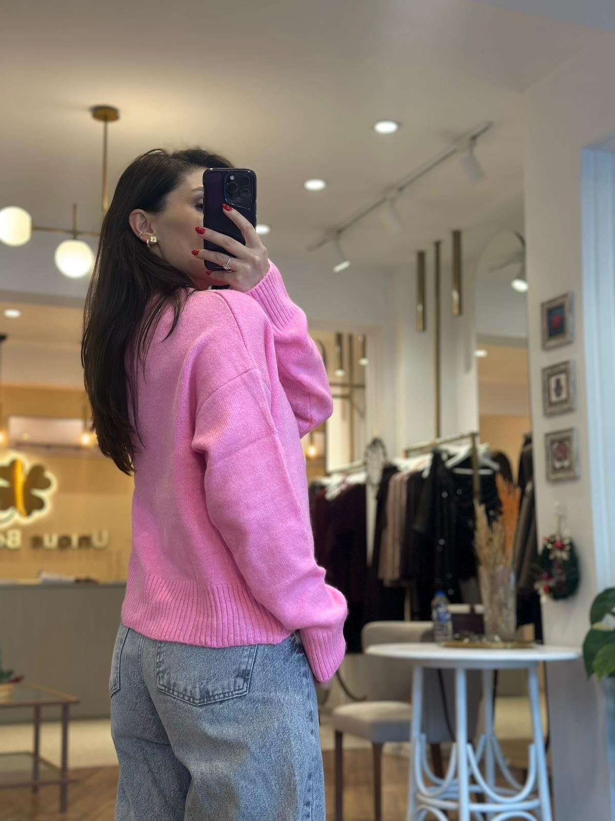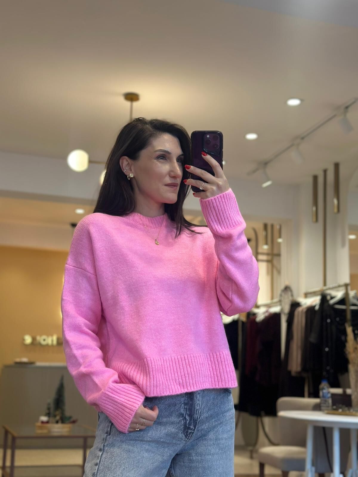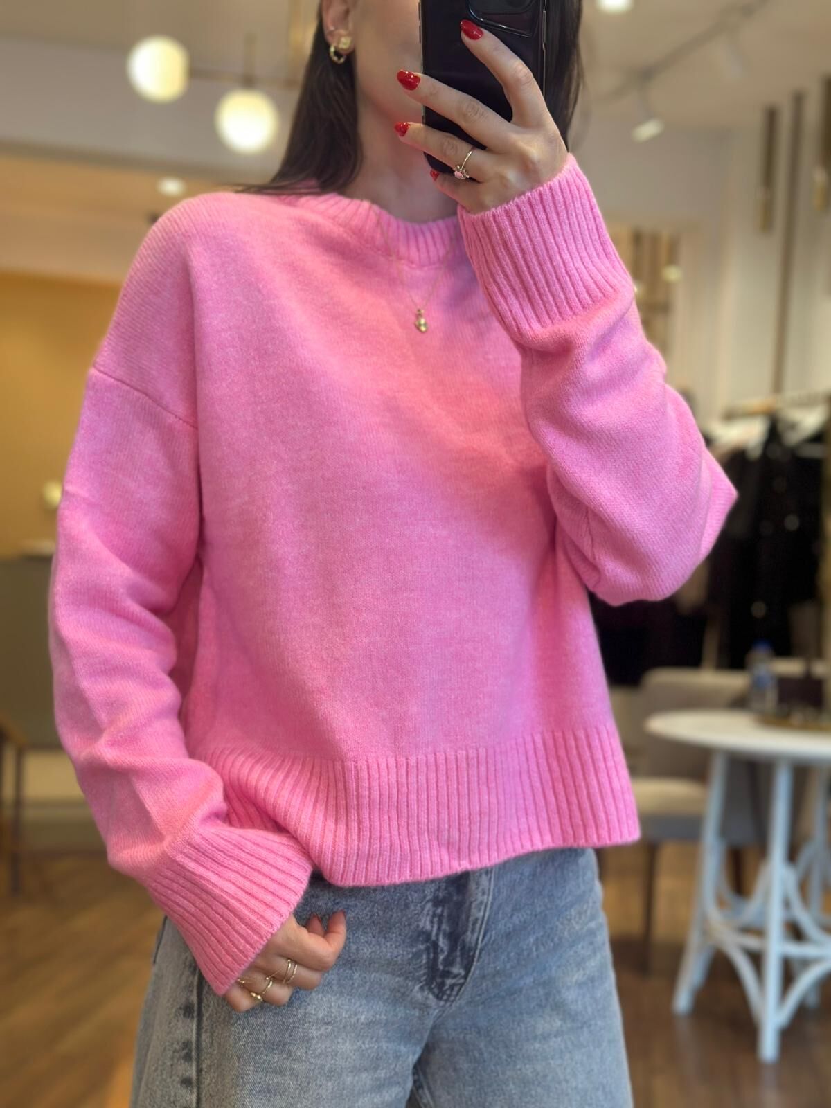 Model üzerindeki kazak pembenin sevilen tonunda standart beden ve rahat kalıptadır. Giyçık kombinleriniz için vazgeçilmez olacak.