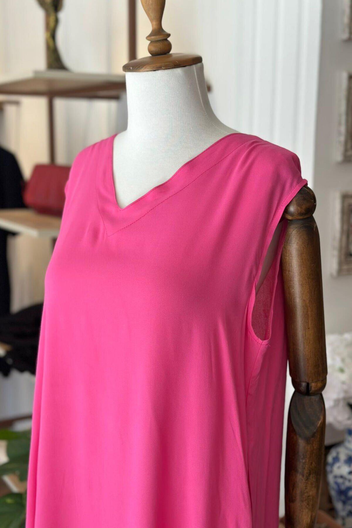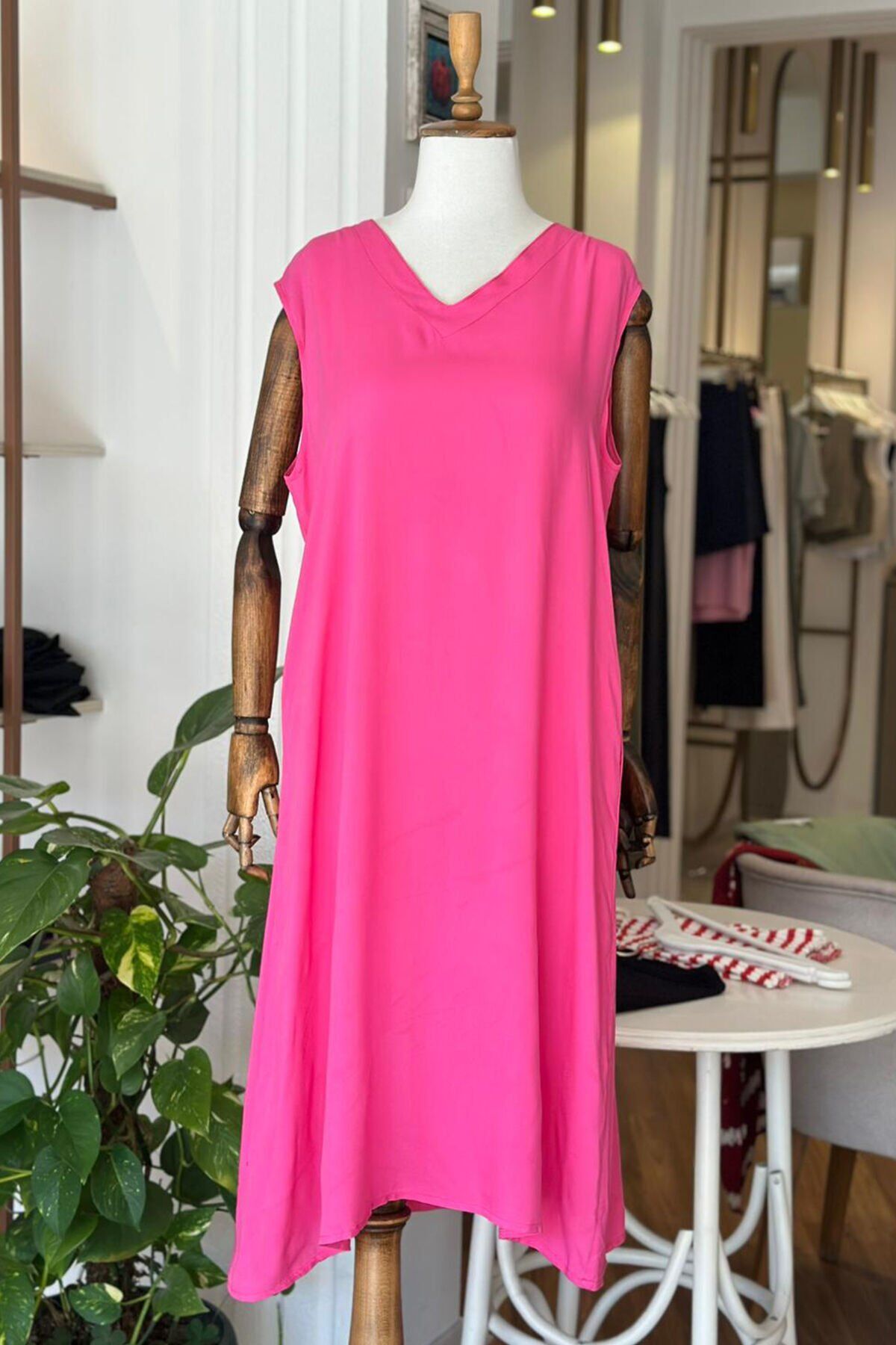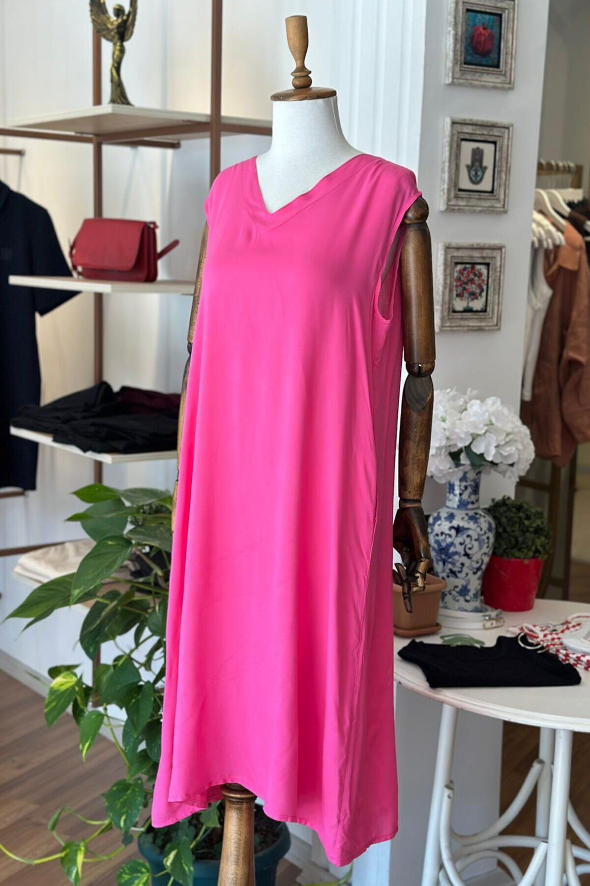 Pembe Sıfır Kol Pamuklu Viskon Kumaş Büyük Beden Elbise