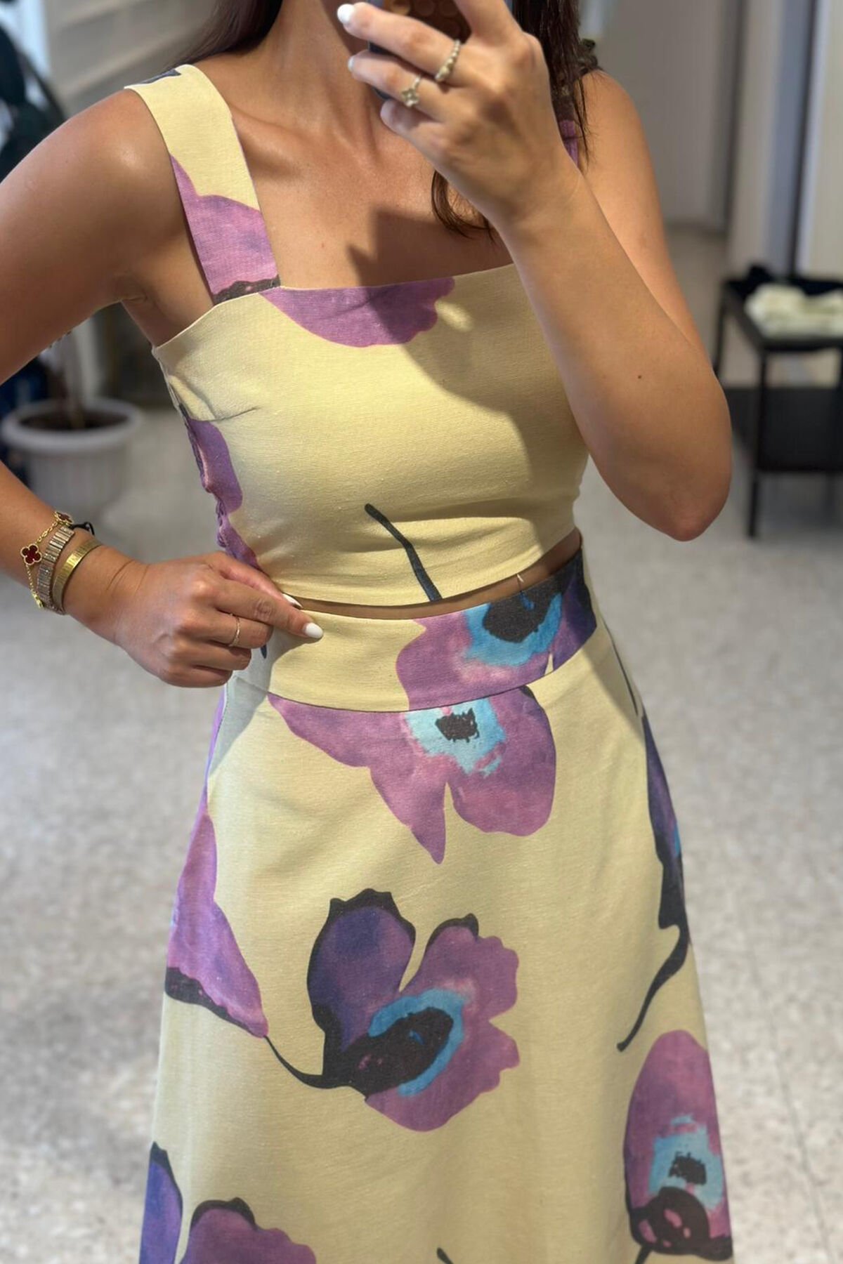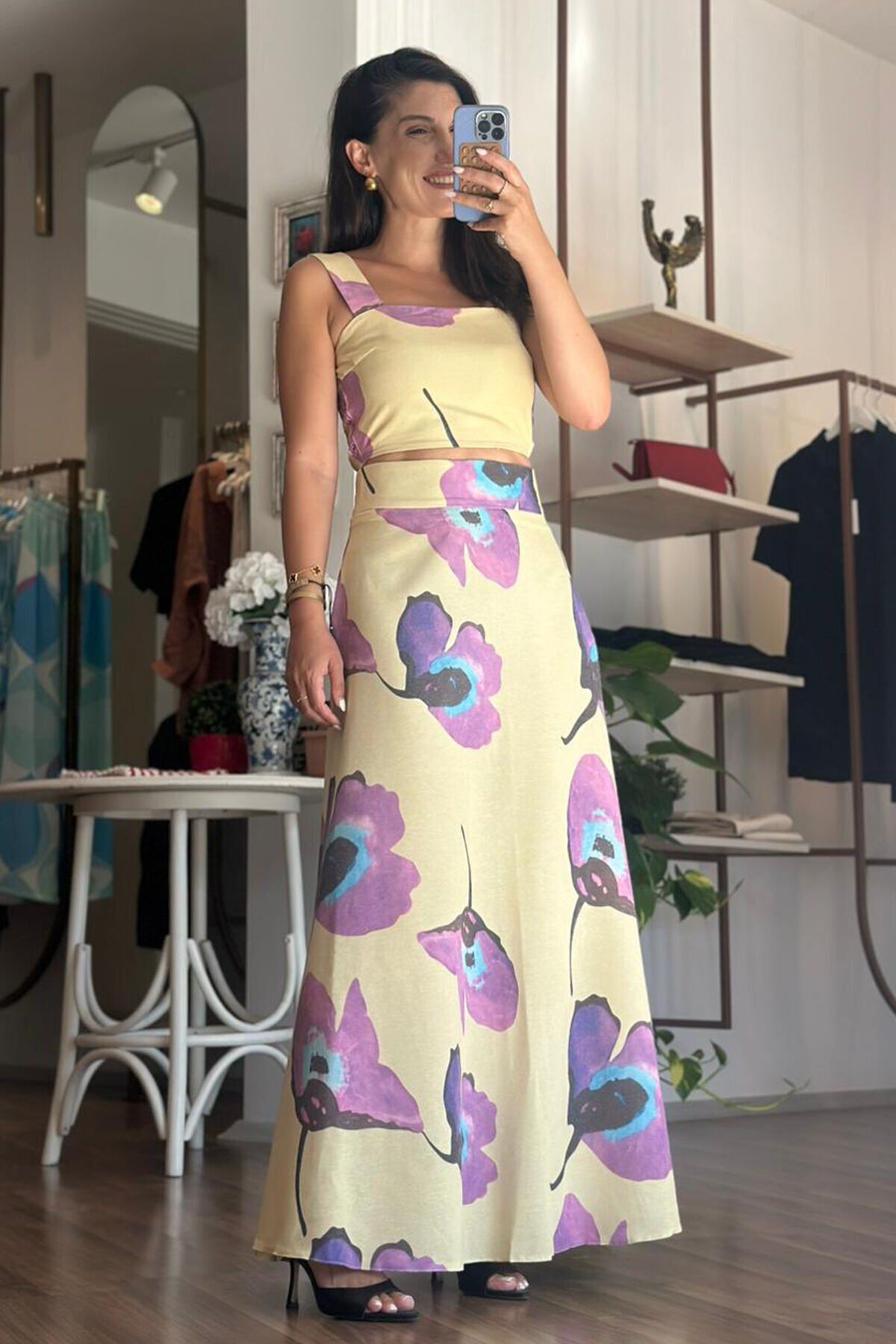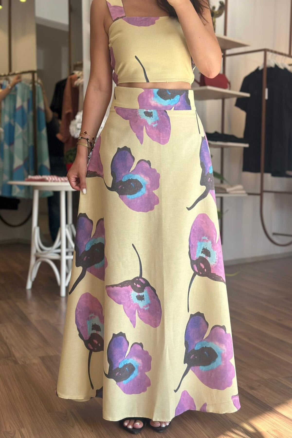 Bu çarpıcı sarı çiçek desenli keten bluz-etek takımı, yaz mevsimine renk katacak. Hafif ve rahat keten kumaşıyla hem şık hem de konforlu bir görünüm sunuyor. Bu takım, güneşli günlerde ve özel etkinliklerde mükemmel bir seçim olacak.