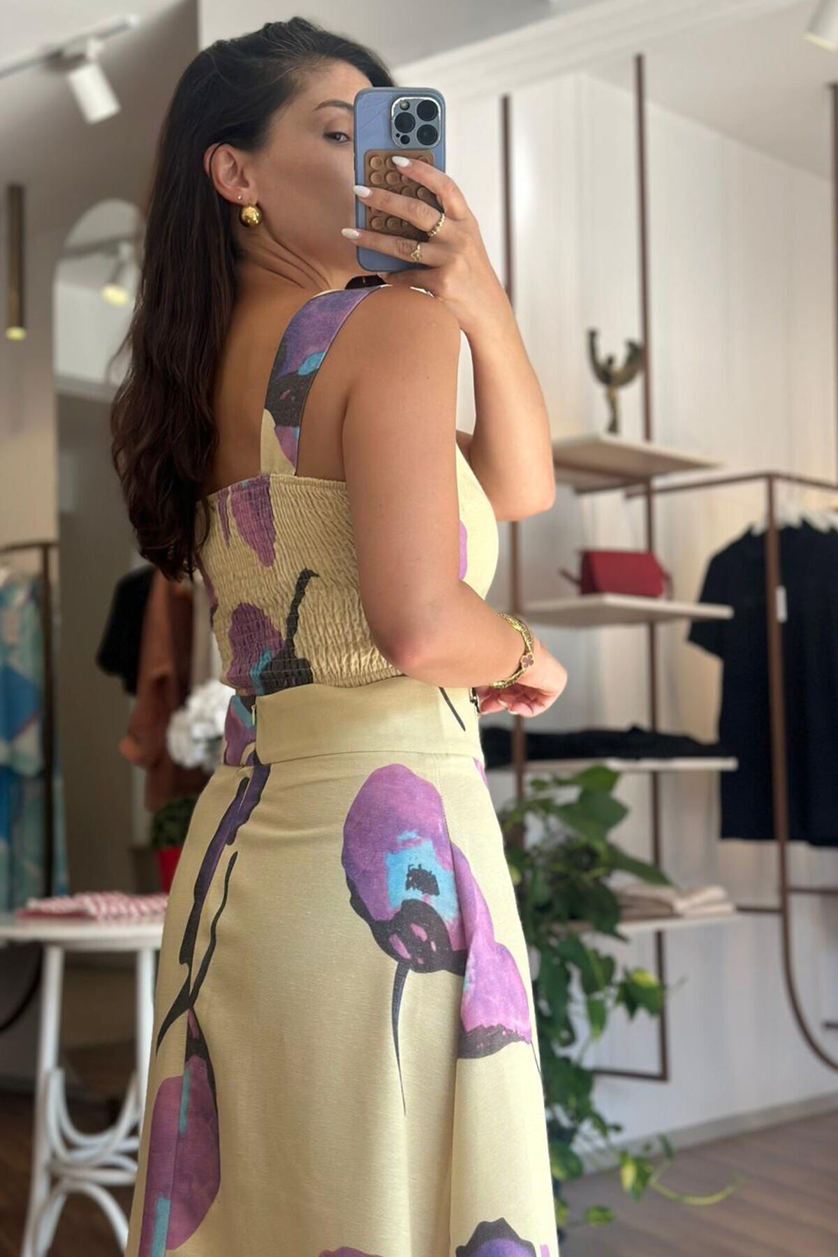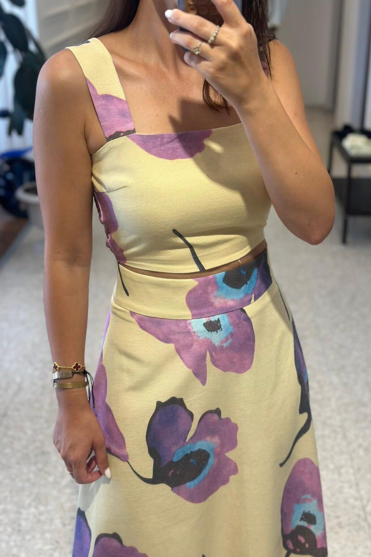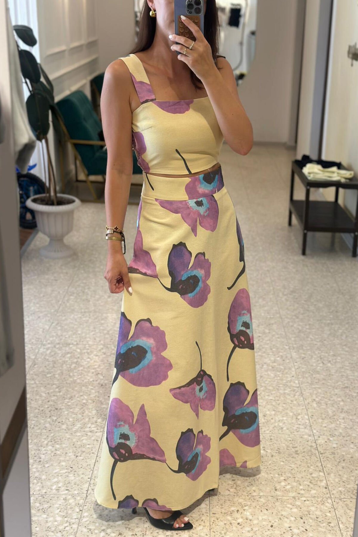 Bu çarpıcı sarı çiçek desenli keten bluz-etek takımı, yaz mevsimine renk katacak. Hafif ve rahat keten kumaşıyla hem şık hem de konforlu bir görünüm sunuyor. Bu takım, güneşli günlerde ve özel etkinliklerde mükemmel bir seçim olacak.