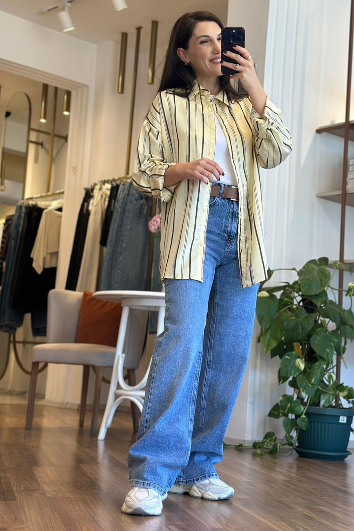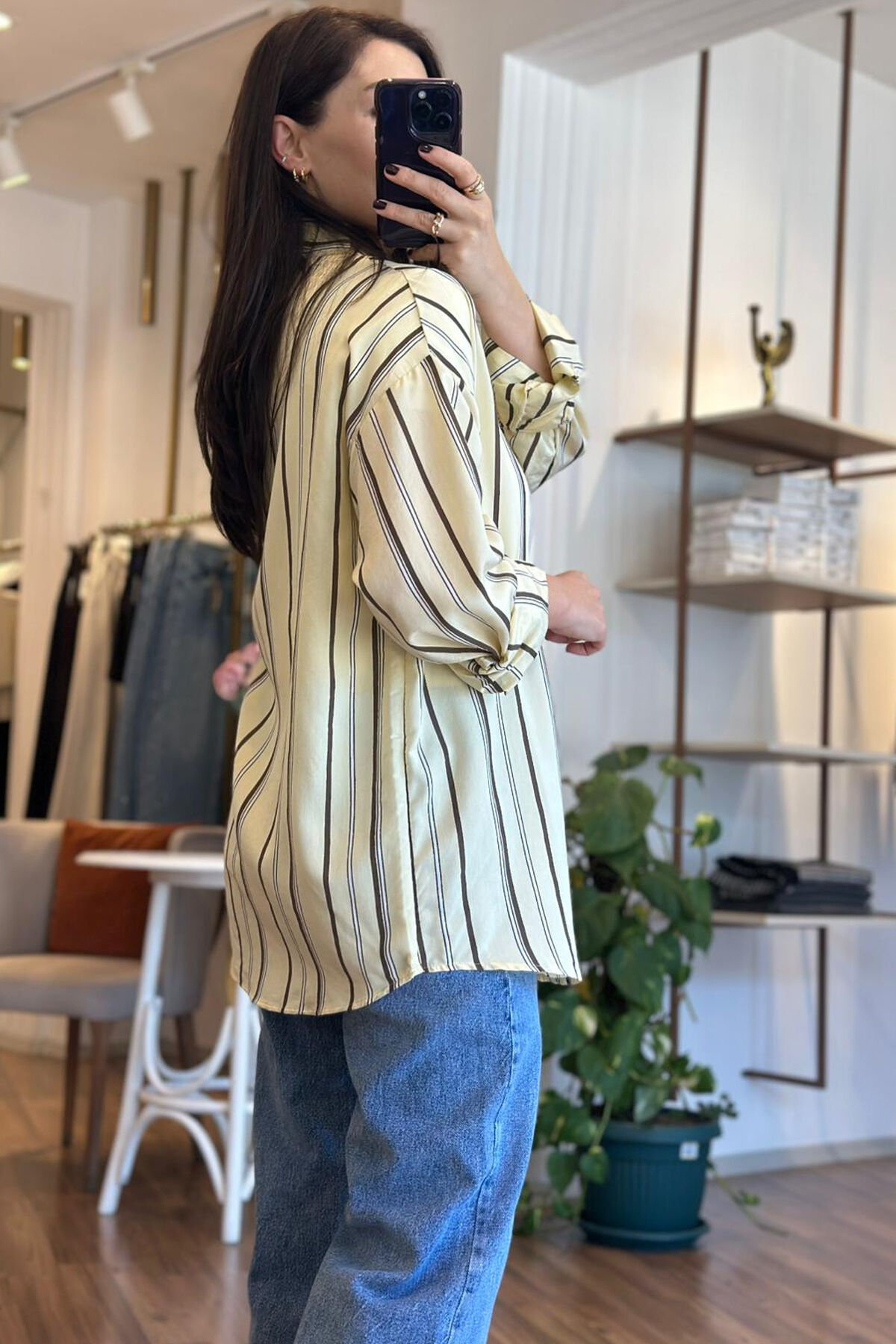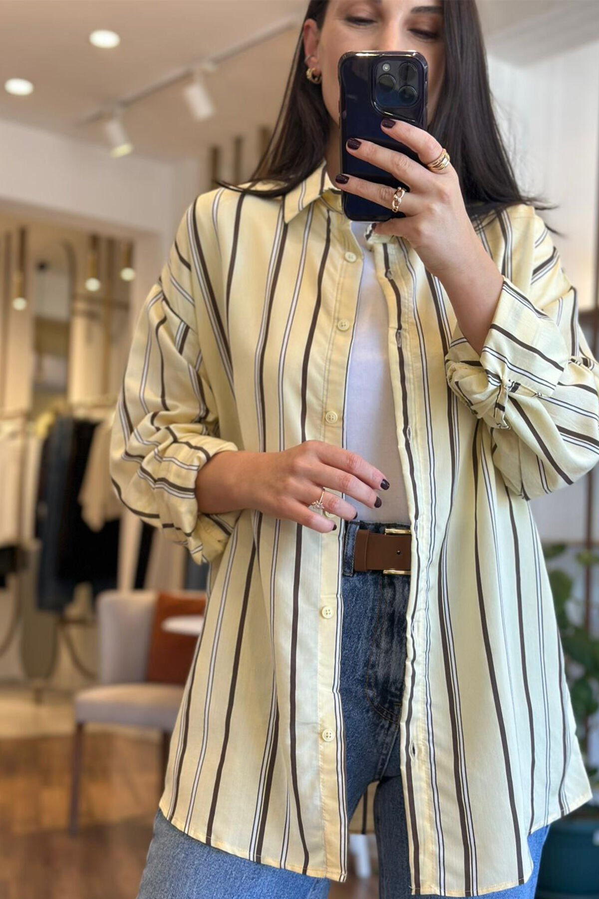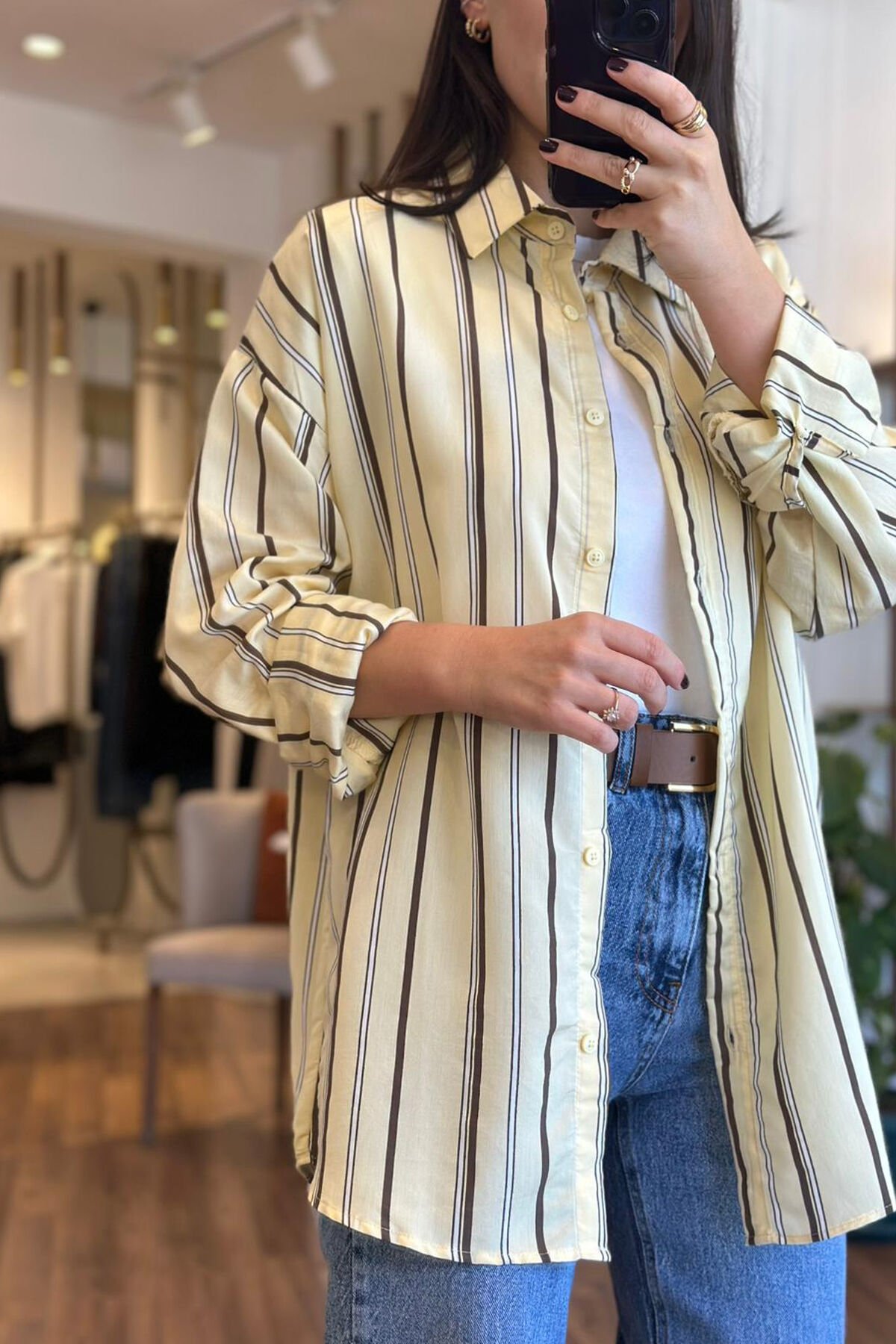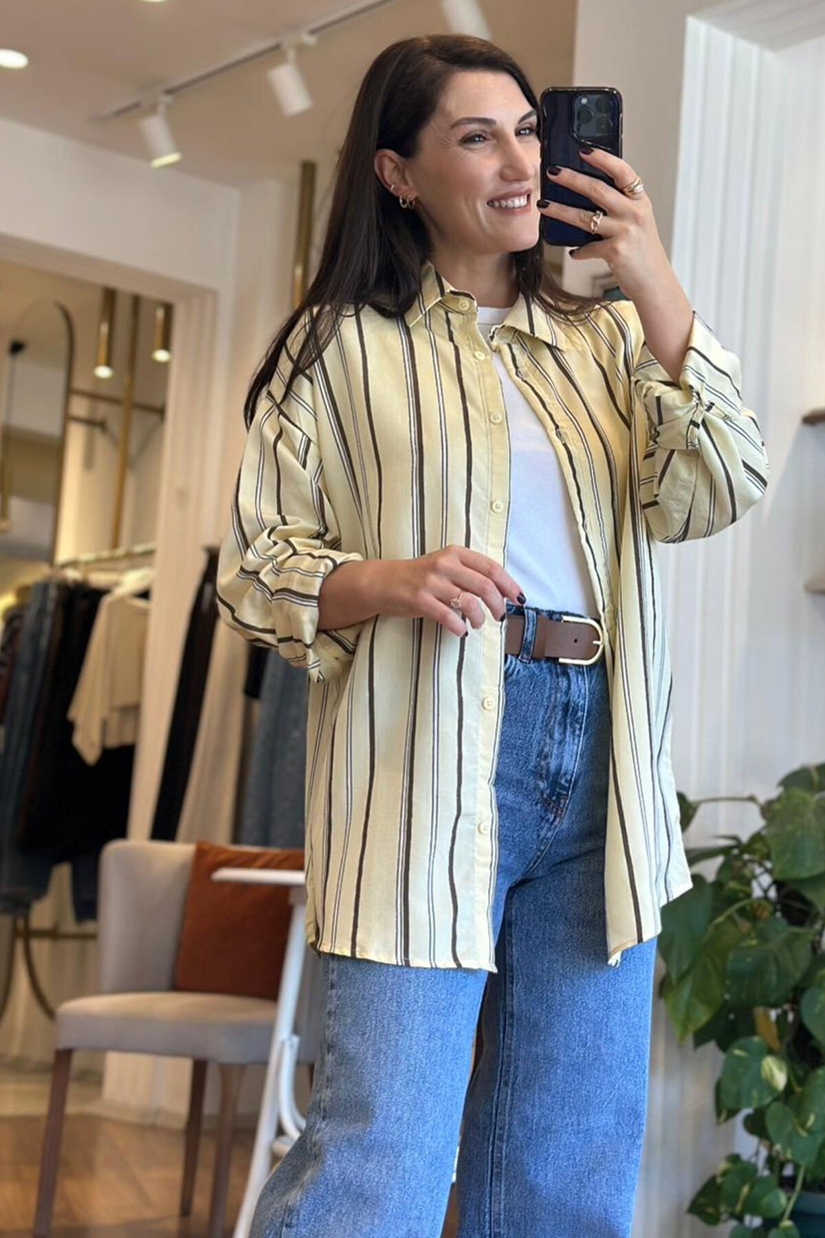 Zamansız şıklığı modern dokunuşlarla buluşturan sarı kahverengi çizgili gömlek ,gardırobunuzun en kurtarıcı parçalarından biri olmaya aday. Yumuşak ve hafif dokulu kumaşı sayesinde gün boyu konfor sunarken ,dikey çizgili tasarımı ile daha uzun ve zarif görünüm sağlar.Hem günlük hem de özel günlerde rahatlıkla tercih edebileceğiniz gömlektir.