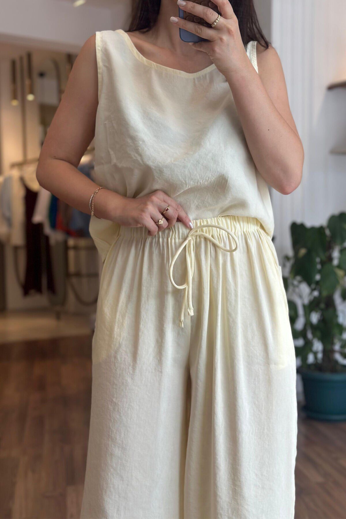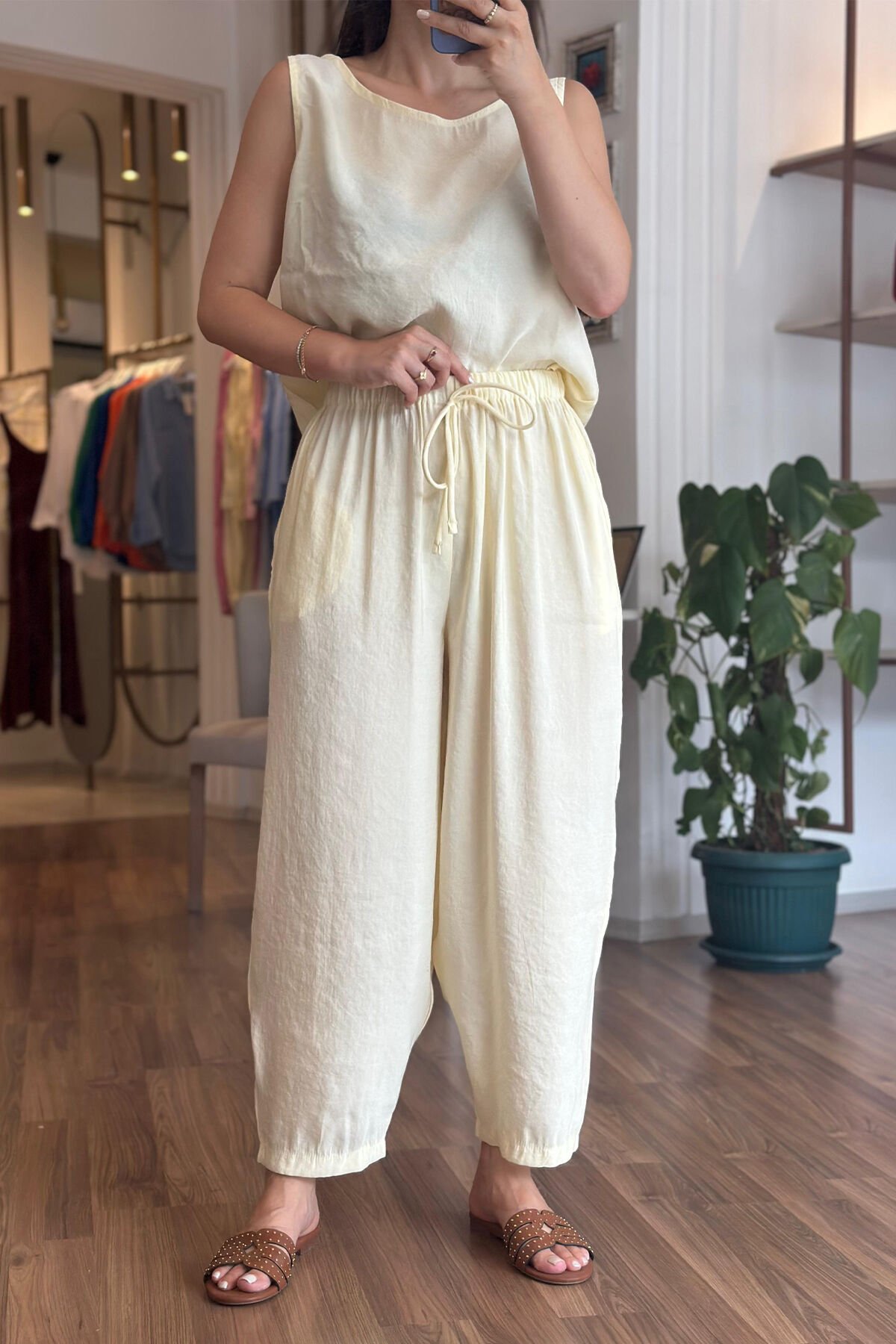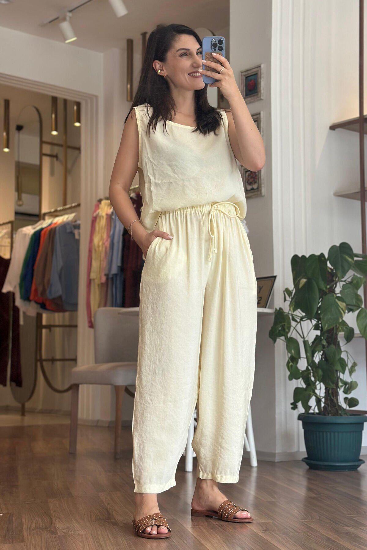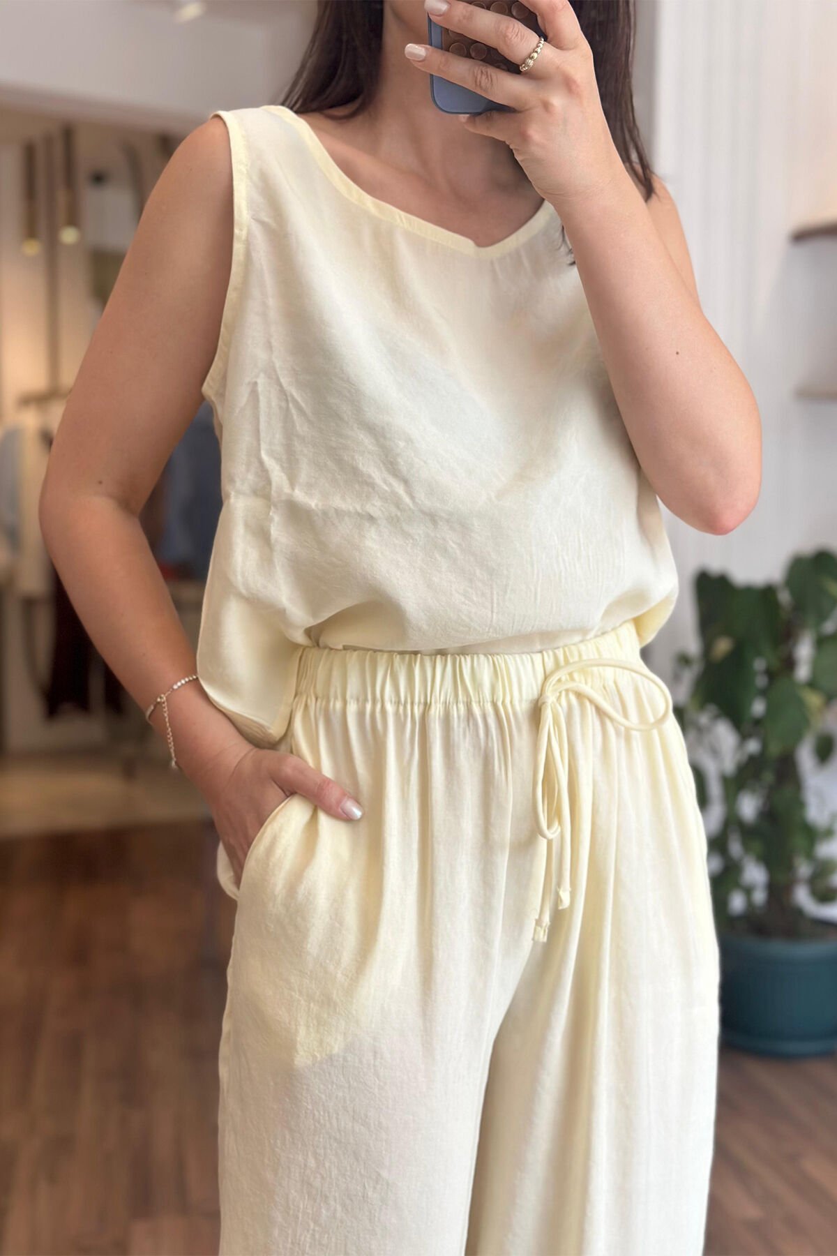 Bu sarı tensel kumaş alt üst takımı, şık ve rahat tasarımıyla dikkat çekiyor. Yumuşak dokusu ve esnek yapısı sayesinde gün boyu konfor sağlarken, şıklığınızdan ödün vermezsiniz.Hem spor hem de günlük kullanıma uygun olan bu takım, gardırobunuzun vazgeçilmezi olacak.