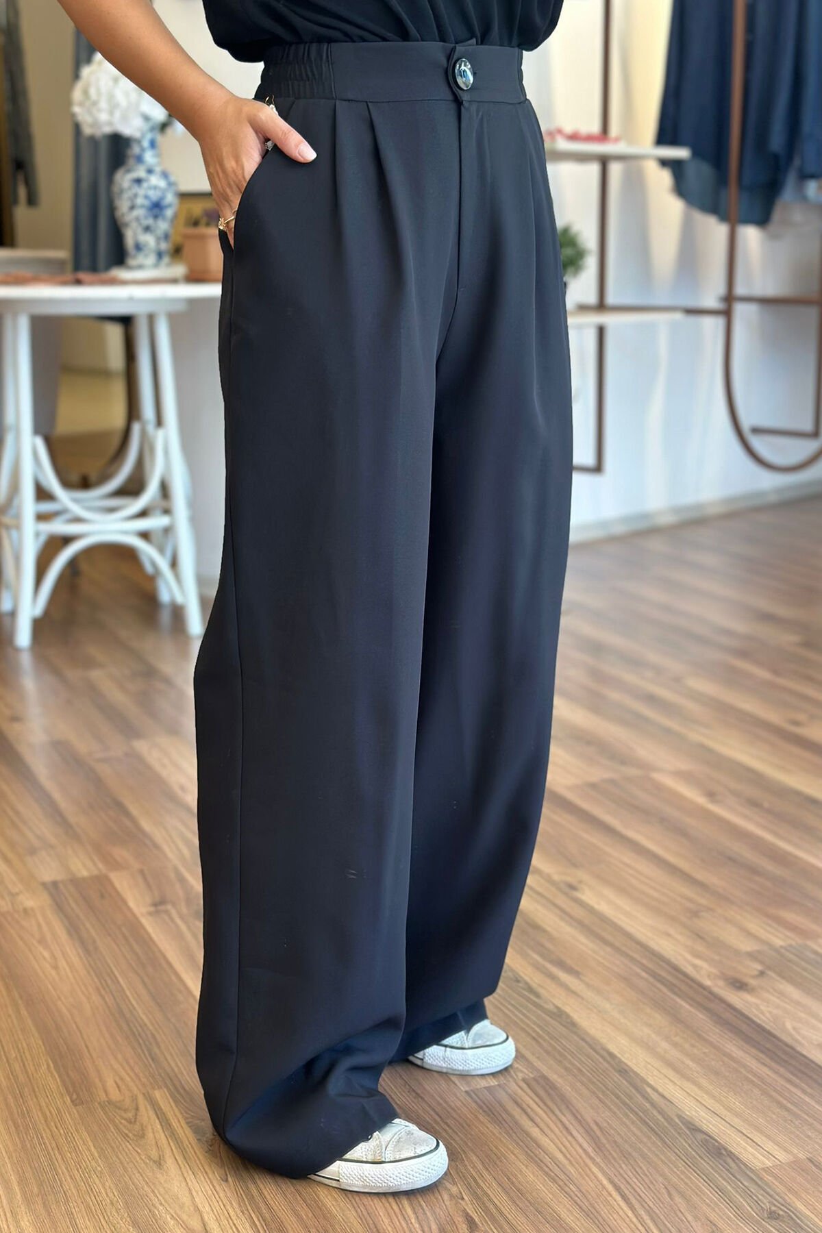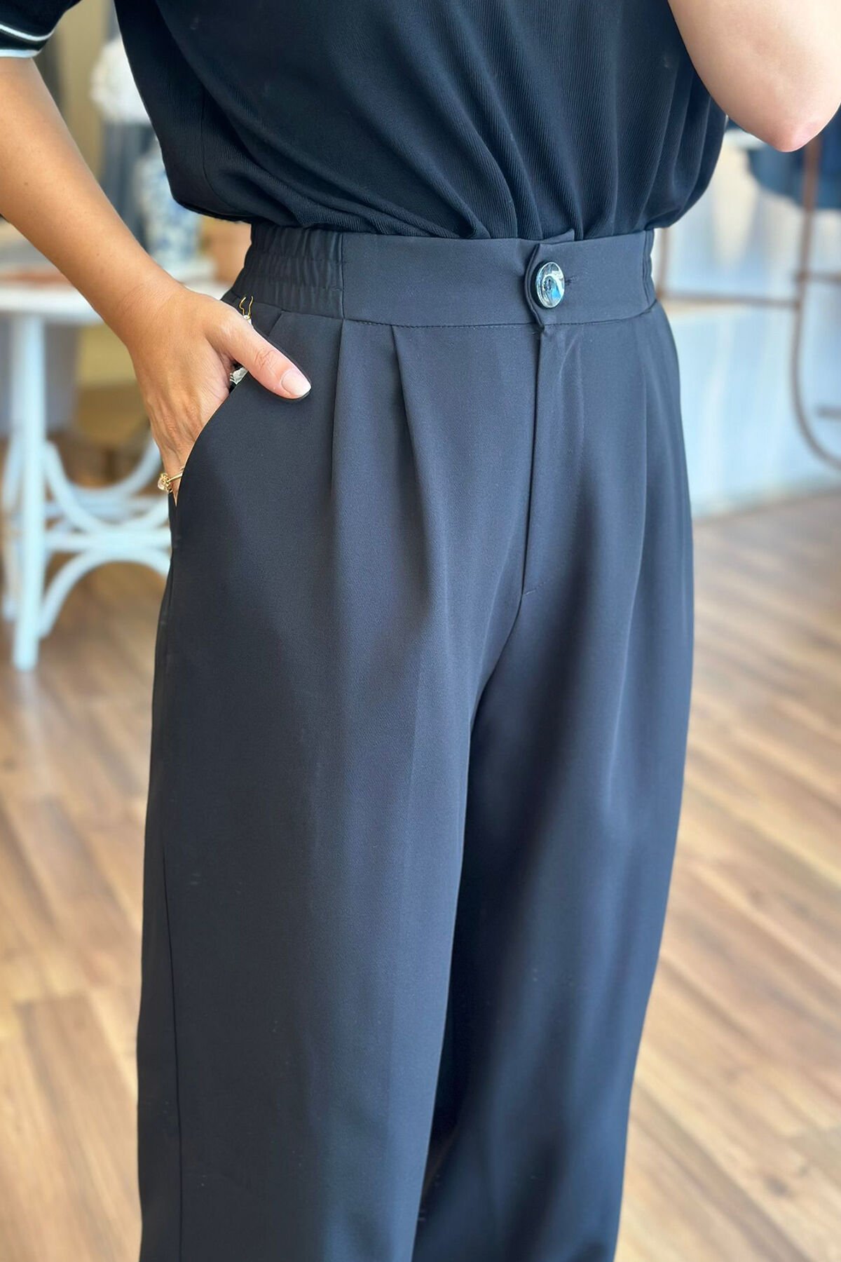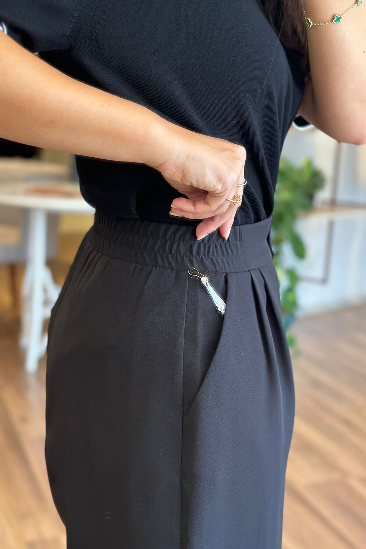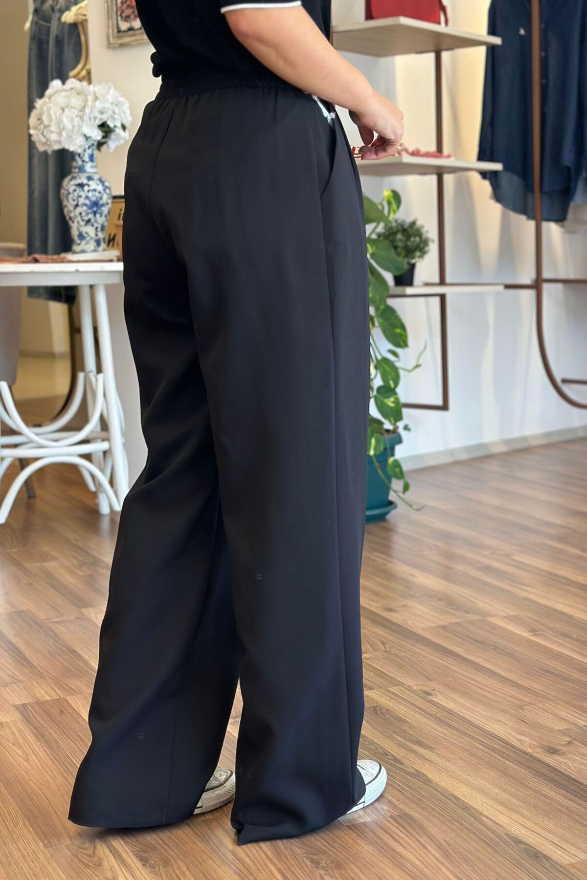 Bu siyah palazzo pantolon, beli lastikli tasarımıyla rahat bir kullanım sunuyor. Kırışmayan kumaşı sayesinde her zaman şık ve düzgün bir görünüm elde edebilirsin. Hem günlük kullanıma hem de özel günlerde tercih edebileceğin bir parça.