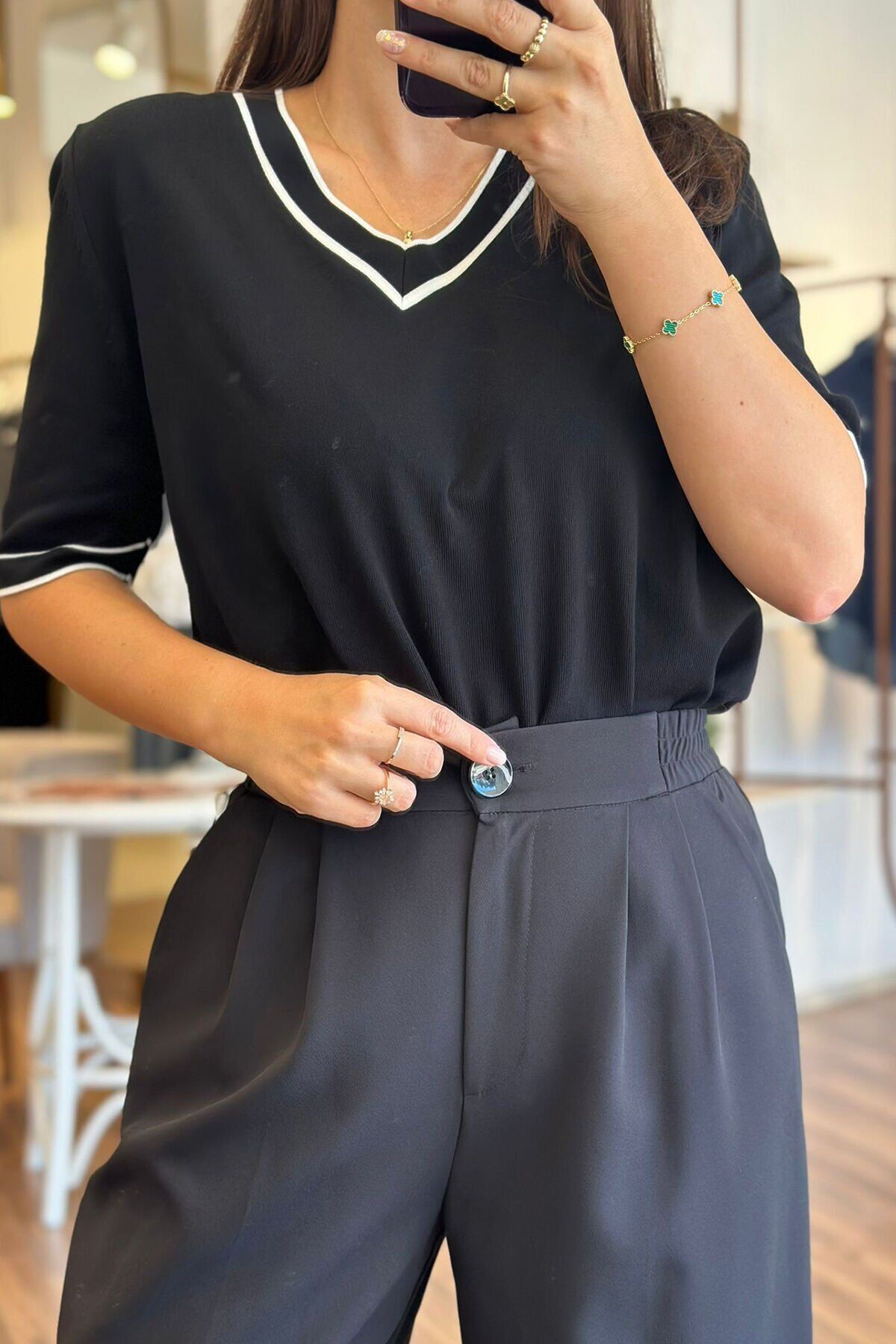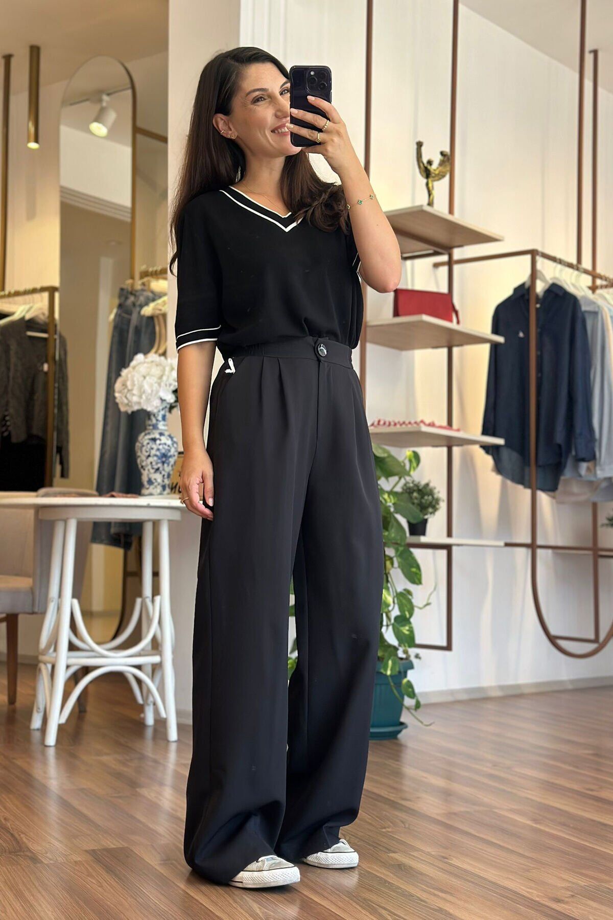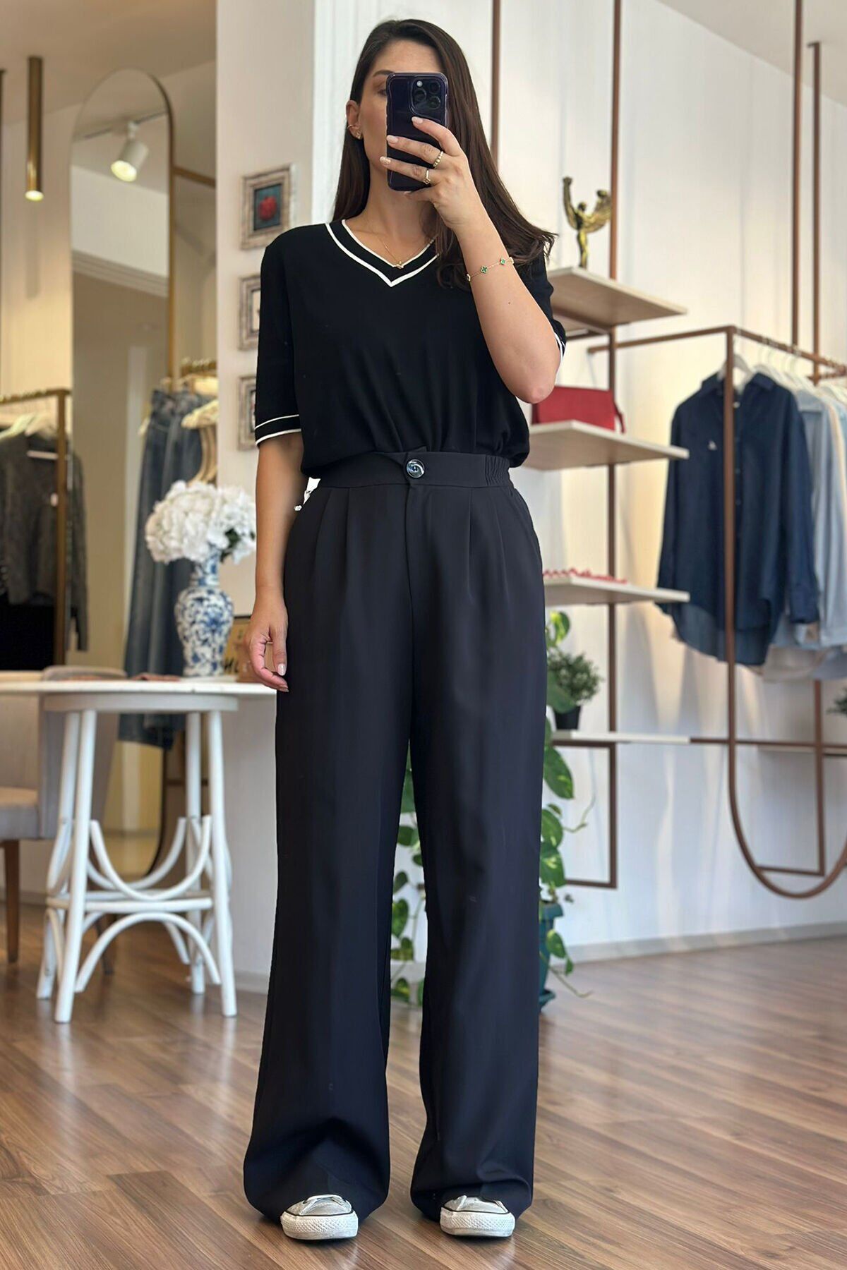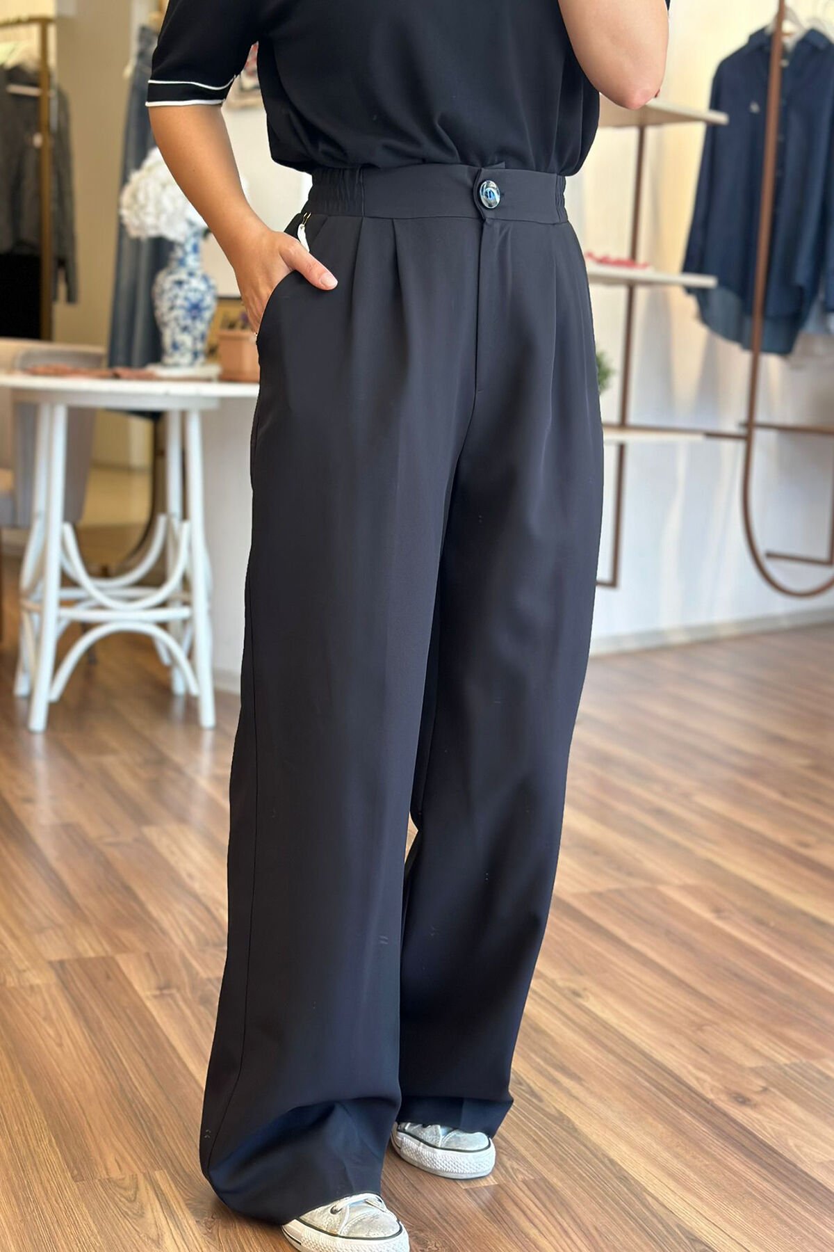 Bu siyah palazzo pantolon, beli lastikli tasarımıyla rahat bir kullanım sunuyor. Kırışmayan kumaşı sayesinde her zaman şık ve düzgün bir görünüm elde edebilirsin. Hem günlük kullanıma hem de özel günlerde tercih edebileceğin bir parça.