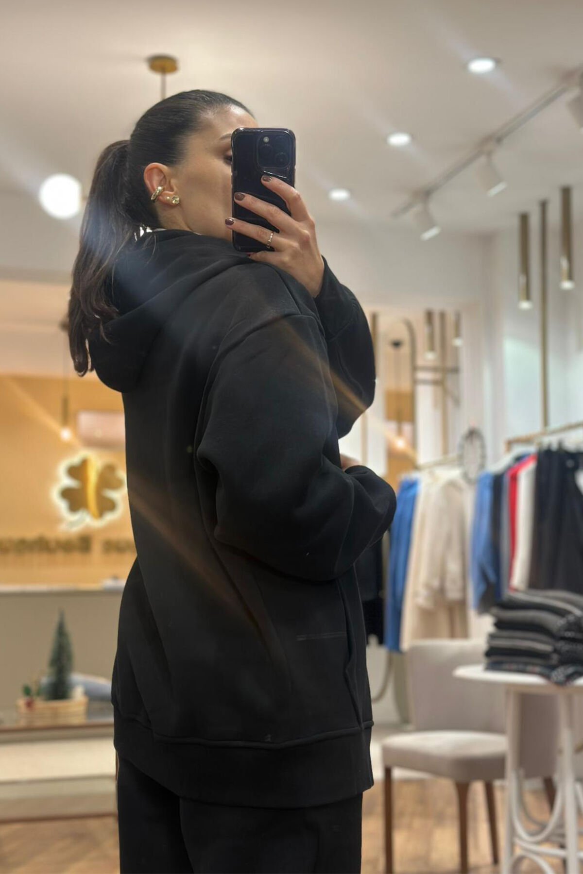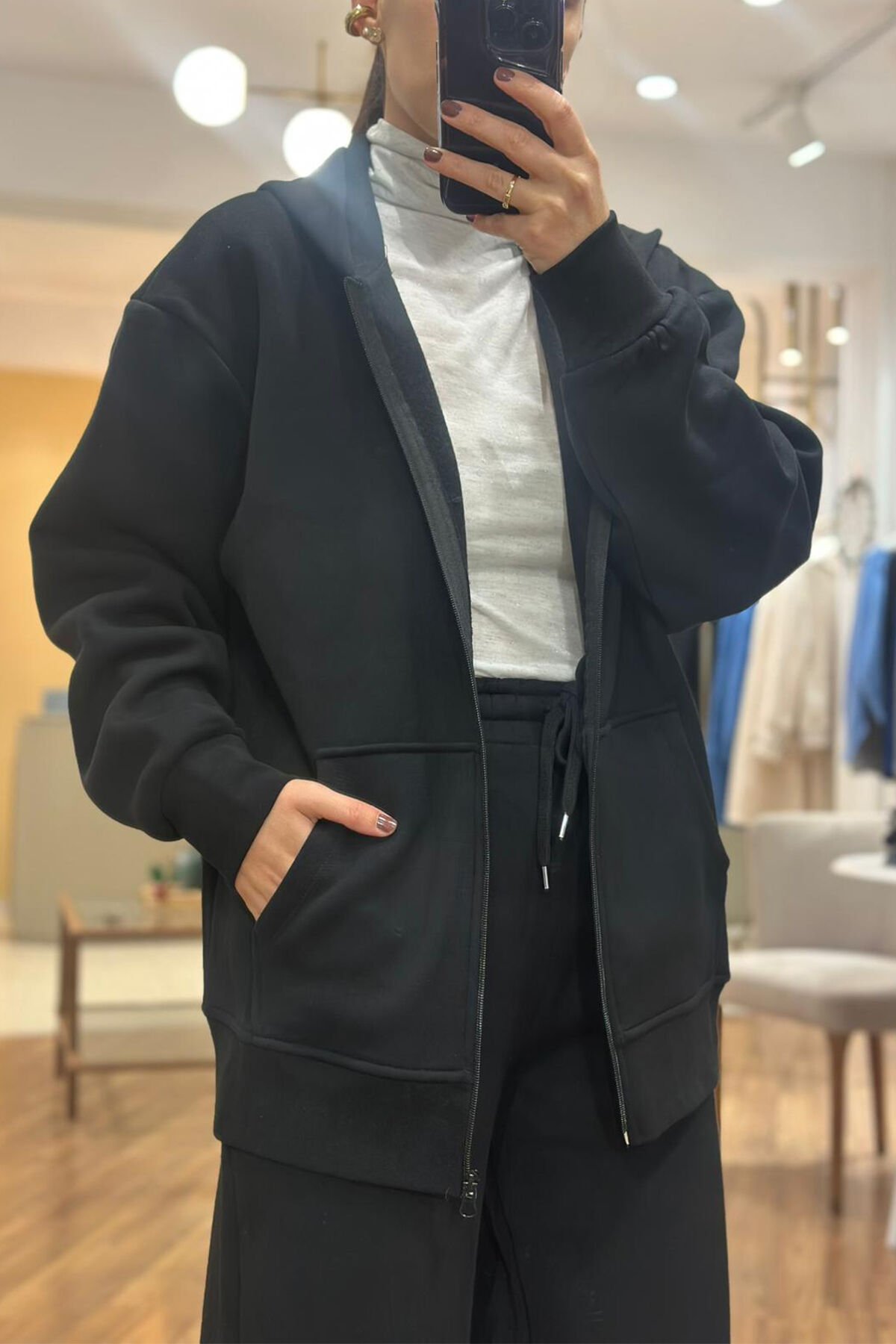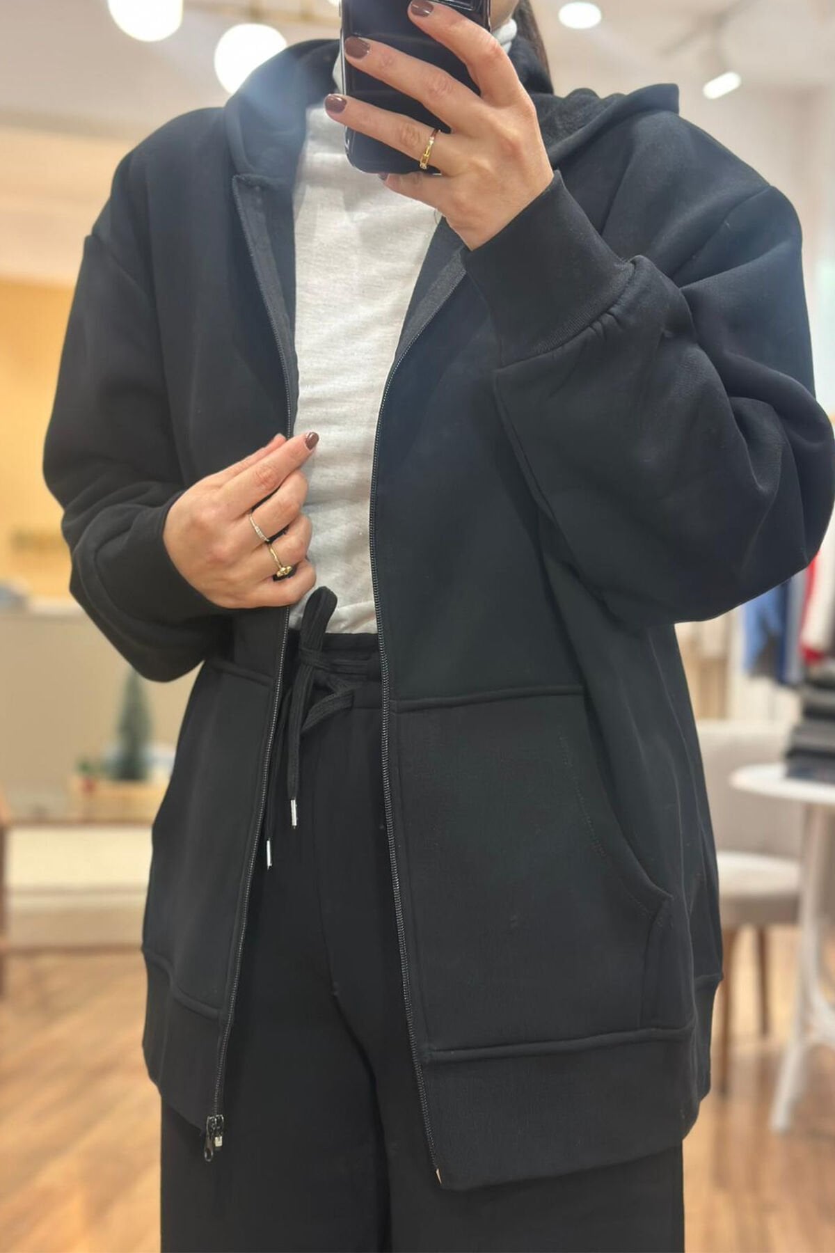 Siyah kapüşonlu fermuarlı pamuklu sweatshirt, rahatlığı ve şıklığı bir arada sunar. Yumuşak pamuklu dokusu sayesinde gün boyu konfor sağlar. Fermuar detayı pratik kullanım imkanı yaratırken, sıcak tutan iç yüzeyi soğuk havalarda ideal seçimdir. Spor ve günlük kombinlerde fark yaratır.