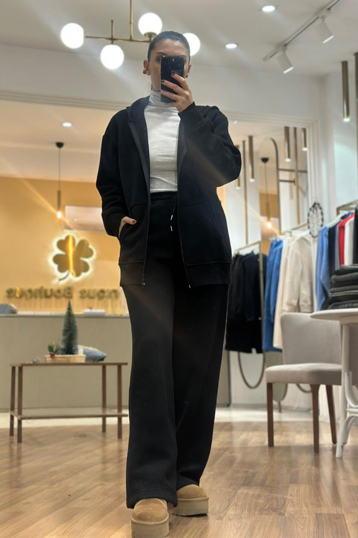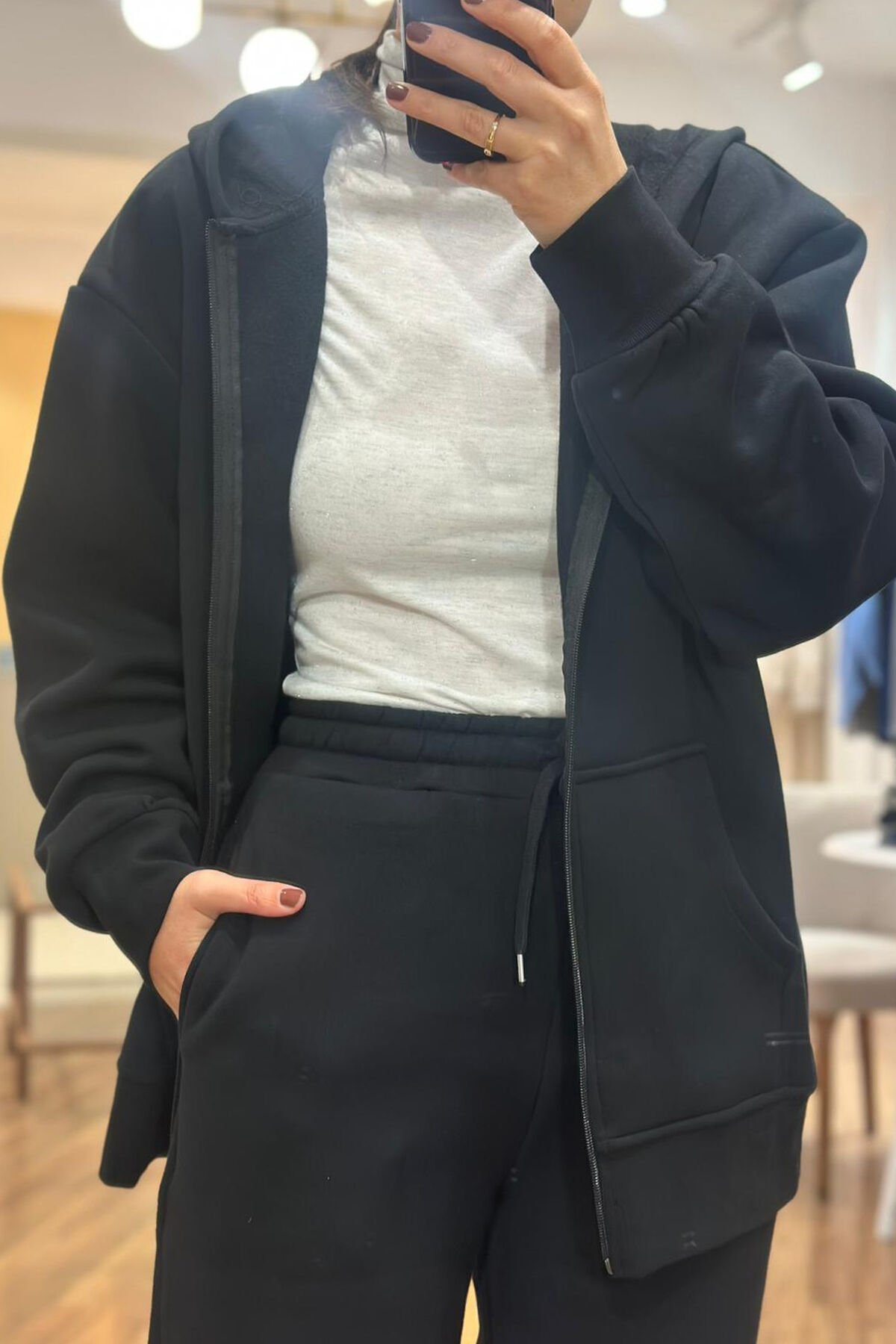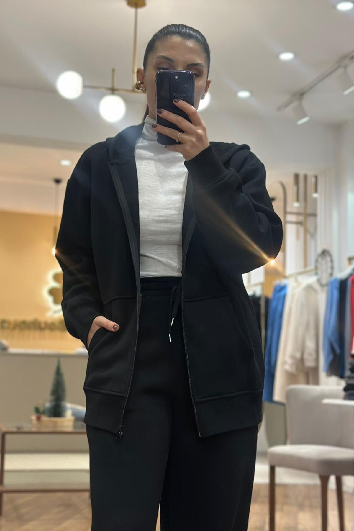 Siyah kapüşonlu fermuarlı pamuklu sweatshirt, rahatlığı ve şıklığı bir arada sunar. Yumuşak pamuklu dokusu sayesinde gün boyu konfor sağlar. Fermuar detayı pratik kullanım imkanı yaratırken, sıcak tutan iç yüzeyi soğuk havalarda ideal seçimdir. Spor ve günlük kombinlerde fark yaratır.