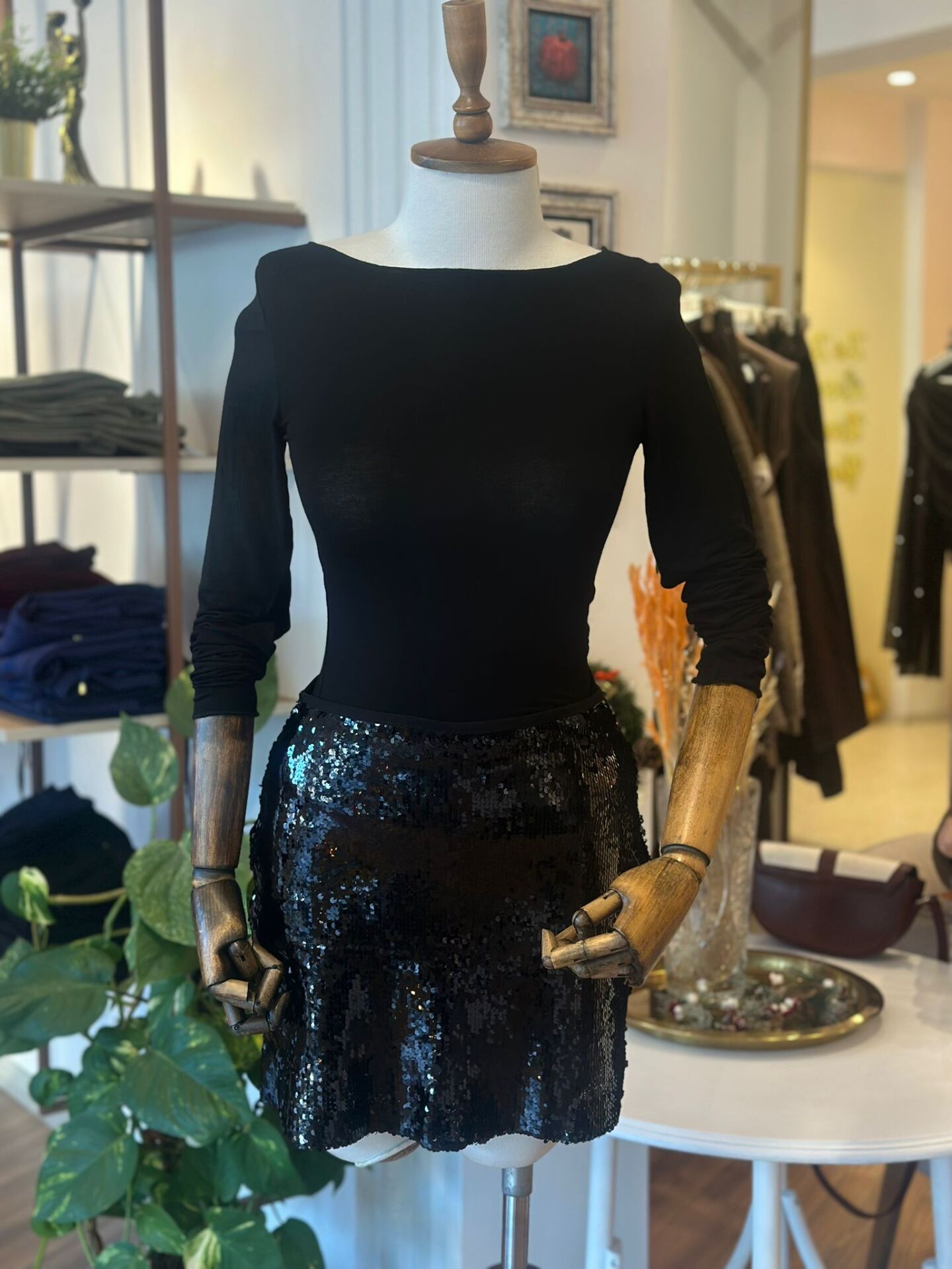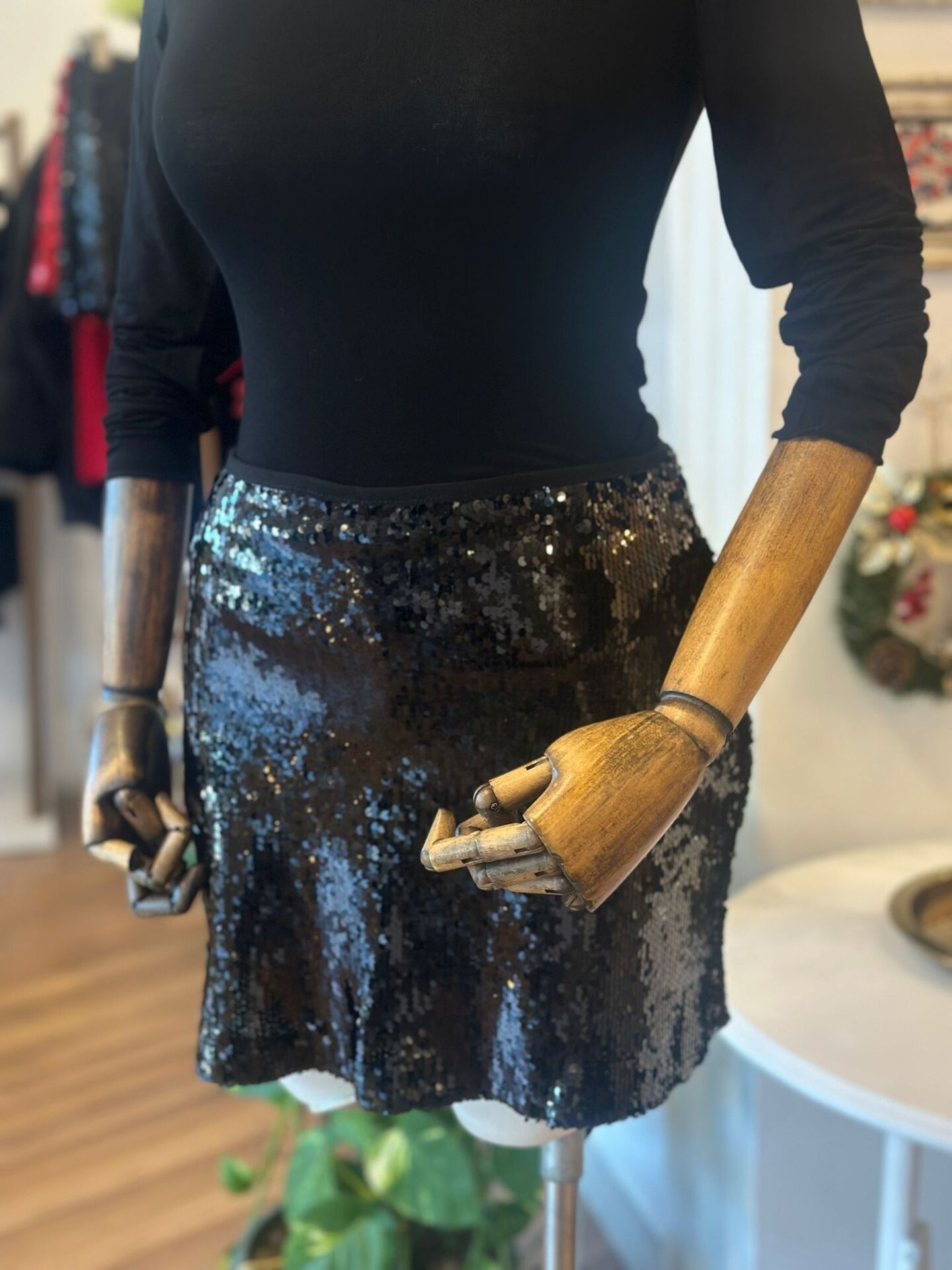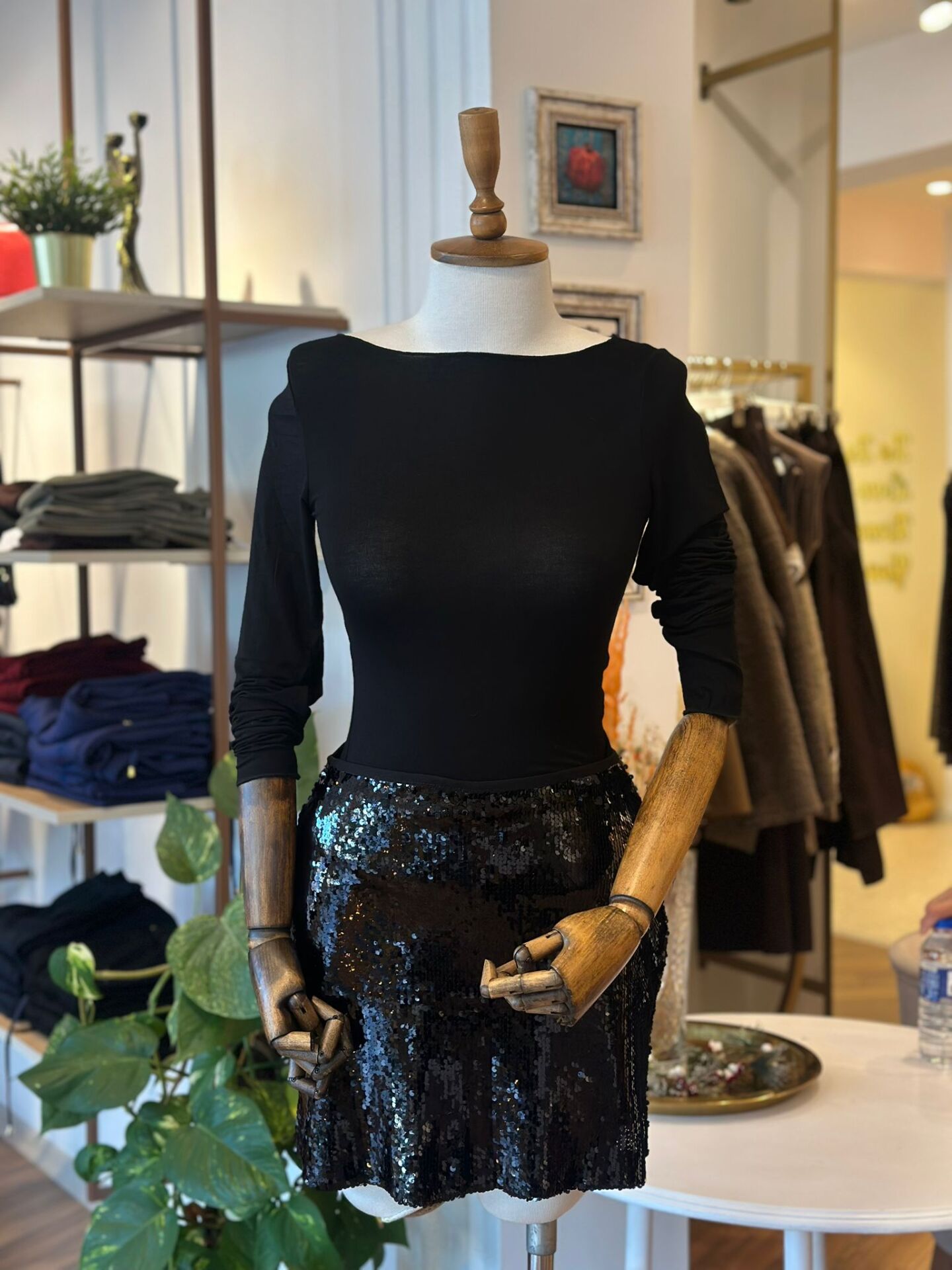 Gece şıklığının favorisi olmaya aday bu siyah pullu etek ,yoğun parlak dokusu ve modern kesimiyle göz alıcı bir stil sunuyor. Hem şık bluzlarla hem de basic üstlerle kolayca kombinlenebilir.