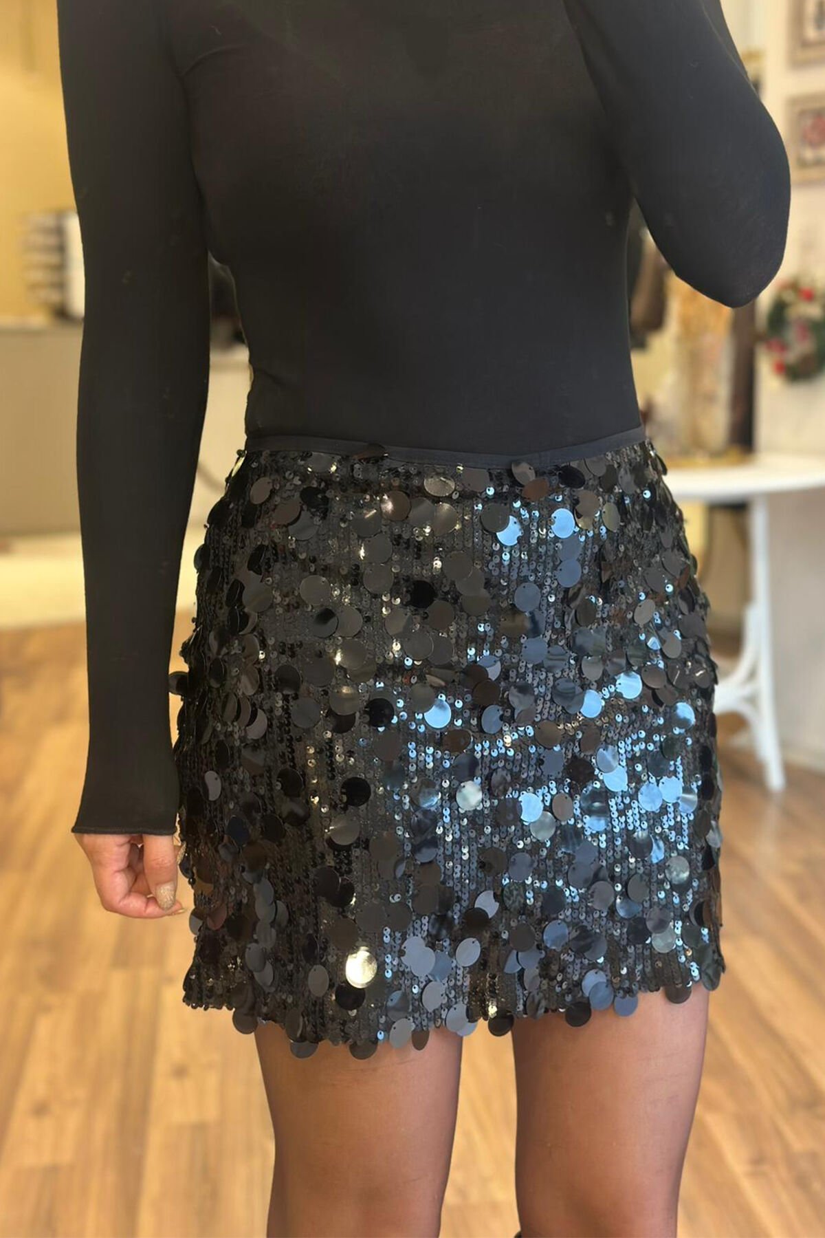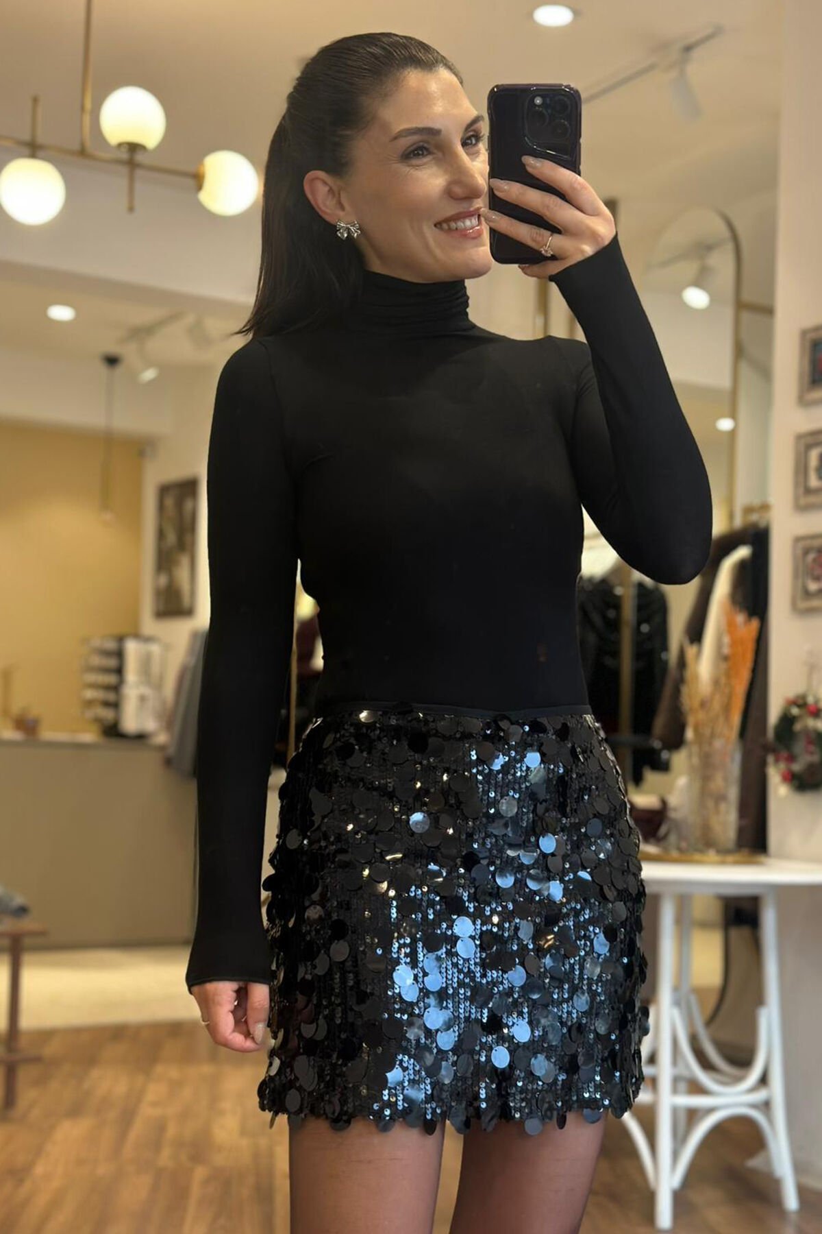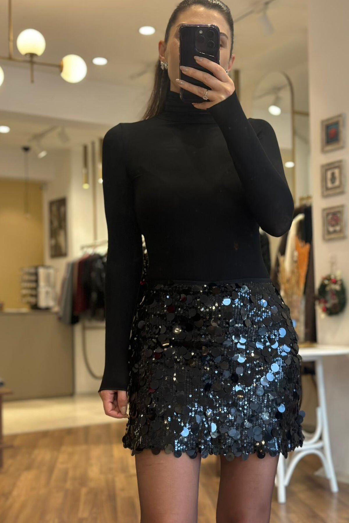 Gece şıklığının favorisi olmaya aday bu siyah pullu etek ,yoğun parlak dokusu ve modern kesimiyle göz alıcı bir stil sunuyor. Hem şık bluzlarla hem de basic üstlerle kolayca kombinlenebilir.