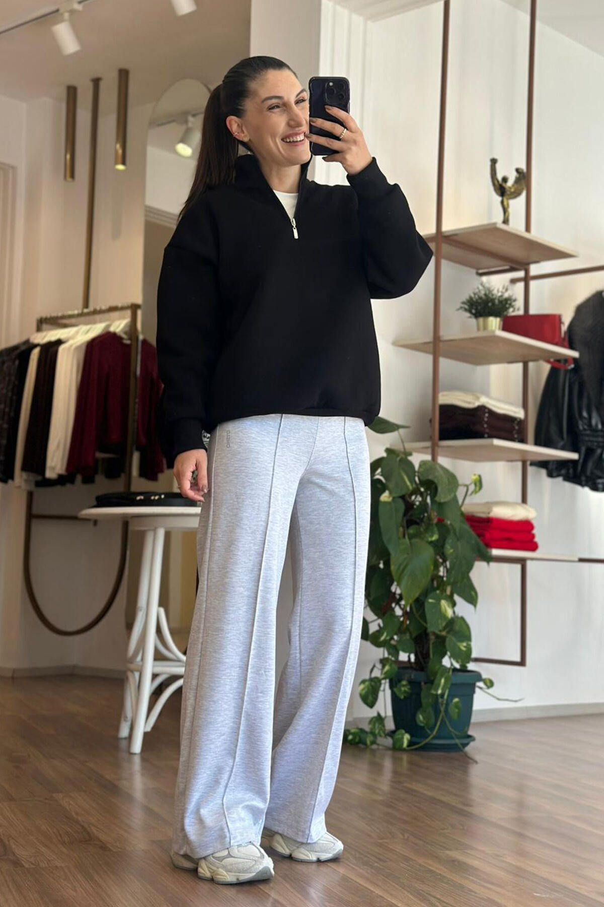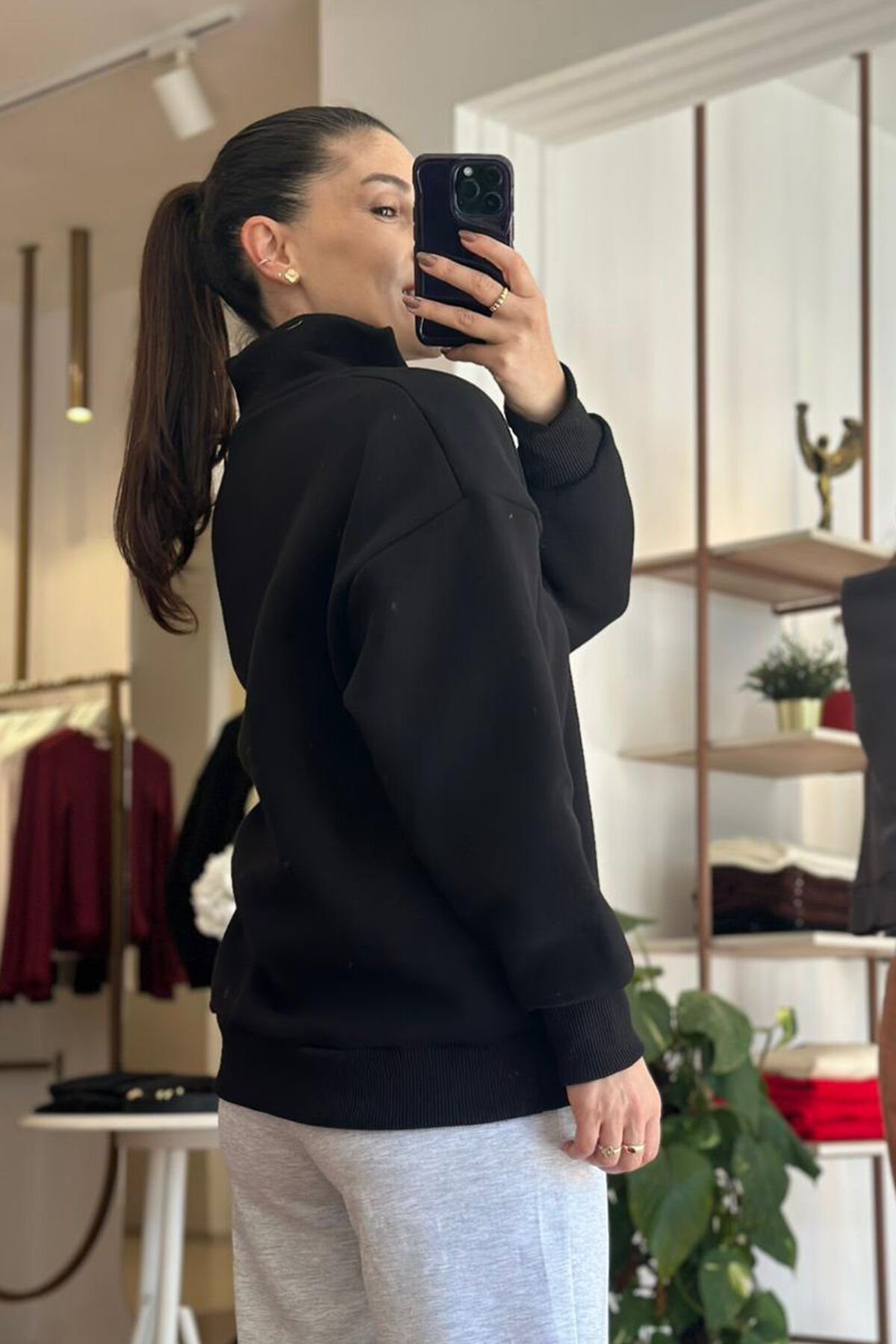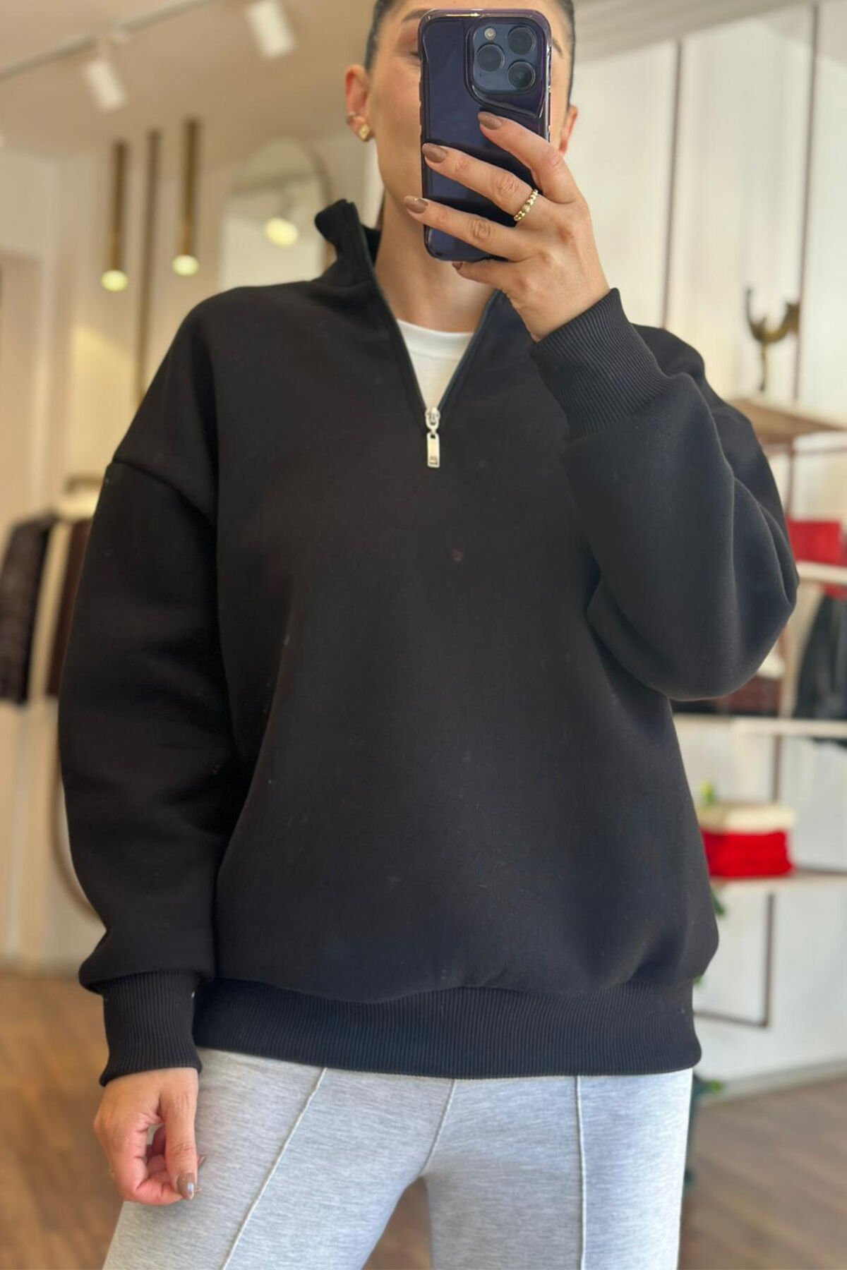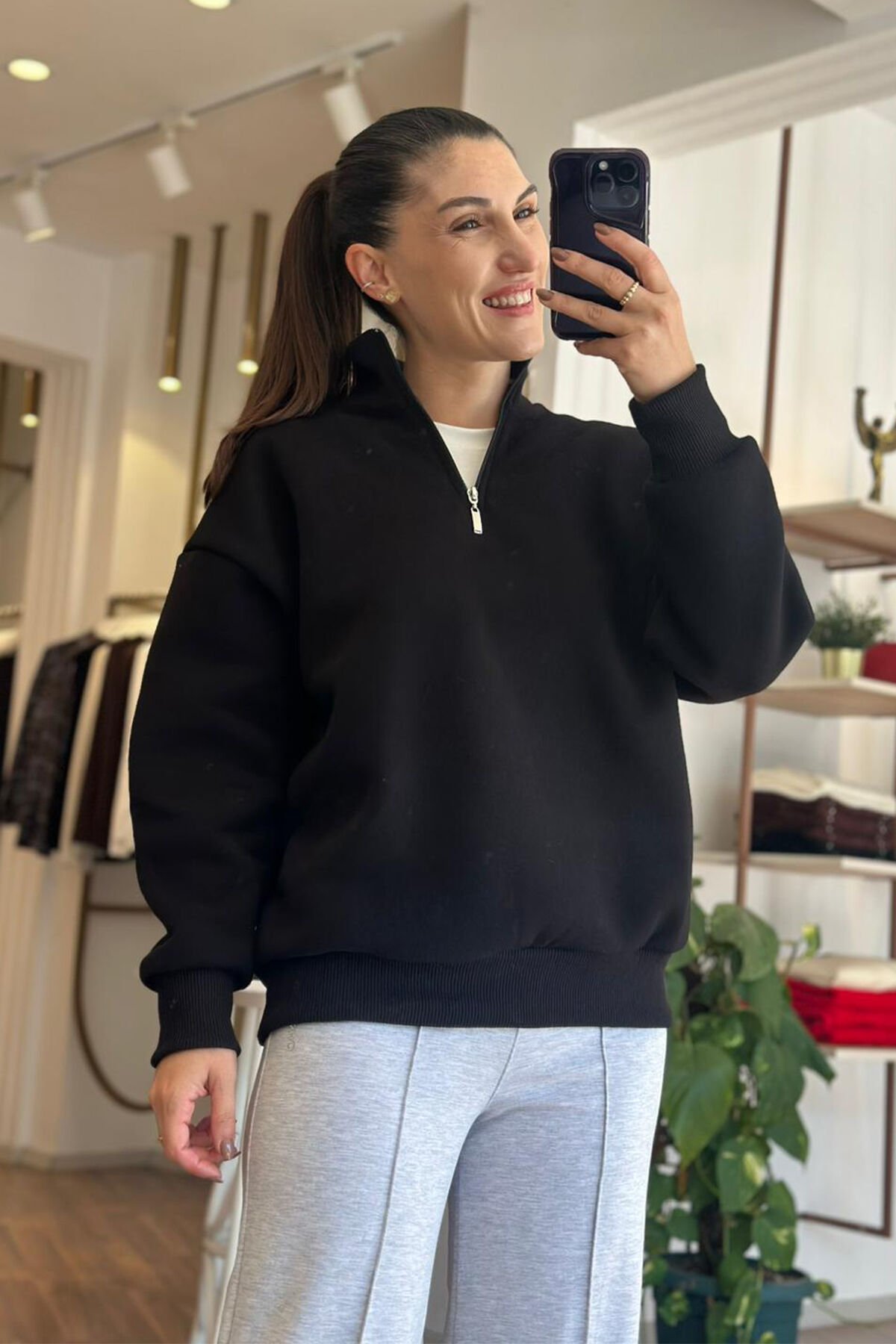 Siyah yarı fermuar kapamalı içi şardonlu pamuklu sweatshirt, rahatlığı ve şıklığı bir arada sunar. Yumuşak pamuklu dokusu sayesinde gün boyu konfor sağlar. Fermuar detayı pratik kullanım imkanı yaratırken, sıcak tutan iç yüzeyi soğuk havalarda ideal seçimdir. Spor ve günlük kombinlerde fark yaratır.