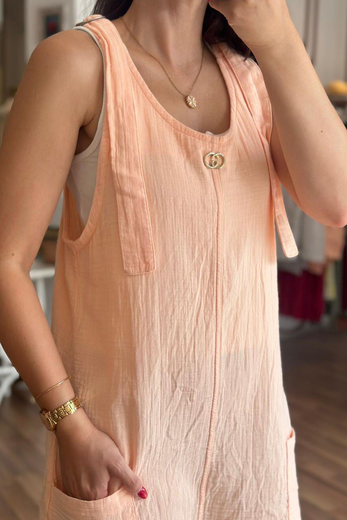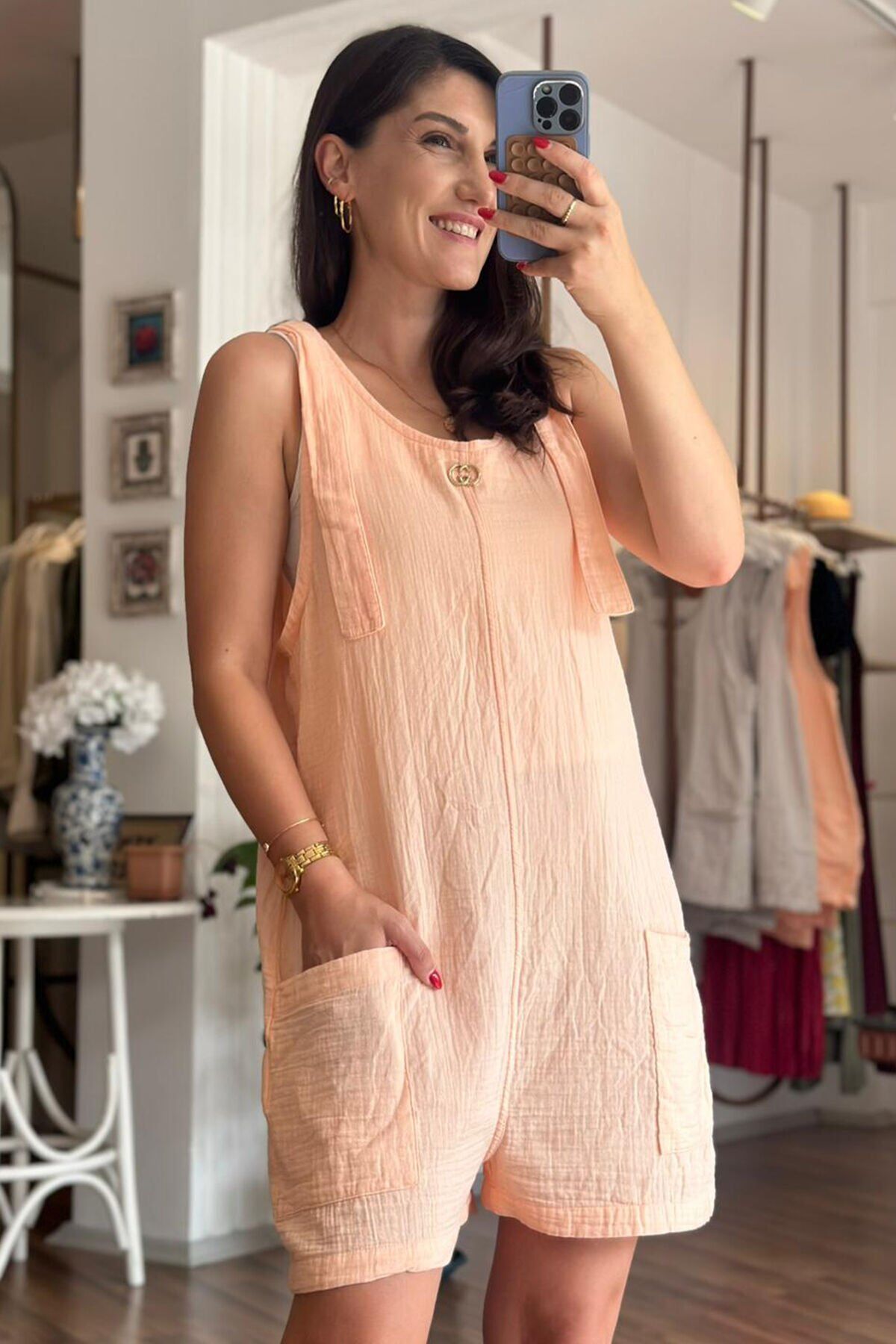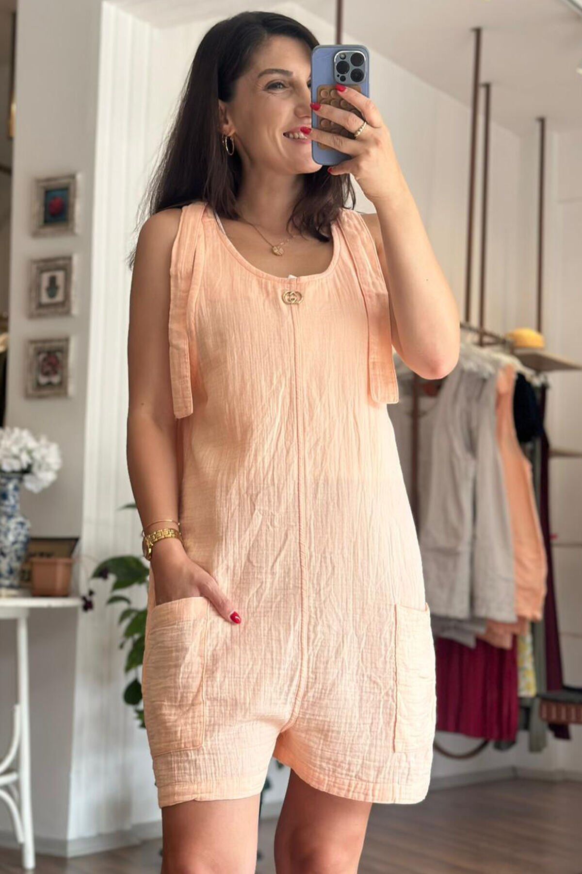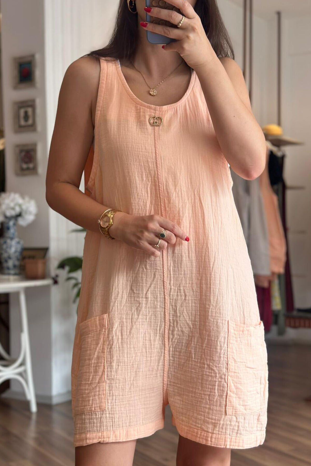 Bu hafif ve nefes alabilir müslin kumaştan yapılmış şortlu tulum, yaz aylarında rahatlık ve şıklığı bir arada sunar. Sıcak havalarda terletmeyen özelliği ile her anınızda konforu hissedin. Özgün tasarımıyla her ortama uyum sağlayacak olan bu tulum, gardırobunuzun vazgeçilmezi olmaya aday.