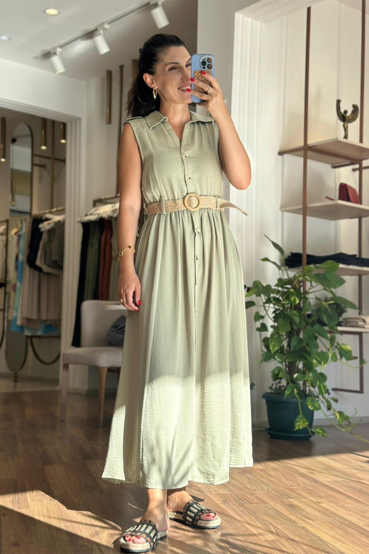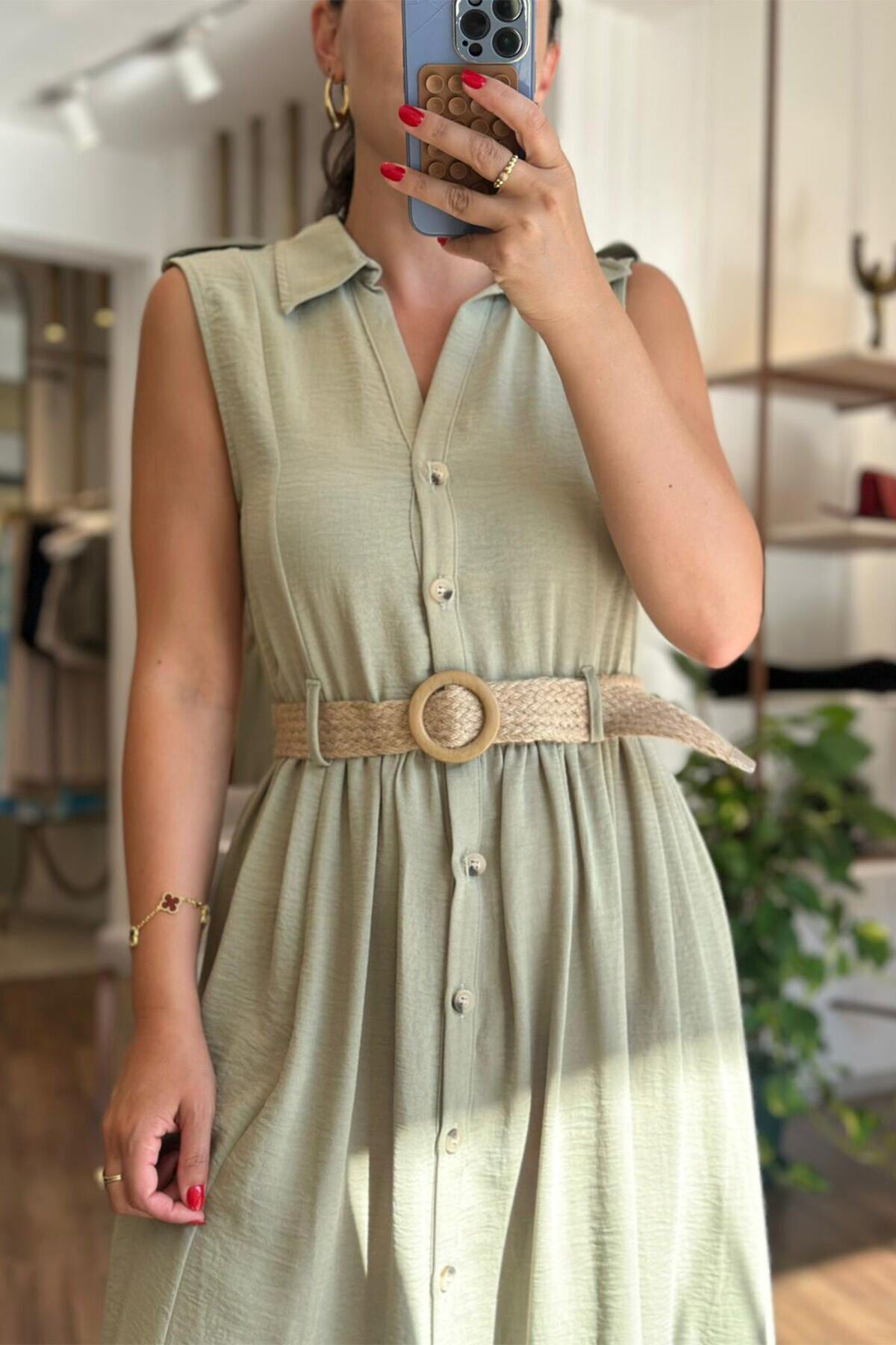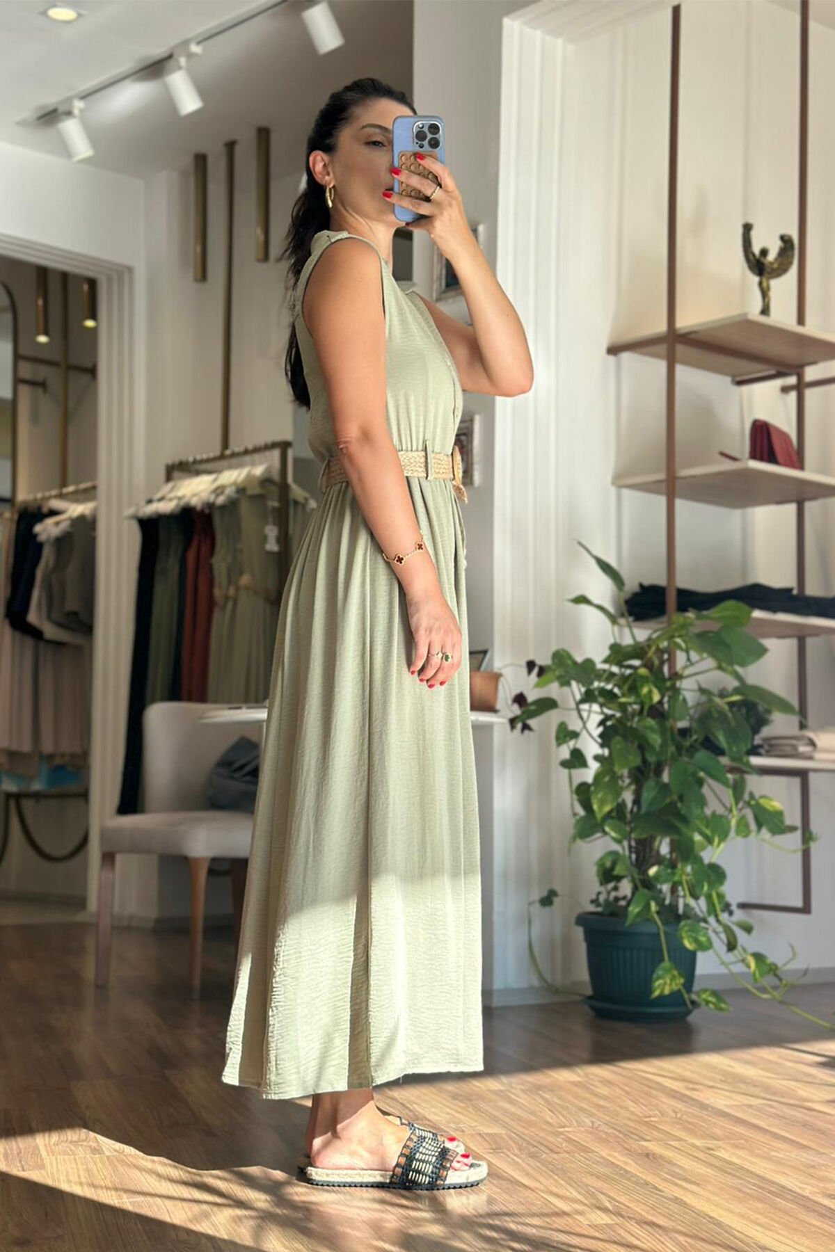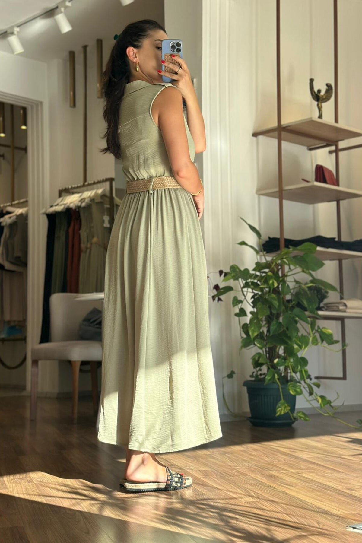 Bu keten elbise, yeşil düğmeleri ve kemer detayıyla şıklığı ve rahatlığı bir arada sunar. Hasır kemerli, nefes alan kumaşıyla her mevsimde kullanımı rahattır. Kusursuz bir görünüm için ideal bir seçimdir.